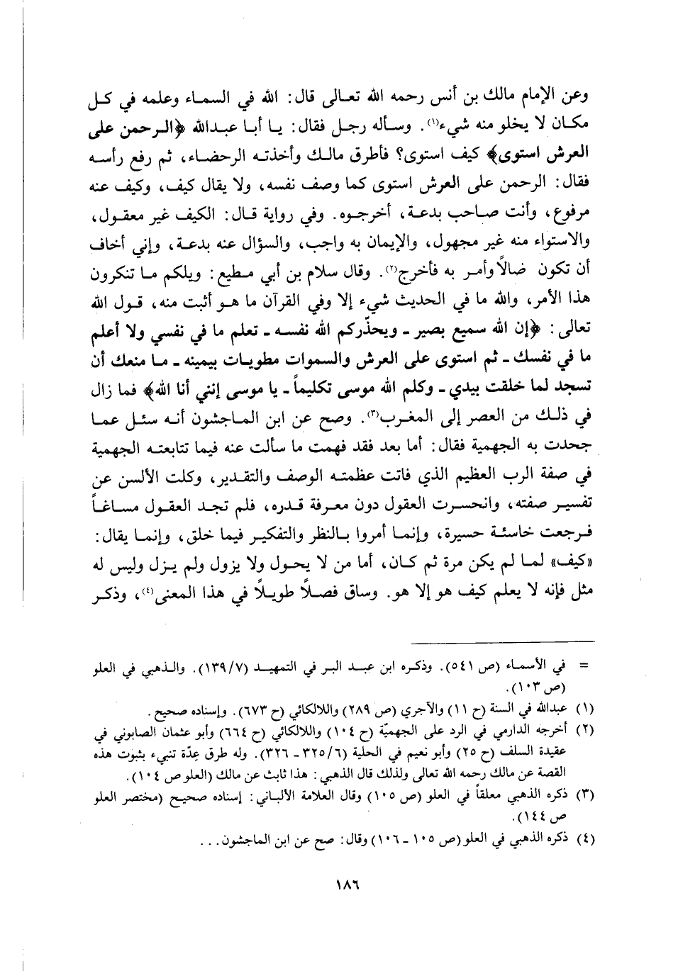 2 أخرجه الدارمي في الرد على الجهمية "ح104" واللالكائي "ح664" وأبو عثمان الصابوني في عقيدة السلف "ح25" وأبو نعيم في الحلية "6/ 325-326". وله طرق عدة تنبئ بثبوت هذه القصة عن مالك رحمه الله تعالى ولذلك قال الذهبي: هذا ثابت عن مالك "العلو ص104".