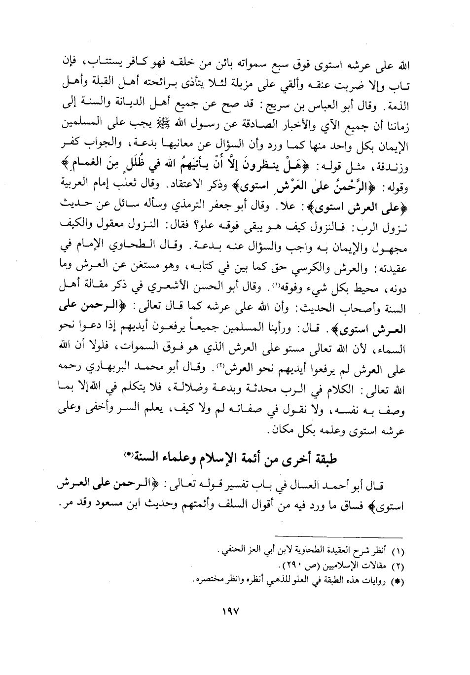 اللَّهَ عَلَى عَرْشِهِ اسْتَوَى فوق سبع سمواته بَائِنٌ مِنْ خَلْقِهِ فَهُوَ كَافِرٌ يُسْتَتَابُ, فَإِنْ تَابَ وَإِلَّا ضُرِبَتْ عُنُقُهُ وَأُلْقِيَ عَلَى مَزْبَلَةٍ لِئَلَّا يَتَأَذَّى بِرَائِحَتِهِ أَهْلُ الْقِبْلَةِ وَأَهْلُ الذِّمَّةِ. وَقَالَ أَبُو الْعَبَّاسِ بْنُ سُرَيْجٍ: قَدْ صَحَّ عَنْ جَمِيعِ أَهْلِ الدِّيَانَةِ وَالسُّنَّةِ إِلَى زَمَانِنَا أَنَّ جَمِيعَ الْآيِ وَالْأَخْبَارِ الصَّادِقَةِ عَنْ رَسُولِ اللَّهِ -صَلَّى اللَّهُ عَلَيْهِ وَسَلَّمَ- يَجِبُ عَلَى الْمُسْلِمِينَ الْإِيمَانُ بِكُلِّ وَاحِدٍ مِنْهَا كَمَا وَرَدَ وَأَنَّ السُّؤَالَ عَنْ مَعَانِيهَا بِدْعَةٌ, وَالْجَوَابَ كُفْرٌ وَزَنْدَقَةٌ مِثْلُ قَوْلِهِ: {هَلْ يَنْظُرُونَ إِلَّا أَنْ يَأْتِيَهُمُ اللَّهُ فِي ظُلَلٍ مِنَ الْغَمَامِ} وَقَوْلِهِ: {الرَّحْمَنُ عَلَى الْعَرْشِ اسْتَوَى} وَذَكَرَ الِاعْتِقَادَ وَقَالَ ثَعْلَبٌ إِمَامُ الْعَرَبِيَّةِ {عَلَى الْعَرْشِ اسْتَوَى} : عَلَا. وَقَالَ أَبُو جَعْفَرٍ التِّرْمِذِيُّ وَسَأَلَهُ سَائِلٌ عَنْ حَدِيثِ نُزُولِ الرَّبِّ: فَالنُّزُولُ كَيْفَ هُوَ يَبْقَى فَوْقَهُ عُلُوٌّ؟ فَقَالَ: النُّزُولُ مَعْقُولٌ وَالْكَيْفُ مَجْهُولٌ وَالْإِيمَانُ بِهِ وَاجِبٌ وَالسُّؤَالُ عَنْهُ بِدْعَةٌ. وَقَالَ الطَّحَاوِيُّ الْإِمَامُ فِي عَقِيدَتِهِ: وَالْعَرْشُ وَالْكُرْسِيُّ حَقٌّ كَمَا بَيَّنَ فِي كِتَابِهِ, وَهُوَ مُسْتَغْنٍ عَنِ الْعَرْشِ وَمَا دُونَهُ مُحِيطٌ بِكُلِّ شَيْءٍ وَفَوْقَهُ1. وَقَالَ أَبُو الْحَسَنِ الْأَشْعَرِيُّ فِي ذِكْرِ مَقَالَةِ أَهْلِ السُّنَّةِ وَأَصْحَابِ الْحَدِيثِ: وَأَنَّ اللَّهَ عَلَى عَرْشِهِ كَمَا قَالَ تَعَالَى: {الرَّحْمَنُ عَلَى الْعَرْشِ اسْتَوَى} . قَالَ: وَرَأَيْنَا الْمُسْلِمِينَ جَمِيعًا يَرْفَعُونَ أَيْدِيَهُمْ إذا دعوا نحوالسماء؛ لِأَنَّ اللَّهَ تَعَالَى مُسْتَوٍ عَلَى الْعَرْشِ الَّذِي هُوَ فَوْقَ السَّمَاوَاتِ , فَلَوْلَا أَنَّ اللَّهَ عَلَى الْعَرْشِ لَمْ يرفعوا أيديهم نحوالعرش2. وَقَالَ أَبُو مُحَمَّدٍ الْبَرْبَهَارِيُّ رَحِمَهُ اللَّهُ تَعَالَى: الْكَلَامُ فِي الرَّبِّ مُحْدَثَةٌ وَبِدْعَةٌ وَضَلَالَةٌ, فَلَا يُتَكَلَّمُ فِي اللَّهِ إِلَّا بِمَا وَصَفَ بِهِ نَفْسَهُ وَلَا نَقُولُ فِي صِفَاتِهِ لِمَ وَلَا كَيْفَ, يَعْلَمُ السِّرَّ وَأَخْفَى وَعَلَى عَرْشِهِ اسْتَوَى وَعِلْمُهُ بِكُلِّ مَكَانٍ.