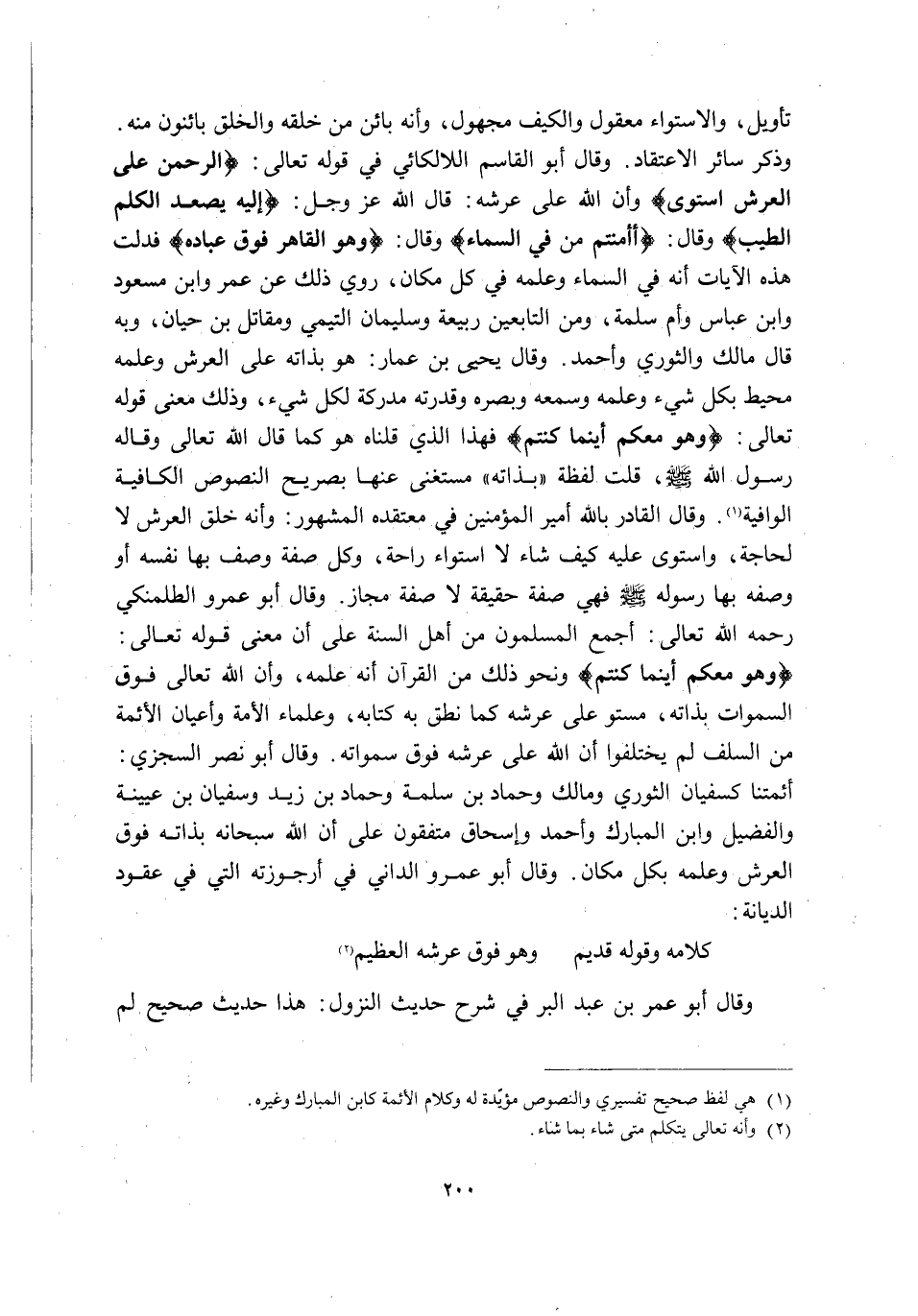 تَأْوِيلٍ وَالِاسْتِوَاءُ مَعْقُولٌ وَالْكَيْفُ مَجْهُولٌ, وَأَنَّهُ بَائِنٌ مِنْ خَلْقِهِ وَالْخَلْقُ بَائِنُونَ مِنْهُ. وَذَكَرَ سَائِرَ الِاعْتِقَادَ, وَقَالَ أَبُو الْقَاسِمِ اللَّالَكَائِيُّ فِي قَوْلِهِ تَعَالَى: {الرَّحْمَنُ عَلَى الْعَرْشِ اسْتَوَى} وَأَنَّ اللَّهَ عَلَى عَرْشِهِ, قَالَ اللَّهُ عَزَّ وَجَلَّ: {إِلَيْهِ يَصْعَدُ الْكَلِمُ الطَّيِّبُ} وَقَالَ: {أَأَمِنْتُمْ مَنْ فِي السَّمَاءِ} وَقَالَ: {وَهُوَ الْقَاهِرُ فَوْقَ عِبَادِهِ} فَدَلَّتْ هَذِهِ الْآيَاتُ أَنَّهُ فِي السَّمَاءِ وَعِلْمُهُ فِي كُلِّ مَكَانٍ, رُوِيَ ذَلِكَ عَنْ عُمَرَ وَابْنِ مَسْعُودٍ وَابْنِ عَبَّاسٍ وَأُمِّ سَلَمَةَ, وَمِنَ التَّابِعِينَ رَبِيعَةَ وَسُلَيْمَانَ التَّيْمِيِّ وَمُقَاتِلِ بْنِ حَيَّانَ وَبِهِ قَالَ: مَالِكٌ وَالثَّوْرِيُّ وَأَحْمَدُ. وَقَالَ يَحْيَى بْنُ عَمَّارٍ: هُوَ بِذَاتِهِ عَلَى الْعَرْشِ وَعِلْمُهُ مُحِيطٌ بِكُلِّ شَيْءٍ وَعِلْمُهُ وَسَمْعُهُ وَبَصَرُهُ وَقُدْرَتُهُ مُدْرِكَةٌ لِكُلِّ شَيْءٍ, وَذَلِكَ مَعْنَى قَوْلِهِ تَعَالَى: {وَهُوَ مَعَكُمْ أَيْنَ مَا كُنْتُمْ} فَهَذَا الذي قلناه هو كَمَا قَالَ اللَّهُ تَعَالَى وَقَالَهُ رَسُولُ اللَّهِ -صَلَّى اللَّهُ عَلَيْهِ وَسَلَّمَ- قُلْتُ: لفظة "بذاته" مستغن عَنْهَا بِصَرِيحِ النُّصُوصِ الْكَافِيَةِ الْوَافِيَةِ1. وَقَالَ الْقَادِرُ بِاللَّهِ أَمِيرُ الْمُؤْمِنِينَ فِي مُعْتَقَدِهِ الْمَشْهُورِ: وَأَنَّهُ خَلَقَ الْعَرْشَ لَا لِحَاجَةٍ, وَاسْتَوَى عَلَيْهِ كَيْفَ شَاءَ لَا اسْتِوَاءَ رَاحَةٍ, وَكُلُّ صِفَةٍ وَصَفَ بِهَا نَفْسَهُ أَوْ صفه بِهَا رَسُولُهُ -صَلَّى اللَّهُ عَلَيْهِ وَسَلَّمَ- فَهِيَ صِفَةٌ حَقِيقَةٌ لَا صِفَةَ مَجَازٍ. وَقَالَ أَبُو عَمْرٍو الطَّلَمَنْكِيُّ رَحِمَهُ اللَّهُ تَعَالَى: أَجْمَعَ الْمُسْلِمُونَ مِنْ أَهْلِ السُّنَّةِ عَلَى أَنَّ مَعْنَى قَوْلِهِ تَعَالَى: {وَهُوَ مَعَكُمْ أَيْنَ مَا كُنْتُمْ} وَنَحْوَ ذَلِكَ مِنَ الْقُرْآنِ أَنَّهُ عِلْمُهُ, وَأَنَّ اللَّهَ تَعَالَى فَوْقَ السَّمَاوَاتِ بِذَاتِهِ مُسْتَوٍ عَلَى عَرْشِهِ, كَمَا نَطَقَ بِهِ كِتَابُهُ وَعُلَمَاءُ الْأُمَّةِ وَأَعْيَانُ الْأَئِمَّةِ مِنَ السَّلَفِ لَمْ يَخْتَلِفُوا أَنَّ اللَّهَ عَلَى عرشه فوق سمواته. وَقَالَ أَبُو نَصْرٍ السَّجْزِيُّ: أَئِمَّتُنَا كَسُفْيَانَ الثَّوْرِيِّ وَمَالِكٍ وَحَمَّادِ بْنِ سَلَمَةَ وَحَمَّادِ بْنِ زَيْدٍ وَسُفْيَانَ بْنِ عُيَيْنَةَ وَالْفُضَيْلِ وَابْنِ الْمُبَارَكِ وَأَحْمَدَ وَإِسْحَاقَ مُتَّفِقُونَ عَلَى أَنَّ اللَّهَ سُبْحَانَهُ بِذَاتِهِ فَوْقَ الْعَرْشِ وَعِلْمُهُ بِكُلِّ مَكَانٍ. وَقَالَ أَبُو عَمْرٍو الدَّانِي فِي أُرْجُوزَتِهِ الَّتِي فِي عُقُودِ الدِّيَانَةِ: