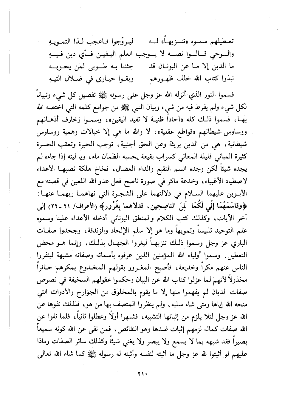 فَسَمَّوُا النُّورَ الَّذِي أَنْزَلَهُ اللَّهُ عَزَّ وَجَلَّ عَلَى رَسُولِهِ -صَلَّى اللَّهُ عَلَيْهِ وَسَلَّمَ- تَفْصِيلَ كُلِّ شَيْءٍ وَتِبْيَانًا لِكُلِّ شَيْءٍ وَلَمْ يُفَرِّطْ فِيهِ مِنْ شَيْءٍ, وَبَيَانُ النَّبِيِّ -صَلَّى اللَّهُ عَلَيْهِ وَسَلَّمَ- مِنْ جَوَامِعِ كَلِمِهِ الَّتِي اخْتَصَّهُ اللَّهُ بِهَا فَسَمَّوْا ذَلِكَ كُلَّهُ "آحَادًا ظَنِّيَّةً لَا تُفِيدُ الْيَقِينَ"، وَسَمَّوْا زَخَارِفَ أَذْهَانِهِمْ وَوَسَاوِسَ شَيْطَانِهِمْ "قَوَاطِعَ عَقْلِيَّةً"، لَا وَاللَّهِ مَا هِيَ إِلَّا خَيَالَاتٌ وَهْمِيَّةٌ وَوَسَاوِسُ شَيْطَانِيَّةٌ, هِيَ مِنَ الدِّينِ بَرِيئَةٌ وَعَنِ الْحَقِّ أَجْنَبِيَّةٌ, تُوجِبُ الْحَيْرَةَ وَتُعْقِبُ الْحَسْرَةَ كَثِيرَةُ الْمَبَانِي قَلِيلَةُ الْمَعَانِي كَسَرَابٍ بِقِيعَةٍ يَحْسَبُهُ الظَّمْآنُ مَاءً, وَيَا لَيْتَهُ إِذَا جَاءَهُ لَمْ يَجِدْهُ شَيْئًا لَكِنْ وَجَدَهُ السُّمَّ النَّقِيعَ وَالدَّاءَ الْعُضَالَ, فِخَاخَ هَلَكَةٍ نَصَبَهَا الْأَعْدَاءُ لِاصْطِيَادِ الْأَغْبِيَاءِ, وَخُدْعَةَ مَاكِرٍ فِي صُورَةِ نَاصِحٍ فِعْلَ عَدُوِّ اللَّهِ اللَّعِينِ فِي قِصَّتِهِ مَعَ الْأَبَوَيْنِ عَلَيْهِمَا السَّلَامُ فِي دَلَالَتِهِمَا عَلَى الشَّجَرَةِ الَّتِي نَهَاهُمَا رَبُّهُمَا عَنْهَا: {وَقَاسَمَهُمَا إِنِّي لَكُمَا لَمِنَ النَّاصِحِينَ، فَدَلَّاهُمَا بِغُرُورٍ} [الْأَعْرَافِ: 21-22] إِلَى آخِرِ الْآيَاتِ. وَكَذَلِكَ كُتُبُ الْكَلَامِ وَالْمَنْطِقِ الْيُونَانِيِّ أَدْخَلَهُ الْأَعْدَاءُ عَلَيْنَا وَسَمَّوْهُ عِلْمَ التَّوْحِيدِ تَلْبِيسًا وَتَمْوِيهًا وَمَا هُوَ إِلَّا سُلَّمُ الْإِلْحَادِ وَالزَّنْدَقَةِ, وَجَحَدُوا صِفَاتِ الْبَارِي عَزَّ وَجَلَّ وَسَمَّوْا ذَلِكَ تَنْزِيهًا لِيُغْرُوا الْجُهَّالَ بِذَلِكَ, وَإِنَّمَا هُوَ مَحْضُ التَّعْطِيلِ. وَسَمَّوْا أَوْلِيَاءَ الْمُؤْمِنِينَ الَّذِينَ عَرَفُوهُ بِأَسْمَائِهِ وَصِفَاتِهِ مُشَبِّهَةً لِيُنَفِّرُوا النَّاسَ عَنْهُمْ مَكْرًا وَخَدِيعَةً فَأَصْبَحَ الْمَغْرُورُ بِقَوْلِهِمُ الْمَخْدُوعُ بِمَكْرِهِمْ حَائِرًا مَخْذُولًا لِأَنَّهُمْ لَمَّا عَزَلُوا كِتَابَ اللَّهِ عَنِ الْبَيَانِ وَحَكَّمُوا عُقُولَهُمُ السَّخِيفَةَ فِي نُصُوصِ صِفَاتِ الدَّيَّانِ لَمْ يَفْهَمُوا مِنْهَا إِلَّا مَا يَقُومُ بِالْمَخْلُوقِ مِنَ الْجَوَارِحِ وَالْأَدَوَاتِ الَّتِي مَنَحَهُ اللَّهُ إِيَّاهَا وَمَتَى شَاءَ سَلَبَهُ, وَلَمْ يَنْظُرُوا الْمُتَّصِفَ بِهَا مَنْ هُوَ, فَلِذَلِكَ نَفَوْهَا عَنِ اللَّهِ عَزَّ وَجَلَّ لِئَلَّا يَلْزَمَ مِنْ إِثْبَاتِهَا التَّشْبِيهُ فَشَبَّهُوا أَوَّلًا وَعَطَّلُوا ثَانِيًا, فَلَمَّا نَفَوْا عَنِ اللَّهِ صِفَاتِ كَمَالِهِ لَزِمَهُمْ إِثْبَاتُ ضِدِّهَا وَهُوَ النَّقَائِصُ, فَمَنْ نَفَى عَنِ اللَّهِ كَوْنَهُ سَمِيعًا بَصِيرًا فَقَدْ شَبَّهَهُ بِمَا لَا يَسْمَعُ وَلَا يُبْصِرُ وَلَا يُغْنِي شَيْئًا وَكَذَلِكَ سَائِرُ الصِّفَاتِ وَمَاذَا عَلَيْهِمْ لَوْ أَثْبَتُوا لِلَّهِ عَزَّ وَجَلَّ مَا أَثْبَتَهُ لِنَفْسِهِ وَأَثْبَتَهُ لَهُ رَسُولُهُ -صَلَّى اللَّهُ عَلَيْهِ وَسَلَّمَ- كَمَا شَاءَ اللَّهُ تَعَالَى