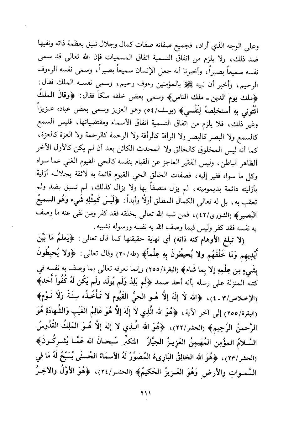 وَعَلَى الْوَجْهِ الَّذِي أَرَادَ, فَجَمِيعُ صِفَاتِهِ صِفَاتُ كَمَالٍ وَجَلَالٍ تَلِيقُ بِعَظَمَةِ ذَاتِهِ وَنَفْيُهَا ضِدُّ ذَلِكَ, وَلَا يَلْزَمُ مِنَ اتِّفَاقِ التَّسْمِيَةِ اتِّفَاقُ الْمُسَمَّيَاتِ فَإِنَّ اللَّهَ تَعَالَى قَدْ سَمَّى نَفْسَهُ سَمِيعًا بَصِيرًا, وَأَخْبَرَنَا أَنَّهُ جَعَلَ الْإِنْسَانَ سَمِيعًا بَصِيرًا, وَسَمَّى نَفْسَهُ الرَّءُوفَ الرَّحِيمَ, وَأَخْبَرَ أَنَّ نَبِيَّهُ -صَلَّى اللَّهُ عَلَيْهِ وَسَلَّمَ- بِالْمُؤْمِنِينَ رَءُوفٌ رَحِيمٌ, وَسَمَّى نَفْسَهُ الْمَلِكَ فَقَالَ: {مَالِكِ يَوْمِ الدِّينِ - مَلِكِ النَّاسِ} وَسَمَّى بَعْضَ خَلْقِهِ مَلِكًا فَقَالَ: {وَقَالَ الْمَلِكُ ائْتُونِي بِهِ أَسْتَخْلِصْهُ لِنَفْسِي} [يُوسُفَ: 54] وَهُوَ الْعَزِيزُ وَسَمَّى بَعْضَ عِبَادِهِ عَزِيزًا وَغَيْرَ ذَلِكَ, فَلَا يَلْزَمُ مِنَ اتِّفَاقِ التَّسْمِيَةِ اتِّفَاقُ الْأَسْمَاءِ وَمُقْتَضَيَاتِهَا, فَلَيْسَ السَّمْعُ كَالسَّمْعِ وَلَا الْبَصَرُ كَالْبَصَرِ وَلَا الرَّأْفَةُ كَالرَّأْفَةِ وَلَا الرَّحْمَةُ كَالرَّحْمَةِ وَلَا الْعِزَّةُ كَالْعِزَّةِ, كَمَا أَنَّهُ لَيْسَ الْمَخْلُوقُ كَالْخَالِقِ وَلَا الْمُحْدَثُ الْكَائِنُ بَعْدَ أَنْ لَمْ يَكُنْ كَالْأَوَّلِ الْآخِرِ الظَّاهِرِ الْبَاطِنِ, وَلَيْسَ الْفَقِيرُ الْعَاجِزُ عَنِ الْقِيَامِ بِنَفْسِهِ كَالْحَيِّ الْقَيُّومِ الْغَنِيِّ عَمَّا سِوَاهُ, وَكُلُّ مَا سِوَاهُ فَقِيرٌ إِلَيْهِ, فَصِفَاتُ الْخَالِقِ الْحَيِّ الْقَيُّومِ قَائِمَةٌ بِهِ لَائِقَةٌ بِجَلَالِهِ أَزَلِيَّةٌ بِأَزَلِيَّتِهِ دَائِمَةٌ بِدَيْمُومِيَّتِهِ, لَمْ يَزَلْ مُتَّصِفًا بِهَا وَلَا يَزَالُ كَذَلِكَ, لَمْ تُسْبَقْ بِضِدٍّ وَلَمْ تُعْقَبْ بِهِ بَلْ لَهُ تَعَالَى الْكَمَالُ الْمُطْلَقُ أَوَّلًا وَأَبَدًا: {لَيْسَ كَمِثْلِهِ شَيْءٌ وَهُوَ السَّمِيعُ الْبَصِيرُ} [الشُّورَى: 42] فَمَنْ شَبَّهَ اللَّهَ تَعَالَى بِخَلْقِهِ فَقَدْ كَفَرَ وَمَنْ نَفَى عَنْهُ مَا وَصَفَ بِهِ نَفْسَهُ فَقَدْ كَفَرَ وَلَيْسَ فِيمَا وَصَفَ اللَّهُ بِهِ نَفْسَهُ وَرَسُولُهُ تَشْبِيهٌ.