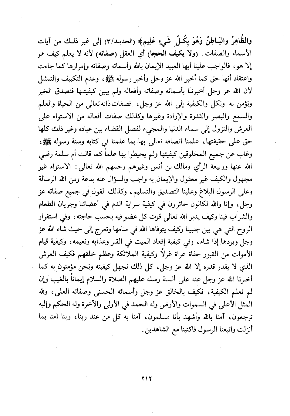 وَالظَّاهِرُ وَالْبَاطِنُ وَهُوَ بِكُلِّ شَيْءٍ عَلِيمٌ} [الْحَدِيدِ: 3] إِلَى غَيْرِ ذَلِكَ مِنْ آيَاتِ الْأَسْمَاءِ وَالصِّفَاتِ. "وَلَا يُكَيِّفُ الْحِجَا" أَيِ: الْعَقْلُ "صِفَاتِهِ" لِأَنَّهُ لَا يَعْلَمُ كَيْفَ هُوَ إِلَّا هُوَ, فَالْوَاجِبُ عَلَيْنَا أَيُّهَا الْعَبِيدُ الْإِيمَانُ بِاللَّهِ وَأَسْمَائِهِ وَصِفَاتِهِ وَإِمْرَارُهَا كَمَا جَاءَتْ وَاعْتِقَادُ أَنَّهَا حَقٌّ كَمَا أَخْبَرَ اللَّهُ عَزَّ وَجَلَّ وَأَخْبَرَ رَسُولُهُ -صَلَّى اللَّهُ عَلَيْهِ وَسَلَّمَ- وَعَدَمُ التَّكْيِيفِ وَالتَّمْثِيلِ؛ لِأَنَّ اللَّهَ عَزَّ وَجَلَّ أَخْبَرَنَا بِأَسْمَائِهِ وَصِفَاتِهِ وَأَفْعَالِهِ وَلَمْ يُبَيِّنْ كَيْفِيَّتَهَا فَنُصَدِّقُ الْخَبَرَ وَنُؤْمِنُ بِهِ وَنَكِلُ الْكَيْفِيَّةَ إِلَى اللَّهِ عَزَّ وَجَلَّ. فَصِفَاتُ ذَاتِهِ تَعَالَى مِنَ الْحَيَاةِ وَالْعِلْمِ وَالسَّمْعِ وَالْبَصَرِ وَالْقُدْرَةِ وَالْإِرَادَةِ وَغَيْرِهَا وَكَذَلِكَ صِفَاتُ أَفْعَالِهِ مِنَ الِاسْتِوَاءِ عَلَى الْعَرْشِ وَالنُّزُولِ إِلَى سَمَاءِ الدُّنْيَا وَالْمَجِيءِ لِفَصْلِ الْقَضَاءِ بَيْنَ عِبَادِهِ وَغَيْرِ ذَلِكَ كُلُّهَا حَقٌّ عَلَى حَقِيقَتِهَا عَلِمْنَا اتِّصَافَهُ تَعَالَى بِهَا بِمَا عَلِمْنَا فِي كِتَابِهِ وَسُنَّةِ رَسُولِهِ -صَلَّى اللَّهُ عَلَيْهِ وَسَلَّمَ- وَغَابَ عَنْ جَمِيعِ الْمَخْلُوقِينَ كَيْفِيَّتُهَا وَلَمْ يُحِيطُوا بِهَا عِلْمًا كَمَا, قَالَتْ أُمُّ سَلَمَةَ رَضِيَ اللَّهُ عَنْهَا وَرَبِيعَةُ الرَّأْيِ وَمَالِكُ بْنُ أَنَسٍ وَغَيْرُهُمْ رَحِمَهُمُ اللَّهُ تَعَالَى: الِاسْتِوَاءُ غَيْرُ مَجْهُولٍ وَالْكَيْفُ غَيْرُ مَعْقُولٍ وَالْإِيمَانُ بِهِ وَاجِبٌ وَالسُّؤَالُ عَنْهُ بِدْعَةٌ وَمِنَ اللَّهِ الرِّسَالَةُ وَعَلَى الرَّسُولِ الْبَلَاغُ وَعَلَيْنَا التَّصْدِيقُ وَالتَّسْلِيمُ, وَكَذَلِكَ الْقَوْلُ فِي جَمِيعِ صِفَاتِهِ عَزَّ وَجَلَّ, وَإِنَّا وَاللَّهِ لَكَالُّونَ حَائِرُونَ فِي كَيْفِيَّةِ سِرَايَةِ الدَّمِ فِي أَعْضَائِنَا وَجَرَيَانِ الطَّعَامِ وَالشَّرَابِ فِينَا وَكَيْفَ يُدَبِّرُ اللَّهُ تَعَالَى قُوتَ كُلِّ عُضْوٍ فِيهِ بِحَسَبِ حَاجَتِهِ, وَفِي اسْتِقْرَارِ الرُّوحِ الَّتِي هِيَ بَيْنَ جَنْبَيْنَا وَكَيْفَ يَتَوَفَّاهَا اللَّهُ فِي مَنَامِهَا وَتَعْرُجُ إِلَى حَيْثُ شَاءَ اللَّهُ عَزَّ وَجَلَّ وَيَرُدُّهَا إِذَا شَاءَ, وَكَيْفِيَّةِ إِقْعَادِ الْمَيِّتِ فِي الْقَبْرِ وَعَذَابِهِ وَنَعِيمِهِ, وَكَيْفِيَّةِ قِيَامِ الْأَمْوَاتِ مِنَ الْقُبُورِ حُفَاةً عُرَاةً غُرْلًا وَكَيْفِيَّةِ الْمَلَائِكَةِ وَعِظَمِ خَلْقِهِمْ؛ فَكَيْفَ الْعَرْشُ الَّذِي لَا يُقَدِّرُ قَدْرَهُ إِلَّا اللَّهُ عَزَّ وَجَلَّ, كُلُّ ذَلِكَ نَجْهَلُ كَيْفِيَّتَهُ وَنَحْنُ مُؤْمِنُونَ بِهِ كَمَا أَخْبَرَنَا اللَّهُ عَزَّ وَجَلَّ عَنْهُ عَلَى أَلْسِنَةِ رُسُلِهِ عَلَيْهِمُ الصَّلَاةُ وَالسَّلَامُ إِيمَانًا بِالْغَيْبِ وَإِنْ لَمْ نَعْلَمِ الْكَيْفِيَّةَ فَكَيْفَ بِالْخَالِقِ عَزَّ وَجَلَّ وَأَسْمَائِهِ الْحُسْنَى وصفاته العلى, ولله الْمَثَلُ الْأَعْلَى فِي السَّمَاوَاتِ وَالْأَرْضِ وله الْحَمْدُ فِي الْأُولَى وَالْآخِرَةِ وَلَهُ الْحُكْمُ وَإِلَيْهِ تُرْجَعُونَ آمنا بالله ونشهد بِأَنَّا مُسْلِمُونَ, آمَنَّا بِهِ كُلٌّ مِنْ عِنْدِ رَبِّنَا, رَبَّنَا آمَنَّا بِمَا أَنْزَلَتْ وَاتَّبَعْنَا الرَّسُولَ فَاكْتُبْنَا مَعَ الشَّاهِدِينَ.