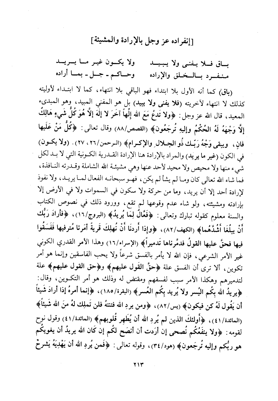 "بَاقٍ" كَمَا أَنَّهُ الْأَوَّلُ بِلَا ابْتِدَاءٍ فَهُوَ الْبَاقِي بِلَا انْتِهَاءٍ, كَمَا لَا ابْتِدَاءَ لِأَوَّلِيَّتِهِ كَذَلِكَ لَا انْتِهَاءَ لِآخِرِيَّتِهِ "فَلَا يَفْنَى وَلَا يَبِيدُ" بَلْ هُوَ الْمُفْنِي الْمُبِيدُ وَهُوَ الْمُبْدِئُ الْمُعِيدُ قَالَ اللَّهُ عَزَّ وَجَلَّ: {وَلَا تَدْعُ مَعَ اللَّهِ إِلَهًا آخَرَ لَا إِلَهَ إِلَّا هُوَ كُلُّ شَيْءٍ هَالِكٌ إِلَّا وَجْهَهُ لَهُ الْحُكْمُ وَإِلَيْهِ تُرْجَعُونَ} [الْقَصَصِ: 88] وَقَالَ تَعَالَى: {كُلُّ مَنْ عَلَيْهَا فَانٍ، وَيَبْقَى وَجْهُ رَبِّكَ ذُو الْجَلَالِ وَالْإِكْرَامِ} [الرَّحْمَنِ: 26-27] "وَلَا يَكُونُ" فِي الْكَوْنِ "غَيْرُ مَا يُرِيدُ" وَالْمُرَادُ بِالْإِرَادَةِ هُنَا الْإِرَادَةُ الْقَدَرِيَّةُ الْكَوْنِيَّةُ الَّتِي لَا بُدَّ لِكُلِّ شَيْءٍ مِنْهَا وَلَا مَحِيصَ وَلَا مَحِيدَ لِأَحَدٍ عَنْهَا وَهِيَ مَشِيئَةُ اللَّهِ الشَّامِلَةُ وَقُدْرَتُهُ النَّافِذَةُ, فَمَا شَاءَ اللَّهُ تَعَالَى كَانَ وَمَا لَمْ يَشَأْ لَمْ يَكُنْ فَهُوَ سُبْحَانَهُ الْفَعَّالُ لِمَا يُرِيدُ, وَلَا نُفُوذَ لِإِرَادَةِ أَحَدٍ إِلَّا أَنْ يُرِيدَ, وَمَا مِنْ حَرَكَةٍ وَلَا سُكُونٍ فِي السَّمَاوَاتِ وَلَا فِي الْأَرْضِ إِلَّا بِإِرَادَتِهِ وَمَشِيئَتِهِ وَلَوْ شَاءَ عَدَمَ وُقُوعِهَا لَمْ تَقَعْ, وَوُرُودُ ذَلِكَ فِي نُصُوصِ الْكِتَابِ وَالسُّنَّةِ مَعْلُومٌ كَقَوْلِهِ تَبَارَكَ وَتَعَالَى: {فَعَّالٌ لِمَا يُرِيدُ} [الْبُرُوجِ: 16] {فَأَرَادَ رَبُّكَ أَنْ يَبْلُغَا أَشُدَّهُمَا} [الْكَهْفِ: 82] {وَإِذَا أَرَدْنَا أَنْ نُهْلِكَ قَرْيَةً أَمَرْنَا مُتْرَفِيهَا فَفَسَقُوا فِيهَا فَحَقَّ عَلَيْهَا الْقَوْلُ فَدَمَّرْنَاهَا تَدْمِيرًا} [الْإِسْرَاءِ: 16] وَهَذَا الْأَمْرُ الْقَدَرِيُّ الْكَوْنِيُّ غَيْرُ الْأَمْرِ الشَّرْعِيِّ, فَإِنَّ اللَّهَ لَا يَأْمُرُ بِالْفِسْقِ شَرْعًا وَلَا يُحِبُّ الْفَاسِقِينَ وَإِنَّمَا هُوَ أَمْرُ تَكْوِينٍ, أَلَا تَرَى أَنَّ الْفِسْقَ عِلَّةُ "حَقَّ الْقَوْلُ عَلَيْهِمْ" وَ"حَقَّ الْقَوْلُ عَلَيْهِمْ" عِلَّةٌ لِتَدْمِيرِهِمْ وَهَكَذَا الْأَمْرُ سَبَبٌ لِفِسْقِهِمْ وَمُقْتَضٍ لَهُ وَذَلِكَ هُوَ أَمْرُ التَّكْوِينِ, وَقَالَ: {يُرِيدُ اللَّهُ بِكُمُ الْيُسْرَ وَلَا يُرِيدُ بِكُمُ الْعُسْرَ} [الْبَقَرَةِ: 185] {إِنَّمَا أَمْرُهُ إِذَا أَرَادَ شَيْئًا أَنْ يَقُولَ لَهُ كُنْ فَيَكُونُ} [يس: 82] {وَمَنْ يُرِدِ اللَّهُ فِتْنَتَهُ فَلَنْ تَمْلِكَ لَهُ مِنَ اللَّهِ شَيْئًا} [الْمَائِدَةِ: 41] {أُولَئِكَ الَّذِينَ لَمْ يُرِدِ اللَّهُ أَنْ يُطَهِّرَ قُلُوبَهُمْ} [الْمَائِدَةِ: 41] وَقَوْلُ نُوحٍ لِقَوْمِهِ: {وَلَا يَنْفَعُكُمْ نُصْحِي إِنْ أَرَدْتُ أَنْ أَنْصَحَ لَكُمْ إِنْ كَانَ اللَّهُ يُرِيدُ أَنْ يُغْوِيَكُمْ هُوَ رَبُّكُمْ وَإِلَيْهِ تُرْجَعُونَ} [هُودٍ:34] وَقَوْلُهُ تَعَالَى: {فَمَنْ يُرِدِ اللَّهُ أَنْ يَهدِيَهُ يَشْرَحْ