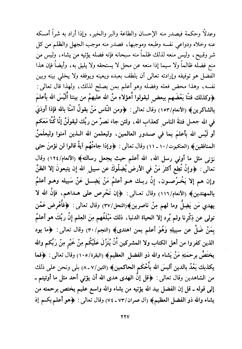 وَعَدْلًا وَحِكْمَةً فَيَصْدُرُ مِنْهُ الْإِحْسَانُ وَالطَّاعَةُ وَالْبِرُّ وَالْخَيْرُ, وَإِذَا أَرَادَ بِهِ شَرًّا أَمْسَكَهُ عَنْهُ وَخَلَّاهُ وَدَوَاعِيَ نَفْسِهِ وَطَبْعَهُ وَمُوجَبَهَا, فَصَدَرَ مِنْهُ مُوجَبُ الْجَهْلِ وَالظُّلْمِ مِنْ كُلِّ شَرٍّ وَقَبِيحٍ, وَلَيْسَ مَنْعُهُ لِذَلِكَ ظُلْمًا مِنْهُ سُبْحَانَهُ فَإِنَّهُ فَضْلُهُ يُؤْتِيهِ مَنْ يَشَاءُ, وَلَيْسَ مَنْ مَنَعَ فَضْلَهُ ظَالِمًا وَلَا سِيَّمَا إِذَا مَنَعَهُ عَنْ مَحَلٍّ لَا يَسْتَحِقُّهُ وَلَا يَلِيقُ بِهِ, وَأَيْضًا فَإِنَّ هَذَا الْفَضْلَ هُوَ تَوْفِيقُهُ وَإِرَادَتُهُ تَعَالَى أَنْ يَلْطُفَ بِعَبْدِهِ وَيُعِينَهُ وَيُوَفِّقَهُ وَلَا يُخَلِّيَ بَيْنَهُ وَبَيْنَ نَفْسِهِ, وَهَذَا مَحْضُ فِعْلِهِ وَفَضْلِهِ وَهُوَ أَعْلَمُ بِمَنْ يَصْلُحُ لِذَلِكَ؛ وَلِهَذَا قَالَ تَعَالَى: {وَكَذَلِكَ فَتَنَّا بَعْضَهُمْ بِبَعْضٍ لِيَقُولُوا أَهَؤُلَاءِ مَنَّ اللَّهُ عَلَيْهِمْ مِنْ بَيْنِنَا أَلَيْسَ اللَّهُ بِأَعْلَمَ بِالشَّاكِرِينَ} [الْأَنْعَامِ: 153] وَقَالَ تَعَالَى: {وَمِنَ النَّاسِ مَنْ يَقُولُ آمَنَّا بِاللَّهِ فَإِذَا أُوذِيَ فِي اللَّهِ جَعَلَ فِتْنَةَ النَّاسِ كَعَذَابِ اللَّهِ وَلَئِنْ جَاءَ نَصْرٌ مِنْ رَبِّكَ لَيَقُولُنَّ إِنَّا كُنَّا مَعَكُمْ أَوَلَيْسَ اللَّهُ بِأَعْلَمَ بِمَا فِي صُدُورِ الْعَالَمِينَ، وَلَيَعْلَمَنَّ اللَّهُ الَّذِينَ آمَنُوا وَلَيَعْلَمَنَّ الْمُنَافِقِينَ} [الْعَنْكَبُوتِ: 10-11] وَقَالَ تَعَالَى: {وَإِذَا جَاءَتْهُمْ آيَةٌ قَالُوا لَنْ نُؤْمِنَ حَتَّى نُؤْتَى مِثْلَ مَا أُوتِيَ رُسُلُ اللَّهِ اللَّهُ أَعْلَمُ حَيْثُ يَجْعَلُ رِسَالَتَهُ} [الْأَنْعَامِ: 124] وَقَالَ تَعَالَى: {وَإِنْ تُطِعْ أَكْثَرَ مَنْ فِي الْأَرْضِ يُضِلُّوكَ عَنْ سَبِيلِ اللَّهِ إِنْ يَتَّبِعُونَ إِلَّا الظَّنَّ وَإِنْ هُمْ إِلَّا يَخْرُصُونَ، إِنَّ رَبَّكَ هُوَ أَعْلَمُ مَنْ يَضِلُّ عَنْ سَبِيلِهِ وَهُوَ أَعْلَمُ بِالْمُهْتَدِينَ} [الْأَنْعَامِ: 116] وَقَالَ تَعَالَى: {إِنْ تَحْرِصْ عَلَى هُدَاهُمْ فَإِنَّ اللَّهَ لَا يَهْدِي مَنْ يُضِلُّ وَمَا لَهُمْ مِنْ نَاصِرِينَ} [النَّحْلِ: 37] وَقَالَ تَعَالَى: {فَأَعْرِضْ عَنْ مَنْ تَوَلَّى عَنْ ذِكْرِنَا وَلَمْ يُرِدْ إِلَّا الْحَيَاةَ الدُّنْيَا، ذَلِكَ مَبْلَغُهُمْ مِنَ الْعِلْمِ إِنَّ رَبَّكَ هُوَ أَعْلَمُ بِمَنْ ضَلَّ عَنْ سَبِيلِهِ وَهُوَ أَعْلَمُ بِمَنِ اهْتَدَى} [النَّجْمِ: 30] وَقَالَ تَعَالَى: {مَا يَوَدُّ الَّذِينَ كَفَرُوا مِنْ أَهْلِ الْكِتَابِ وَلَا الْمُشْرِكِينَ أَنْ يُنَزَّلَ عَلَيْكُمْ مِنْ خَيْرٍ مِنْ رَبِّكُمْ وَاللَّهُ يَخْتَصُّ بِرَحْمَتِهِ مَنْ يَشَاءُ وَاللَّهُ ذُو الْفَضْلِ الْعَظِيمِ} [الْبَقَرَةِ: 105] وَقَالَ تَعَالَى: {فَمَا يُكَذِّبُكَ بَعْدُ بِالدِّينِ، أَلَيْسَ اللَّهُ بِأَحْكَمِ الْحَاكِمِينَ} [التِّينِ: 7-8] بَلَى وَنَحْنُ عَلَى ذَلِكَ مِنَ الشَّاهِدِينَ, وَقَالَ تَعَالَى: {قُلْ إِنَّ الْهُدَى هُدَى اللَّهِ أَنْ يُؤْتَى أَحَدٌ مِثْلَ مَا أُوتِيتُ مْ -إِلَى قَوْلِهِ- قُلْ إِنَّ الْفَضْلَ بِيَدِ اللَّهِ يُؤْتِيهِ مَنْ يَشَاءُ وَاللَّهُ وَاسِعٌ عَلِيمٌ، يَخْتَصُّ بِرَحْمَتِهِ مَنْ يَشَاءُ وَاللَّهُ ذُو الْفَضْلِ الْعَظِيمِ} [آلِ عِمْرَانَ: 73-74] وَقَالَ تَعَالَى: {هُوَ أَعْلَمُ بِكُمْ إِذْ