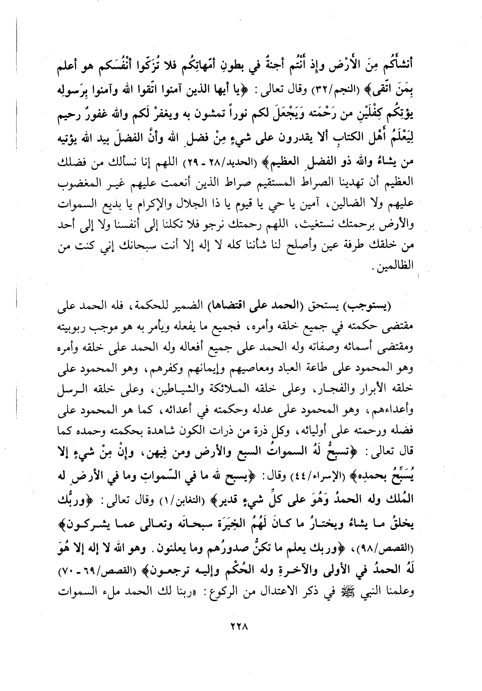 "يَسْتَوْجِبُ" يَسْتَحِقُّ "الْحَمْدَ عَلَى اقْتِضَاهَا" الضَّمِيرُ لِلْحِكْمَةِ فَلَهُ الْحَمْدُ عَلَى مُقْتَضَى حِكْمَتِهِ فِي جَمِيعِ خَلْقِهِ وَأَمْرِهِ, فَجَمِيعُ مَا يَفْعَلُهُ وَيَأْمُرُ بِهِ هُوَ مُوجَبُ رُبُوبِيَّتِهِ وَمُقْتَضَى أَسْمَائِهِ وَصِفَاتِهِ وَلَهُ الْحَمْدُ عَلَى جَمِيعِ أَفْعَالِهِ وَلَهُ الْحَمْدُ عَلَى خَلْقِهِ وَأَمْرِهِ وَهُوَ الْمَحْمُودُ عَلَى طَاعَةِ الْعِبَادِ وَمَعَاصِيهِمْ وَإِيمَانِهِمْ وَكُفْرِهِمْ, وَهُوَ الْمَحْمُودُ عَلَى خَلْقِهِ الْأَبْرَارَ وَالْفُجَّارَ, وَعَلَى خَلْقِهِ الْمَلَائِكَةَ وَالشَّيَاطِينَ, وَعَلَى خَلْقِهِ الرُّسُلَ وَأَعْدَاءَهُمْ, وَهُوَ الْمَحْمُودُ عَلَى عَدْلِهِ وَحِكْمَتِهِ فِي أَعْدَائِهِ, كَمَا هُوَ الْمَحْمُودُ عَلَى فَضْلِهِ وَرَحْمَتِهِ عَلَى أَوْلِيَائِهِ, وَكُلُّ ذَرَّةٍ مِنْ ذَرَّاتِ الْكَوْنِ شَاهِدَةٌ بِحِكْمَتِهِ وَحَمْدِهِ كَمَا قَالَ تَعَالَى: {تُسَبِّحُ لَهُ السَّمَاوَاتُ السَّبْعُ وَالْأَرْضُ وَمَنْ فِيهِنَّ وَإِنْ مِنْ شَيْءٍ إِلَّا يُسَبِّحُ بِحَمْدِهِ} [الْإِسْرَاءِ: 44] وَقَالَ: {يُسَبِّحُ لِلَّهِ مَا فِي السَّمَاوَاتِ وَمَا فِي الْأَرْضِ لَهُ الْمُلْكُ وَلَهُ الْحَمْدُ وَهُوَ عَلَى كُلِّ شَيْءٍ قَدِيرٌ} [التَّغَابُنِ: 1] وَقَالَ تَعَالَى: {وَرَبُّكَ يَخْلُقُ مَا يَشَاءُ وَيَخْتَارُ مَا كَانَ لَهُمُ الْخِيَرَةُ سُبْحَانَ اللَّهِ وَتَعَالَى عَمَّا يُشْرِكُون} [الْقَصَصِ: 98] {وَرَبُّكَ يَعْلَمُ مَا تُكِنُّ صُدُورُهُمْ وَمَا يُعْلِنُونَ، وَهُوَ اللَّهُ لَا إِلَهَ إِلَّا هُوَ لَهُ الْحَمْدُ فِي الْأُولَى وَالْآخِرَةِ وَلَهُ الْحُكْمُ وَإِلَيْهِ تُرْجَعُونَ} [الْقَصَصِ: 69- 70] وَعَلَّمَنَا النَّبِيُّ -صَلَّى اللَّهُ عَلَيْهِ وَسَلَّمَ- فِي ذِكْرِ الِاعْتِدَالِ مِنَ الرُّكُوعِ: "رَبَّنَا لَكَ الْحَمْدُ مِلْءَ السَّمَاوَاتِ