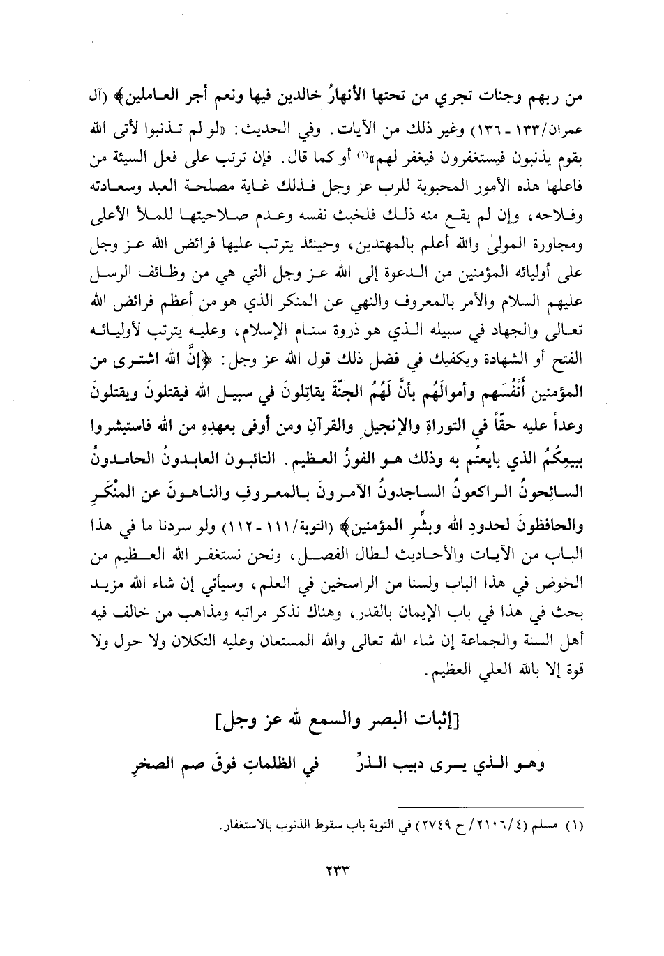 وَفِي الْحَدِيثِ: لَوْ لَمْ تُذْنِبُوا، لَأَتَى اللَّهُ بِقَوْمٍ يُذْنِبُونَ فَيَسْتَغْفِرُونَ فَيَغْفِرُ لَهُمْ" 1 أَوْ كَمَا قَالَ. فَإِنْ تَرَتَّبَ عَلَى فِعْلِ السَّيِّئَةِ مِنْ فَاعِلِهَا هَذِهِ الْأُمُورُ الْمَحْبُوبَةُ لِلرَّبِّ عَزَّ وَجَلَّ فَذَلِكَ غَايَةُ مَصْلَحَةِ الْعَبْدِ وَسَعَادَتِهِ وَفَلَاحِهِ, وَإِنْ لَمْ يَقَعْ مِنْهُ ذَلِكَ فَلِخُبْثِ نَفْسِهِ وَعَدَمِ صَلَاحِيَتِهَا لِلْمَلَأِ الْأَعْلَى وَمُجَاوَرَةِ الْمَوْلَى وَاللَّهُ أَعْلَمُ بِالْمُهْتَدِينَ, وَحِينَئِذٍ يَتَرَتَّبُ عَلَيْهَا فَرَائِضُ اللَّهِ عَزَّ وَجَلَّ عَلَى أَوْلِيَائِهِ الْمُؤْمِنِينَ مِنَ الدَّعْوَةِ إِلَى اللَّهِ عَزَّ وَجَلَّ الَّتِي هِيَ مِنْ وَظَائِفِ الرُّسُلِ عَلَيْهِمُ السَّلَامُ وَالْأَمْرِ بِالْمَعْرُوفِ وَالنَّهْيِ عَنِ الْمُنْكَرِ الَّذِي هُوَ مِنْ أَعْظَمِ فَرَائِضِ اللَّهِ تَعَالَى وَالْجِهَادِ فِي سَبِيلِهِ الَّذِي هُوَ ذِرْوَةُ سَنَامِ الْإِسْلَامِ, وَعَلَيْهِ يَتَرَتَّبُ لِأَوْلِيَائِهِ الْفَتْحُ أَوِ الشَّهَادَةُ وَيَكْفِيكَ فِي فَضْلِ ذَلِكَ قَوْلُ اللَّهِ عَزَّ وَجَلَّ: {إِنَّ اللَّهَ اشْتَرَى مِنَ الْمُؤْمِنِينَ أَنْفُسَهُمْ وَأَمْوَالَهُمْ بِأَنَّ لَهُمُ الْجَنَّةَ يُقَاتِلُونَ فِي سَبِيلِ اللَّهِ فَيَقْتُلُونَ وَيُقْتَلُونَ وَعْدًا عَلَيْهِ حَقًّا فِي التَّوْرَاةِ وَالْإِنْجِيلِ وَالْقُرْآنِ وَمَنْ أَوْفَى بِعَهْدِهِ مِنَ اللَّهِ فَاسْتَبْشِرُوا بِبَيْعِكُمُ الَّذِي بَايَعْتُمْ بِهِ وَذَلِكَ هُوَ الْفَوْزُ الْعَظِيمُ، التَّائِبُونَ الْعَابِدُونَ الْحَامِدُونَ السَّائِحُونَ الرَّاكِعُونَ السَّاجِدُونَ الْآمِرُونَ بِالْمَعْرُوفِ وَالنَّاهُونَ عَنِ الْمُنْكَرِ وَالْحَافِظُونَ لِحُدُودِ اللَّهِ وَبَشِّرِ الْمُؤْمِنِينَ} [التَّوْبَةِ: 111-112] وَلَوْ سَرَدْنَا مَا فِي هَذَا الْبَابِ مِنَ الْآيَاتِ وَالْأَحَادِيثِ لَطَالَ الْفَصْلُ, وَنَحْنُ نَسْتَغْفِرُ اللَّهَ الْعَظِيمَ مِنَ الْخَوْضِ فِي هَذَا الْبَابِ وَلَسْنَا مِنَ الرَّاسِخِينَ فِي الْعِلْمِ, وَسَيَأْتِي إِنْ شَاءَ اللَّهُ مَزِيدُ بَحْثٍ فِي هَذَا فِي بَابِ الْإِيمَانِ بِالْقَدَرِ, وَهُنَاكَ نَذْكُرُ مَرَاتِبَهُ وَمَذَاهِبَ مَنْ خَالَفَ فِيهِ أَهْلَ السُّنَّةِ وَالْجَمَاعَةِ إِنْ شَاءَ اللَّهُ تَعَالَى وَاللَّهُ الْمُسْتَعَانُ وَعَلَيْهِ التُّكْلَانِ وَلَا حَوْلَ وَلَا قُوَّةَ إِلَّا بِاللَّهِ الْعَلِيِّ الْعَظِيمِ.