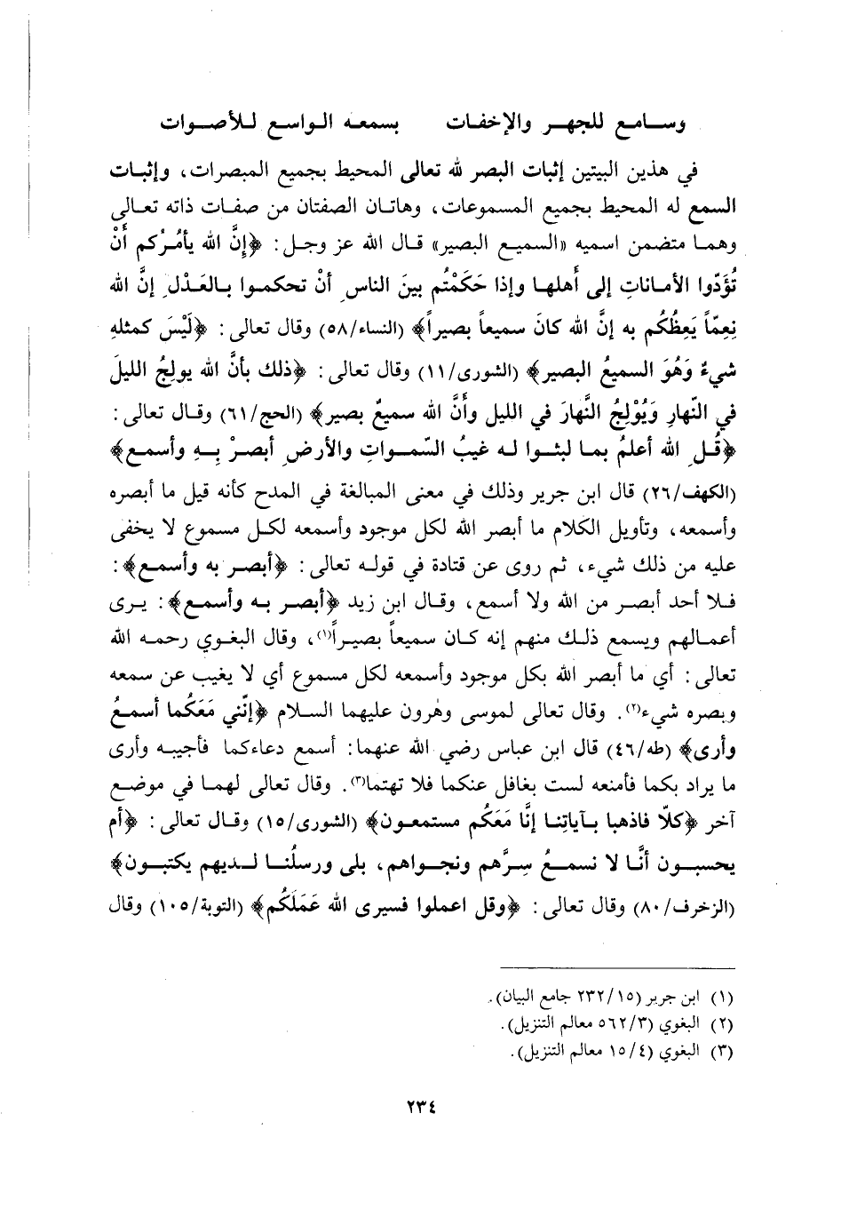 فِي هَذَيْنِ الْبَيْتَيْنِ إِثْبَاتُ الْبَصَرِ لِلَّهِ تَعَالَى الْمُحِيطِ بِجَمِيعِ الْمُبْصَرَاتِ, وَإِثْبَاتُ السَّمْعِ لَهُ الْمُحِيطِ بِجَمِيعِ الْمَسْمُوعَاتِ, وَهَاتَانِ الصِّفَتَانِ مِنْ صِفَاتِ ذَاتِهِ تَعَالَى وَهُمَا مُتَضَمَّنُ اسْمَيْهِ "السَّمِيعِ الْبَصِيرِ" قَالَ اللَّهُ عَزَّ وَجَلَّ: {إِنَّ اللَّهَ يَأْمُرُكُمْ أَنْ تُؤَدُّوا الْأَمَانَاتِ إِلَى أَهْلِهَا وَإِذَا حَكَمْتُمْ بَيْنَ النَّاسِ أَنْ تَحْكُمُوا بِالْعَدْلِ إِنَّ اللَّهَ نِعِمَّا يَعِظُكُمْ بِهِ إِنَّ اللَّهَ كَانَ سَمِيعًا بَصِيرًا} [النِّسَاءِ: 58] وَقَالَ تَعَالَى: {لَيْسَ كَمِثْلِهِ شَيْءٌ وَهُوَ السَّمِيعُ الْبَصِيرُ} [الشُّورَى: 11] وَقَالَ تَعَالَى: {ذَلِكَ بِأَنَّ اللَّهَ يُولِجُ اللَّيْلَ فِي النَّهَارِ وَيُولِجُ النَّهَارَ فِي اللَّيْلِ وَأَنَّ اللَّهَ سَمِيعٌ بَصِيرٌ} [الْحَجِّ: 61] وَقَالَ تَعَالَى: {قُلِ اللَّهُ أَعْلَمُ بِمَا لَبِثُوا لَهُ غَيْبُ السَّمَاوَاتِ وَالْأَرْضِ أَبْصِرْ بِهِ وَأَسْمِعْ} [الْكَهْفِ: 26] قَالَ ابْنُ جَرِيرٍ: وذلك في معنى الْمُبَالَغَةِ فِي الْمَدْحِ كَأَنَّهُ قِيلَ مَا أَبْصَرَهُ وَأَسْمَعَهُ, وَتَأْوِيلُ الْكَلَامِ مَا أَبْصَرَ اللَّهَ لِكُلِّ مَوْجُودٍ وَمَا أَسْمَعَهُ لِكُلِّ مَسْمُوعٍ لَا يَخْفَى عَلَيْهِ مِنْ ذَلِكَ شَيْءٌ, ثُمَّ رَوَى عَنْ قَتَادَةَ فِي قَوْلِهِ تَعَالَى: {أَبْصِرْ بِهِ وَأَسْمِعْ} فَلَا أَحَدَ أَبْصَرَ مِنَ اللَّهِ وَلَا أَسْمَعَ, وَقَالَ ابْنُ زَيْدٍ {أَبْصِرْ بِهِ وَأَسْمِعْ} : يَرَى أَعْمَالَهُمْ وَيَسْمَعُ ذَلِكَ مِنْهُمْ إِنَّهُ كَانَ سَمِيعًا بَصِيرًا1، وَقَالَ الْبَغَوِيُّ رَحِمَهُ اللَّهُ تَعَالَى: أَيْ مَا أَبْصَرَ اللَّهَ بِكُلِّ مَوْجُودٍ وَأَسْمَعَهُ لِكُلِّ مَسْمُوعٍ أَيْ: لَا يَغِيبُ عَنْ سَمْعِهِ وَبَصَرِهِ شَيْءٌ2. وَقَالَ تعالى لموسى وهرون عَلَيْهِمَا السَّلَامُ: {إِنَّنِي مَعَكُمَا أَسْمَعُ وَأَرَى} [طه: 46] قَالَ ابْنُ عَبَّاسٍ رَضِيَ اللَّهُ عَنْهُمَا: أَسْمَعُ دُعَاءَكُمَا فَأُجِيبُهُ وَأَرَى مَا يُرَادُ بِكُمَا فَأَمْنَعُهُ لَسْتُ بِغَافِلٍ عَنْكُمَا فَلَا تَهْتَمَّا3. وَقَالَ تَعَالَى لَهُمَا فِي مَوْضِعٍ آخَرَ {كَلَّا فَاذْهَبَا بِآيَاتِنَا إِنَّا مَعَكُمْ مُسْتَمِعُونَ} [الشُّورَى: 15] وَقَالَ تَعَالَى: {أَمْ يَحْسَبُونَ أَنَّا لَا نَسْمَعُ سِرَّهُمْ وَنَجْوَاهُمْ بَلَى وَرُسُلُنَا لَدَيْهِمْ يَكْتُبُونَ} [الزُّخْرُفِ: 80] وَقَالَ تَعَالَى: {وَقُلِ اعْمَلُوا فَسَيَرَى اللَّهُ عَمَلَكُمْ} [التَّوْبَةِ: 105] وَقَالَ