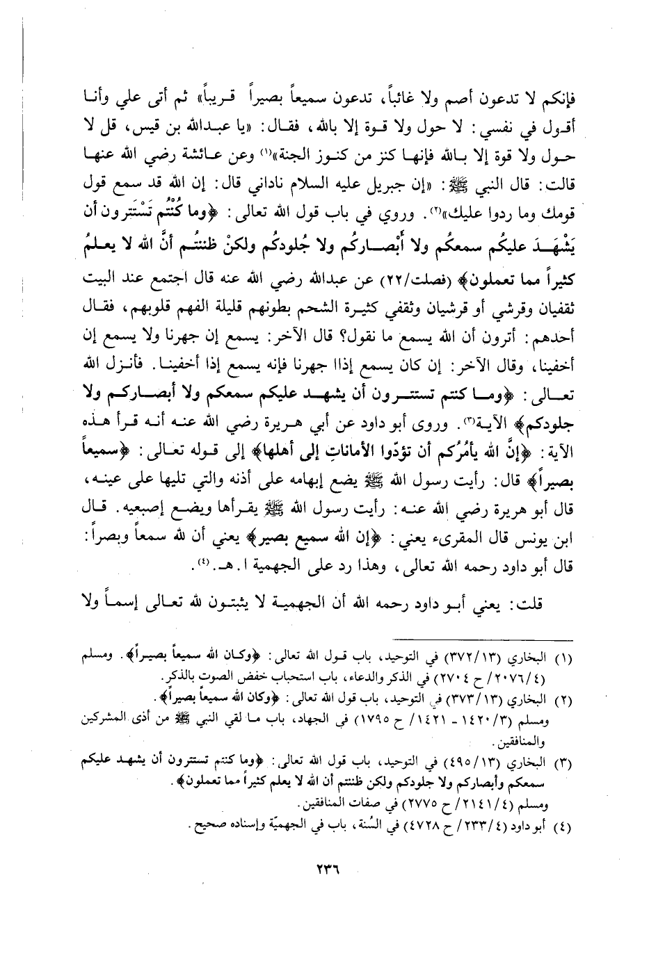 فَإِنَّكُمْ لَا تَدْعُونَ أَصَمَّ وَلَا غَائِبًا, تَدْعُونَ سَمِيعًا بَصِيرًا قَرِيبًا" ثُمَّ أَتَى عَلَيَّ وَأَنَا أَقُولُ فِي نَفْسِي: لَا حَوْلَ وَلَا قُوَّةَ إِلَّا بِاللَّهِ فَقَالَ: "يَا عَبْدَ اللَّهِ بْنَ قَيْسٍ قُلْ: لَا حَوْلَ وَلَا قُوَّةَ إِلَّا بِاللَّهِ فَإِنَّهَا كَنْزٌ مِنْ كُنُوزِ الْجَنَّةِ" 1 وَعَنْ عَائِشَةَ رَضِيَ اللَّهُ عَنْهَا قَالَتْ: قَالَ النَّبِيُّ صَلَّى اللَّهُ عَلَيْهِ وَسَلَّمَ: "إِنَّ جِبْرِيلَ عَلَيْهِ السَّلَامُ نَادَانِي قَالَ: إن الله قد سَمِعَ قَوْلَ قَوْمِكَ وَمَا رَدُّوا عَلَيْكَ" 2. وَرُوِيَ فِي بَابِ قَوْلِهِ تَعَالَى: {وَمَا كُنْتُمْ تَسْتَتِرُونَ أَنْ يَشْهَدَ عَلَيْكُمْ سَمْعُكُمْ وَلَا أَبْصَارُكُمْ وَلَا جُلُودُكُمْ وَلَكِنْ ظَنَنْتُمْ أَنَّ اللَّهَ لَا يَعْلَمُ كَثِيرًا مِمَّا تَعْمَلُونَ} [فُصِّلَتْ: 22] عَنْ عَبْدِ اللَّهِ رَضِيَ اللَّهُ عَنْهُ قَالَ: اجْتَمَعَ عِنْدَ الْبَيْتِ ثَقَفِيَّانِ وَقُرَشِيٌّ أَوْ قُرَشِيَّانِ وَثَقَفِيٌّ كَثِيرَةُ الشَّحْمِ بُطُونُهُمْ قَلِيلَةُ الْفَهْمِ قُلُوبُهُمْ, فَقَالَ أَحَدُهُمْ: أَتَرَوْنَ أَنَّ اللَّهَ يَسْمَعُ مَا نَقُولُ؟ قَالَ الْآخَرُ: يَسْمَعُ إِنْ جَهَرْنَا وَلَا يَسْمَعُ إِنْ أَخْفَيْنَا وَقَالَ الْآخَرُ: إِنْ كَانَ يَسْمَعُ إِذَا جَهَرْنَا فَإِنَّهُ يَسْمَعُ إِذَا أَخْفَيْنَا. فَأَنْزَلَ اللَّهُ تَعَالَى: {وَمَا كُنْتُمْ تَسْتَتِرُونَ أَنْ يَشْهَدَ عَلَيْكُمْ سَمْعُكُمْ وَلَا أَبْصَارُكُمْ وَلَا جُلُودُكُمْ} الْآيَةَ3. وَرَوَى أَبُو دَاوُدَ عَنْ أَبِي هُرَيْرَةَ رَضِيَ اللَّهُ عَنْهُ أَنَّهُ قَرَأَ هَذِهِ الْآيَةَ: {إِنَّ اللَّهَ يَأْمُرُكُمْ أَنْ تُؤَدُّوا الْأَمَانَاتِ إِلَى أَهْلِهَا} إِلَى قَوْلِهِ تَعَالَى: {سَمِيعًا بَصِيرًا} قَالَ: رَأَيْتُ رَسُولَ اللَّهِ -صَلَّى اللَّهُ عَلَيْهِ وَسَلَّمَ- يَضَعُ إِبْهَامَهُ عَلَى أُذُنِهِ وَالَّتِي تَلِيهَا عَلَى عَيْنِهِ قَالَ أَبُو هُرَيْرَةَ رَضِيَ اللَّهُ عَنْهُ: رَأَيْتُ رسول الله -صَلَّى اللَّهُ عَلَيْهِ وَسَلَّمَ- يقرأها وَيَضَعُ إِصْبَعَيْهِ. قَالَ: ابْنُ يونس قال المقرىء يَعْنِي: {إِنَّ اللَّهَ سَمِيعٌ بَصِيرٌ} يَعْنِي أَنَّ لِلَّهِ سَمْعًا وَبَصَرًا قَالَ أَبُو دَاوُدَ رَحِمَهُ اللَّهُ تَعَالَى: وَهَذَا رَدٌّ على الجهمية ا. هـ.4.