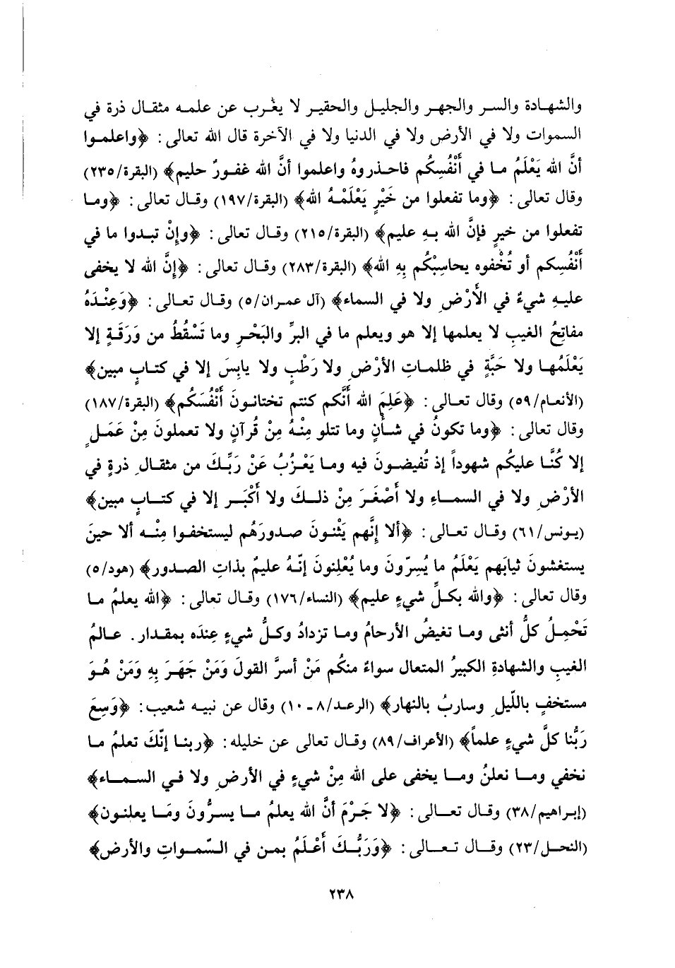 وَالشَّهَادَةُ وَالسِّرُّ وَالْجَهْرُ وَالْجَلِيلُ والحقير لا يغرب عَنْ عِلْمِهِ مِثْقَالُ ذَرَّةٍ فِي السَّمَاوَاتِ وَلَا فِي الْأَرْضِ وَلَا فِي الدُّنْيَا وَلَا فِي الْآخِرَةِ قَالَ اللَّهُ تَعَالَى: {وَاعْلَمُوا أَنَّ اللَّهَ يَعْلَمُ مَا فِي أَنْفُسِكُمْ فَاحْذَرُوهُ وَاعْلَمُوا أَنَّ اللَّهَ غَفُورٌ حَلِيمٌ} [الْبَقَرَةِ: 235] وَقَالَ تَعَالَى: {وَمَا تَفْعَلُوا مِنْ خَيْرٍ يَعْلَمْهُ اللَّهُ} [الْبَقَرَةِ: 197] وَقَالَ تَعَالَى: {وَمَا تَفْعَلُوا مِنْ خَيْرٍ فَإِنَّ اللَّهَ بِهِ عَلِيمٌ} [الْبَقَرَةِ: 215] وَقَالَ تَعَالَى: {وَإِنْ تُبْدُوا مَا فِي أَنْفُسِكُمْ أَوْ تُخْفُوهُ يُحَاسِبْكُمْ بِهِ اللَّهُ} [الْبَقَرَةِ: 283] وَقَالَ تَعَالَى: {إِنَّ اللَّهَ لَا يَخْفَى عَلَيْهِ شَيْءٌ فِي الْأَرْضِ وَلَا فِي السَّمَاءِ} [آلِ عِمْرَانَ: 5] وَقَالَ تَعَالَى: {وَعِنْدَهُ مَفَاتِحُ الْغَيْبِ لَا يَعْلَمُهَا إِلَّا هُوَ وَيَعْلَمُ مَا فِي الْبَرِّ وَالْبَحْرِ وَمَا تَسْقُطُ مِنْ وَرَقَةٍ إِلَّا يَعْلَمُهَا وَلَا حَبَّةٍ فِي ظُلُمَاتِ الْأَرْضِ وَلَا رَطْبٍ وَلَا يَابِسٍ إِلَّا فِي كِتَابٍ مُبِينٍ} [الْأَنْعَامِ: 59] وَقَالَ تَعَالَى: {عَلِمَ اللَّهُ أَنَّكُمْ كُنْتُمْ تَخْتَانُونَ أَنْفُسَكُمْ} [الْبَقَرَةِ: 187] وَقَالَ تَعَالَى: {وَمَا تَكُونُ فِي شَأْنٍ وَمَا تَتْلُو مِنْهُ مِنْ قُرْآنٍ وَلَا تَعْمَلُونَ مِنْ عَمَلٍ إِلَّا كُنَّا عَلَيْكُمْ شُهُودًا إِذْ تُفِيضُونَ فِيهِ وَمَا يَعْزُبُ عَنْ رَبِّكَ مِنْ مِثْقَالِ ذَرَّةٍ فِي الْأَرْضِ وَلَا فِي السَّمَاءِ وَلَا أَصْغَرَ مِنْ ذَلِكَ وَلَا أَكْبَرَ إِلَّا فِي كِتَابٍ مُبِينٍ} [يُونُسَ: 61] وَقَالَ تَعَالَى: {أَلَا إِنَّهُمْ يَثْنُونَ صُدُورَهُمْ لِيَسْتَخْفُوا مِنْهُ أَلَا حِينَ يَسْتَغْشُونَ ثِيَابَهُمْ يَعْلَمُ مَا يُسِرُّونَ وَمَا يُعْلِنُونَ إِنَّهُ عَلِيمٌ بِذَاتِ الصُّدُورِ} [هُودٍ: 5] وَقَالَ تَعَالَى: {وَاللَّهُ بِكُلِّ شَيْءٍ عَلِيمٌ} [النِّسَاءِ: 176] وَقَالَ تَعَالَى: {اللَّهُ يَعْلَمُ مَا تَحْمِلُ كُلُّ أُنْثَى وَمَا تَغِيضُ الْأَرْحَامُ وَمَا تَزْدَادُ وَكُلُّ شَيْءٍ عِنْدَهُ بِمِقْدَارٍ، عَالِمُ الْغَيْبِ وَالشَّهَادَةِ الْكَبِيرُ الْمُتَعَالِ، سَوَاءٌ مِنْكُمْ مَنْ أَسَرَّ الْقَوْلَ وَمَنْ جَهَرَ بِهِ وَمَنْ هُوَ مُسْتَخْفٍ بِاللَّيْلِ وَسَارِبٌ بِالنَّهَارِ} [الرَّعْدِ: 8-10] وَقَالَ عَنْ نَبِيِّهِ شُعَيْبٍ: {وَسِعَ رَبُّنَا كُلَّ شَيْءٍ عِلْمًا} [الْأَعْرَافِ: 89] وَقَالَ تَعَالَى عَنْ خَلِيلِهِ: {رَبَّنَا إِنَّكَ تَعْلَمُ مَا نُخْفِي وَمَا نُعْلِنُ وَمَا يَخْفَى عَلَى اللَّهِ مِنْ شَيْءٍ فِي الْأَرْضِ وَلَا فِي السَّمَاءِ} [إِبْرَاهِيمَ: 38] وَقَالَ تَعَالَى: {لَا جَرَمَ أَنَّ اللَّهَ يَعْلَمُ مَا يُسِرُّونَ وَمَا يُعْلِنُونَ} [النَّحْلِ: 23] وَقَالَ تَعَالَى: {وَرَبُّكَ أَعْلَمُ بِمَنْ فِي السَّمَاوَاتِ وَالْأَرْضِ}