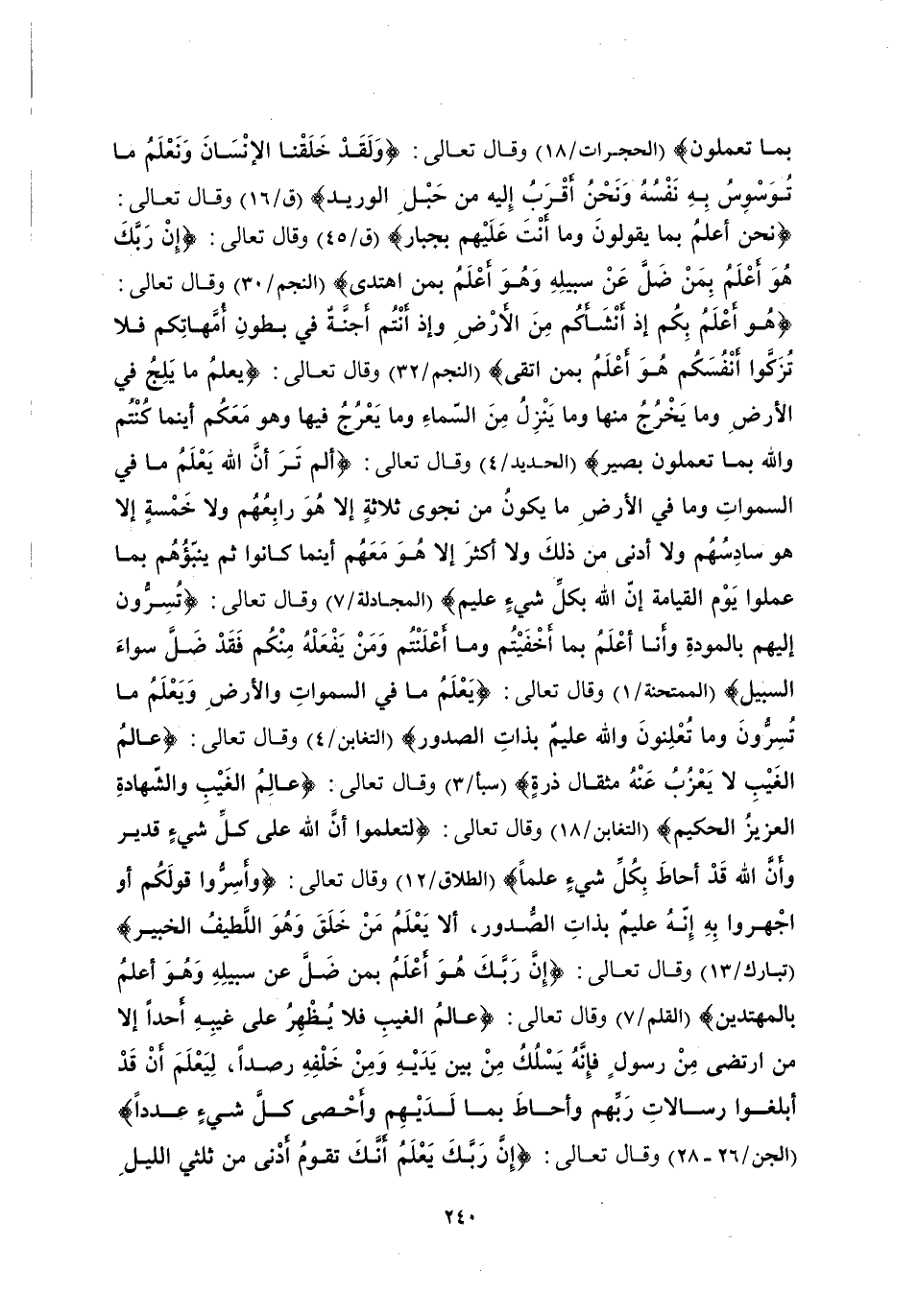بِمَا تَعْمَلُونَ} [الْحُجُرَاتِ: 18] وَقَالَ تَعَالَى: {وَلَقَدْ خَلَقْنَا الْإِنْسَانَ وَنَعْلَمُ مَا تُوَسْوِسُ بِهِ نَفْسُهُ وَنَحْنُ أَقْرَبُ إِلَيْهِ مِنْ حَبْلِ الْوَرِيدِ} [ق: 16] وَقَالَ تَعَالَى: {نَحْنُ أَعْلَمُ بِمَا يَقُولُونَ وَمَا أَنْتَ عَلَيْهِمْ بِجَبَّارٍ} [ق: 45] وَقَالَ تَعَالَى: {إِنَّ رَبَّكَ هُوَ أَعْلَمُ بِمَنْ ضَلَّ عَنْ سَبِيلِهِ وَهُوَ أَعْلَمُ بِمَنِ اهْتَدَى} [النَّجْمِ: 30] وَقَالَ تَعَالَى: {هُوَ أَعْلَمُ بِكُمْ إِذْ أَنْشَأَكُمْ مِنَ الْأَرْضِ وَإِذْ أَنْتُمْ أَجِنَّةٌ فِي بُطُونِ أُمَّهَاتِكُمْ فَلَا تُزَكُّوا أَنْفُسَكُمْ هُوَ أَعْلَمُ بِمَنِ اتَّقَى} [النَّجْمِ: 32] وَقَالَ تَعَالَى: {يَعْلَمُ مَا يَلِجُ فِي الْأَرْضِ وَمَا يَخْرُجُ مِنْهَا وَمَا يَنْزِلُ مِنَ السَّمَاءِ وَمَا يَعْرُجُ فِيهَا وَهُوَ مَعَكُمْ أَيْنَ مَا كُنْتُمْ وَاللَّهُ بِمَا تَعْمَلُونَ بَصِير} [الْحَدِيدِ: 4] وَقَالَ تَعَالَى: {أَلَمْ تَرَ أَنَّ اللَّهَ يَعْلَمُ مَا فِي السَّمَاوَاتِ وَمَا فِي الْأَرْضِ مَا يَكُونُ مِنْ نَجْوَى ثَلَاثَةٍ إِلَّا هُوَ رَابِعُهُمْ وَلَا خَمْسَةٍ إِلَّا هُوَ سَادِسُهُمْ وَلَا أَدْنَى مِنْ ذَلِكَ وَلَا أَكْثَرَ إِلَّا هُوَ مَعَهُمْ أَيْنَ مَا كَانُوا ثُمَّ يُنَبِّئُهُمْ بِمَا عَمِلُوا يَوْمَ الْقِيَامَةِ إِنَّ اللَّهَ بِكُلِّ شَيْءٍ عَلِيمٌ} [الْمُجَادَلَةِ: 7] وَقَالَ تَعَالَى: {تُسِرُّونَ إِلَيْهِمْ بِالْمَوَدَّةِ وَأَنَا أَعْلَمُ بِمَا أَخْفَيْتُمْ وَمَا أَعْلَنْتُمْ وَمَنْ يَفْعَلْهُ مِنْكُمْ فَقَدْ ضَلَّ سَوَاءَ السَّبِيلِ} [الْمُمْتَحَنَةِ: 1] وَقَالَ تَعَالَى: {يَعْلَمُ مَا فِي السَّمَاوَاتِ وَالْأَرْضِ وَيَعْلَمُ مَا تُسِرُّونَ وَمَا تُعْلِنُونَ وَاللَّهُ عَلِيمٌ بِذَاتِ الصُّدُورِ} [التَّغَابُنِ: 4] وَقَالَ تَعَالَى: {عَالِمِ الْغَيْبِ لَا يَعْزُبُ عَنْهُ مِثْقَالُ ذَرَّةٍ} [سَبَأٍ: 3] وَقَالَ تَعَالَى: {عَالِمُ الْغَيْبِ وَالشَّهَادَةِ الْعَزِيزُ الْحَكِيمُ} [التَّغَابُنِ: 18] وَقَالَ تَعَالَى: {لِتَعْلَمُوا أَنَّ اللَّهَ عَلَى كُلِّ شَيْءٍ قَدِيرٌ وَأَنَّ اللَّهَ قَدْ أَحَاطَ بِكُلِّ شَيْءٍ عِلْمًا} [الطَّلَاقِ: 12] وَقَالَ تَعَالَى: {وَأَسِرُّوا قَوْلَكُمْ أَوِ اجْهَرُوا بِهِ إِنَّهُ عَلِيمٌ بِذَاتِ الصُّدُورِ، أَلَا يَعْلَمُ مَنْ خَلَقَ وَهُوَ اللَّطِيفُ الْخَبِيرُ} [تَبَارَكَ: 13] وَقَالَ تَعَالَى: {إِنَّ رَبَّكَ هُوَ أَعْلَمُ بِمَنْ ضَلَّ عَنْ سَبِيلِهِ وَهُوَ أَعْلَمُ بِالْمُهْتَدِينَ} [الْقَلَمِ: 7] وَقَالَ تَعَالَى: {عَالِمُ الْغَيْبِ فَلَا يُظْهِرُ عَلَى غَيْبِهِ أَحَدًا، إِلَّا مَنِ ارْتَضَى مِنْ رَسُولٍ فَإِنَّهُ يَسْلُكُ مِنْ بَيْنِ يَدَيْهِ وَمِنْ خَلْفِهِ رَصَدًا، لِيَعْلَمَ أَنْ قَدْ أَبْلَغُوا رِسَالَاتِ رَبِّهِمْ وَأَحَاطَ بِمَا لَدَيْهِمْ وَأَحْصَى كُلَّ شَيْءٍ عَدَدًا} [الْجِنِّ: 26-28] وَقَالَ تَعَالَى: {إِنَّ رَبَّكَ يَعْلَمُ أَنَّكَ تَقُومُ أَدْنَى مِنْ ثُلُثَيِ اللَّيْلِ