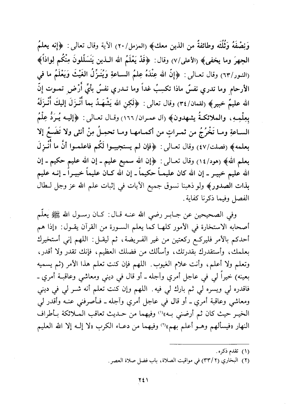 وَفِي الصَّحِيحَيْنِ عَنْ جَابِرٍ رَضِيَ اللَّهُ عَنْهُ قَالَ: كَانَ رَسُولُ اللَّهِ -صَلَّى اللَّهُ عَلَيْهِ وَسَلَّمَ- يُعَلِّمُ أَصْحَابَهُ الِاسْتِخَارَةَ فِي الْأُمُورِ كُلِّهَا, كَمَا يُعَلِّمُ السُّورَةَ مِنَ الْقُرْآنِ يَقُولُ: "إِذَا هَمَّ أَحَدُكُمْ بِالْأَمْرِ فَلْيَرْكَعْ رَكْعَتَيْنِ مِنْ غَيْرِ الْفَرِيضَةِ, ثُمَّ لِيَقُلِ: اللَّهُمَّ إِنِّي أَسْتَخِيرُكَ بِعِلْمِكَ وَأَسْتَقْدِرُكَ بِقُدْرَتِكَ وَأَسْأَلُكَ مِنْ فَضْلِكَ الْعَظِيمِ فَإِنَّكَ تَقْدِرُ وَلَا أَقْدِرُ وَتَعْلَمُ وَلَا أَعْلَمُ وَأَنْتَ عَلَّامُ الْغُيُوبِ, اللَّهُمَّ فَإِنْ كُنْتَ تَعْلَمُ هَذَا الْأَمْرَ -ثُمَّ يُسَمِّيهِ بِعَيْنِهِ- خَيْرًا لِي فِي عَاجِلِ أَمْرِي وَآجِلِهِ - أَوْ قَالَ: فِي دِينِي وَمَعَاشِي وَعَاقِبَةِ أَمْرِي - فَاقْدِرْهُ لِي وَيَسِّرْهُ لِي ثُمَّ بَارِكْ لِي فِيهِ, اللَّهُمَّ وَإِنْ كُنْتَ تَعْلَمُ أَنَّهُ شَرٌّ لِي فِي دِينِي وَمَعَاشِي وَعَاقِبَةِ أَمْرِي - أَوْ قَالَ: فِي عَاجِلِ أَمْرِي وَآجِلِهِ - فَاصْرِفْنِي عَنْهُ وَاقْدِرْ لِيَ الْخَيْرَ حَيْثُ كَانَ ثُمَّ أَرْضِنِي بِهِ" 1 وَفِيهِمَا مِنْ حَدِيثِ تَعَاقُبِ الْمَلَائِكَةِ بِأَطْرَافِ النَّهَارِ "فَيَسْأَلُهُمْ وَهُوَ أَعْلَمُ بهم" 2 وفيهما من دُعَاءُ الْكَرْبِ "لَا إِلَهَ إِلَّا اللَّهُ الْعَلِيمُ