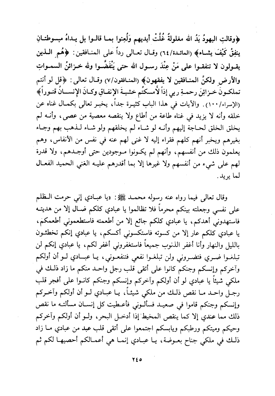 وَقَالَ تَعَالَى فِيمَا رَوَاهُ عَنْهُ رَسُولُهُ مُحَمَّدٌ صَلَّى اللَّهُ عَلَيْهِ وَسَلَّمَ: "يَا عِبَادِي إِنِّي حَرَّمْتُ الظُّلْمَ عَلَى نَفْسِي وَجَعَلْتُهُ بَيْنَكُمْ مُحَرَّمًا فَلَا تَظَّالَمُوا يَا عِبَادِي كُلُّكُمْ ضَالٌّ إِلَّا مَنْ هَدَيْتُهُ فَاسْتَهْدُونِي أَهْدِكُمْ, يَا عِبَادِي كُلُّكُمْ جَائِعٌ إِلَّا مَنْ أَطْعَمْتُهُ فَاسْتَطْعِمُونِي أُطْعِمْكُمْ, يَا عِبَادِي كُلُّكُمْ عَارٍ إِلَّا مَنْ كَسَوْتُهُ فَاسْتَكْسُونِي أَكْسُكُمْ, يَا عِبَادِي إِنَّكُمْ تُخْطِئُونَ بِاللَّيْلِ وَالنَّهَارِ وَأَنَا أَغْفِرُ الذُّنُوبَ جَمِيعًا فَاسْتَغْفِرُونِي أَغْفِرْ لَكُمْ, يَا عِبَادِي إِنَّكُمْ لَنْ تَبْلُغُوا ضُرِّي فَتَضُرُّونِي وَلَنْ تَبْلُغُوا نَفْعِي فَتَنْفَعُونِي, يَا عِبَادِي لَوْ أَنَّ أَوَّلَكُمْ وَآخِرَكُمْ وَإِنْسَكُمْ وَجِنَّكُمْ كَانُوا عَلَى أَتْقَى قَلْبِ رَجُلٍ وَاحِدٍ مِنْكُمْ مَا زَادَ ذَلِكَ فِي مُلْكِي شَيْئًا, يَا عِبَادِي لَوْ أَنَّ أَوَّلَكُمْ وَآخِرَكُمْ وَإِنْسَكُمْ وَجِنَّكُمْ كَانُوا عَلَى أَفْجَرِ قَلْبِ رَجُلٍ وَاحِدٍ مَا نَقَصَ ذَلِكَ مِنْ مُلْكِي شَيْئًا, يَا عِبَادِي لَوْ أَنَّ أَوَّلَكُمْ وَآخِرَكُمْ وَإِنْسَكُمْ وَجِنَّكُمْ قَامُوا فِي صَعِيدٍ وَاحِدٍ فَسَأَلُونِي فَأَعْطَيْتُ كُلَّ إِنْسَانٍ مَسْأَلَتَهُ مَا نَقَصَ ذَلِكَ مِمَّا عِنْدِي إِلَّا كَمَا يَنْقُصُ الْمِخْيَطُ إِذَا أُدْخِلَ الْبَحْرَ, وَلَوْ أَنَّ أَوَّلَكُمْ وَآخِرَكُمْ وَحَيَّكُمْ وَمَيِّتَكُمْ وَرَطْبَكُمْ وَيَابِسَكُمُ اجْتَمَعُوا عَلَى أَتْقَى قَلْبِ عَبْدٍ مِنْ عِبَادِي مَا زَادَ ذَلِكَ فِي مُلْكِي جَنَاحَ بَعُوضَةٍ, يَا عِبَادِي إِنَّمَا هِيَ أَعْمَالُكُمْ أُحْصِيهَا لَكُمْ ثُمَّ
