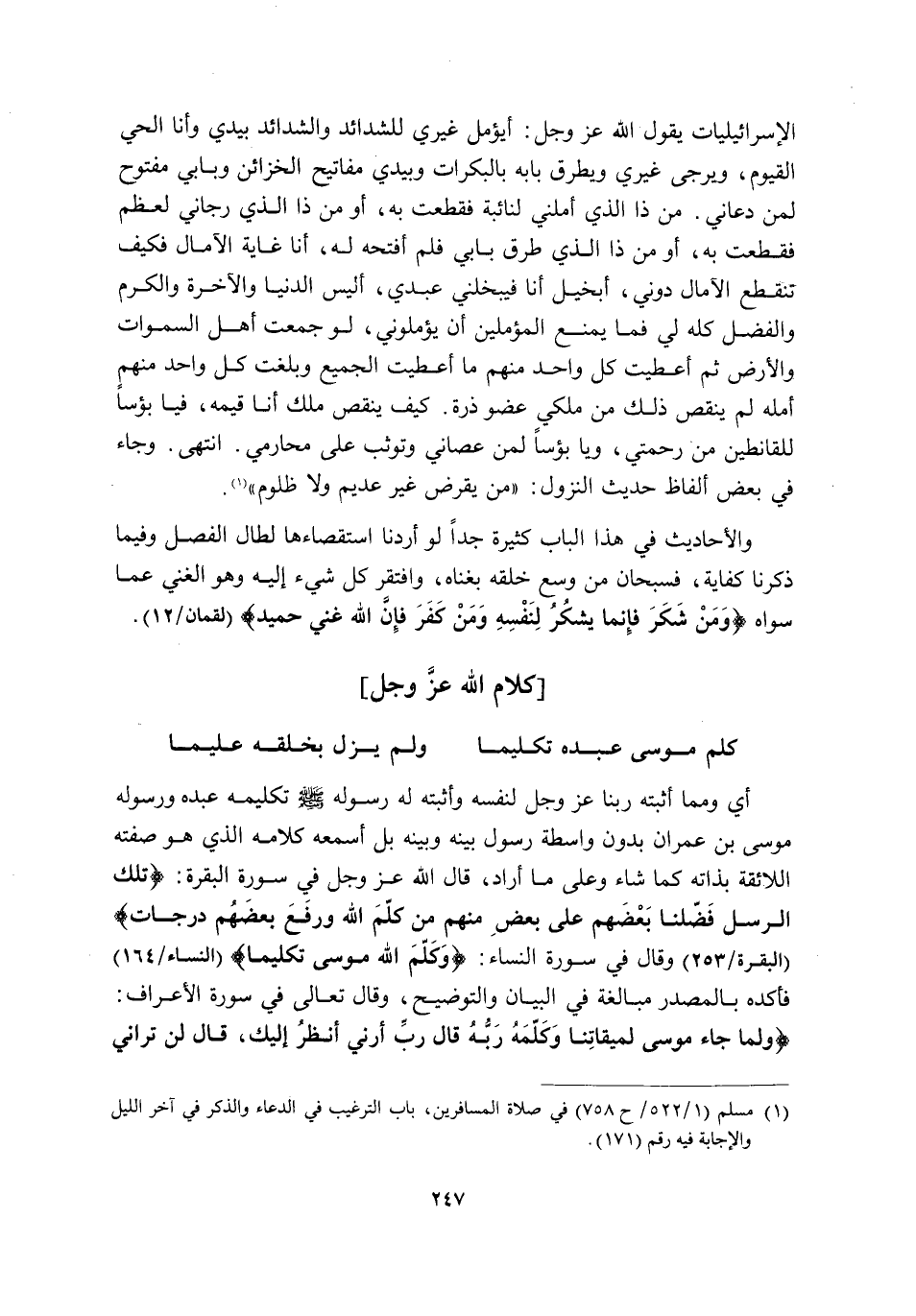 أَيْ: وَمِمَّا أَثْبَتَهُ رَبُّنَا عَزَّ وَجَلَّ لِنَفْسِهِ وَأَثْبَتَهُ لَهُ رَسُولُهُ -صَلَّى اللَّهُ عَلَيْهِ وَسَلَّمَ- تَكْلِيمُهُ عَبْدَهُ وَرَسُولَهُ مُوسَى بْنَ عِمْرَانَ بِدُونِ وَاسِطَةِ رَسُولٍ بَيْنَهُ وَبَيْنَهُ بَلْ أَسْمَعَهُ كَلَامَهُ الَّذِي هُوَ صِفَتُهُ اللَّائِقَةُ بِذَاتِهِ كَمَا شَاءَ وَعَلَى مَا أَرَادَ, قَالَ اللَّهُ عَزَّ وَجَلَّ فِي سُورَةِ الْبَقَرَةِ: {تِلْكَ الرُّسُلُ فَضَّلْنَا بَعْضَهُمْ عَلَى بَعْضٍ مِنْهُمْ مَنْ كَلَّمَ اللَّهُ وَرَفَعَ بَعْضَهُمْ دَرَجَاتٍ} [الْبَقَرَةِ: 253] وَقَالَ فِي سُورَةِ النِّسَاءِ: {وَكَلَّمَ اللَّهُ مُوسَى تَكْلِيمًا} [النِّسَاءِ: 164] فَأَكَّدَهُ بِالْمَصْدَرِ مُبَالَغَةً فِي الْبَيَانِ وَالتَّوْضِيحِ, وَقَالَ تَعَالَى فِي سُورَةِ الْأَعْرَافِ: {وَلَمَّا جَاءَ مُوسَى لِمِيقَاتِنَا وَكَلَّمَهُ رَبُّهُ قَالَ: رَبِّ أَرِنِي أَنْظُرْ إِلَيْكَ قَالَ: لَنْ تَرَانِي