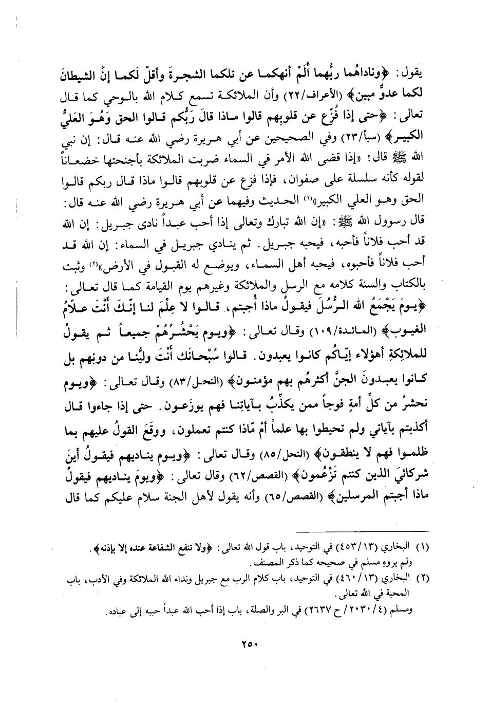 يَقُولُ: {وَنَادَاهُمَا رَبُّهُمَا أَلَمْ أَنْهَكُمَا عَنْ تِلْكُمَا الشَّجَرَةِ وَأَقُلْ لَكُمَا إِنَّ الشَّيْطَانَ لَكُمَا عَدُوٌّ مُبِينٌ} [الْأَعْرَافِ: 22] وَأَنَّ الْمَلَائِكَةَ تَسْمَعُ كَلَامَ اللَّهِ بِالْوَحْيِ كَمَا قَالَ تَعَالَى: {حَتَّى إِذَا فُزِّعَ عَنْ قُلُوبِهِمْ قَالُوا مَاذَا قَالَ رَبُّكُمْ قَالُوا الْحَقَّ وَهُوَ الْعَلِيُّ الْكَبِيرُ} [سَبَأٍ: 23] وَفِي الصَّحِيحَيْنِ عَنْ أَبِي هُرَيْرَةَ رَضِيَ اللَّهُ عَنْهُ قَالَ: إِنَّ نَبِيَّ اللَّهِ -صَلَّى اللَّهُ عَلَيْهِ وَسَلَّمَ- قَالَ: "إِذَا قَضَى اللَّهُ الْأَمْرَ فِي السَّمَاءِ ضَرَبَتِ الْمَلَائِكَةُ بِأَجْنِحَتِهَا خُضْعَانًا لِقَوْلِهِ كَأَنَّهُ سِلْسِلَةٌ عَلَى صَفْوَانٍ, فَإِذَا فُزِّعَ عَنْ قُلُوبِهِمْ قَالُوا: مَاذَا قَالَ رَبُّكُمْ؟ قَالُوا: الْحَقَّ, وَهُوَ الْعَلِيُّ الْكَبِيرُ" 1 الْحَدِيثُ. وَفِيهِمَا عَنْ أَبِي هُرَيْرَةَ رَضِيَ اللَّهُ عَنْهُ قَالَ: قَالَ رَسُولُ اللَّهِ صَلَّى اللَّهُ عَلَيْهِ وَسَلَّمَ: "إِنَّ اللَّهَ تَبَارَكَ وَتَعَالَى إِذَا أَحَبَّ عَبْدًا نَادَى جِبْرِيلَ: إِنَّ اللَّهَ قَدْ أَحَبَّ فُلَانًا فَأَحِبَّهُ, فَيُحِبُّهُ جِبْرِيلُ ثُمَّ يُنَادِي جِبْرِيلُ فِي السَّمَاءِ: إِنَّ اللَّهَ قَدْ أَحَبَّ فُلَانًا فَأَحِبُّوهُ, فَيُحِبُّهُ أَهْلُ السَّمَاءِ, وَيُوضَعُ لَهُ الْقَبُولُ فِي الْأَرْضِ" 2. وَثَبَتَ بِالْكِتَابِ وَالسُّنَّةِ كَلَامُهُ مَعَ الرُّسُلِ وَالْمَلَائِكَةِ وَغَيْرِهِمْ يَوْمَ الْقِيَامَةِ كَمَا قَالَ تَعَالَى: {يَوْمَ يَجْمَعُ اللَّهُ الرُّسُلَ فَيَقُولُ مَاذَا أُجِبْتُمْ قَالُوا لَا عِلْمَ لَنَا إِنَّكَ أَنْتَ عَلَّامُ الْغُيُوبِ} [الْمَائِدَةِ: 109] وَقَالَ تَعَالَى: {وَيَوْمَ يَحْشُرُهُمْ جَمِيعًا ثُمَّ يَقُولُ لِلْمَلَائِكَةِ أَهَؤُلَاءِ إِيَّاكُمْ كَانُوا يَعْبُدُونَ، قَالُوا سُبْحَانَكَ أَنْتَ وَلِيُّنَا مِنْ دُونِهِمْ بَلْ كَانُوا يَعْبُدُونَ الْجِنَّ أَكْثَرُهُمْ بِهِمْ مُؤْمِنُونَ} [النَّحْلِ: 83] وَقَالَ تَعَالَى: {وَيَوْمَ نَحْشُرُ مِنْ كُلِّ أُمَّةٍ فَوْجًا مِمَّنْ يُكَذِّبُ بِآيَاتِنَا فَهُمْ يُوزَعُونَ، حَتَّى إِذَا جَاءُوا قَالَ أَكَذَّبْتُمْ بِآيَاتِي وَلَمْ تُحِيطُوا بِهَا عِلْمًا أَمَّاذَا كُنْتُمْ تَعْمَلُونَ، وَوَقَعَ الْقَوْلُ عَلَيْهِمْ بِمَا ظَلَمُوا فَهُمْ لَا يَنْطِقُونَ} [النَّحْلِ: 85] وَقَالَ تَعَالَى: {وَيَوْمَ يُنَادِيهِمْ فَيَقُولُ أَيْنَ شُرَكَائِيَ الَّذِينَ كُنْتُمْ تَزْعُمُونَ} [الْقَصَصِ: 62] وَقَالَ تَعَالَى: {وَيَوْمَ يُنَادِيهِمْ فَيَقُولُ مَاذَا أَجَبْتُمُ الْمُرْسَلِينَ} [الْقَصَصِ: 65] وَأَنَّهُ يَقُولُ لِأَهْلِ الْجَنَّةِ سَلَامٌ عَلَيْكُمْ كَمَا قَالَ