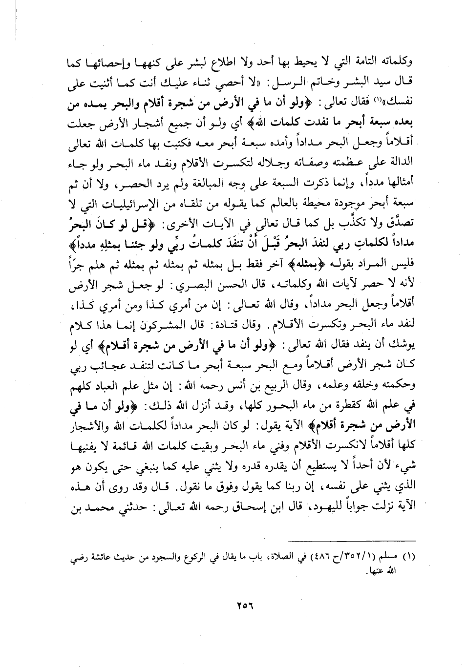 وَكَلِمَاتِهِ التَّامَّةِ الَّتِي لَا يُحِيطُ بِهَا أَحَدٌ وَلَا اطِّلَاعَ لِبَشَرٍ عَلَى كُنْهِهَا وَإِحْصَائِهَا, كَمَا قَالَ سَيِّدُ الْبَشَرِ وَخَاتَمُ الرُّسُلِ: "لَا أُحْصِي ثَنَاءً عَلَيْكَ أَنْتَ كَمَا أَثْنَيْتَ عَلَى نَفْسِكَ" 1, فَقَالَ تعالى: {وَلَوْ أَنَّمَا فِي الْأَرْضِ مِنْ شَجَرَةٍ أَقْلَامٌ وَالْبَحْرُ يَمُدُّهُ مِنْ بَعْدِهِ سَبْعَةُ أَبْحُرٍ مَا نَفِدَتْ كَلِمَاتُ اللَّهِ} أَيْ: وَلَوْ أَنَّ جَمِيعَ أَشْجَارِ الْأَرْضِ جُعِلَتْ أَقْلَامًا وَجُعِلَ الْبَحْرُ مِدَادًا وَأَمَدَّهُ سَبْعَةُ أَبْحُرٍ مَعَهُ فَكُتِبَتْ بِهَا كَلِمَاتُ اللَّهِ تَعَالَى الدَّالَّةُ عَلَى عَظْمَتِهِ وَصِفَاتِهِ وَجَلَالِهِ لَتَكَسَّرَتِ الْأَقْلَامُ وَنَفِدَ مَاءُ الْبَحْرِ وَلَوْ جَاءَ أَمْثَالُهَا مَدَدًا, وَإِنَّمَا ذُكِرَتِ السَّبْعَةُ عَلَى وَجْهِ الْمُبَالَغَةِ وَلَمْ يُرِدِ الْحَصْرَ, وَلَا أَنَّ ثَمَّ سَبْعَةَ أَبْحُرٍ مَوْجُودَةً مُحِيطَةً بِالْعَالَمِ كَمَا يَقُولُهُ مَنْ تَلَقَّاهُ مِنَ الْإِسْرَائِيلِيَّاتِ الَّتِي لَا تُصَدَّقُ وَلَا تُكَذَّبُ, بَلْ كَمَا قَالَ تَعَالَى فِي الْآيَاتِ الْأُخْرَى: {قُلْ لَوْ كَانَ الْبَحْرُ مِدَادًا لِكَلِمَاتِ رَبِّي لَنَفِدَ الْبَحْرُ قَبْلَ أَنْ تَنْفَدَ كَلِمَاتُ رَبِّي وَلَوْ جِئْنَا بِمِثْلِهِ مَدَدًا} فَلَيْسَ الْمُرَادُ بِقَوْلِهِ {بِمِثْلِهِ} آخَرَ فَقَطْ, بَلْ بِمِثْلِهِ ثُمَّ بِمِثْلِهِ ثُمَّ بِمِثْلِهِ ثُمَّ هَلُمَّ جَرًّا؛ لِأَنَّهُ لَا حَصْرَ لِآيَاتِ اللَّهِ وَكَلِمَاتِهِ, قَالَ الْحَسَنُ الْبَصْرِيُّ: لَوْ جُعِلَ شَجَرُ الْأَرْضِ أَقْلَامًا وَجُعِلَ الْبَحْرُ مِدَادًا, وَقَالَ اللَّهُ تَعَالَى: إِنَّ مِنْ أَمْرِي كَذَا وَمِنْ أَمْرِي كَذَا, لِنَفِدَ مَاءُ الْبَحْرِ وَتَكَسَّرَتِ الْأَقْلَامُ. وَقَالَ قَتَادَةُ: قَالَ الْمُشْرِكُونَ إِنَّمَا هَذَا كَلَامٌ يُوشِكُ أَنْ يَنْفَدَ, فَقَالَ اللَّهُ تعالى: {وَلَوْ أَنَّمَا فِي الْأَرْضِ مِنْ شَجَرَةٍ أَقْلَامٌ} أَيْ: لَوْ كَانَ شَجَرُ الْأَرْضِ أَقْلَامًا وَمَعَ الْبَحْرِ سَبْعَةُ أَبْحُرٍ مَا كَانَتْ لِتَنْفَدَ عَجَائِبُ رَبِّي وَحِكْمَتُهُ وَخَلْقُهُ وَعِلْمُهُ, وَقَالَ الرَّبِيعُ بْنُ أَنَسٍ رَحِمَهُ اللَّهُ: إِنَّ مَثَلَ عِلْمِ الْعِبَادِ كُلِّهِمْ فِي عِلْمِ اللَّهِ كَقَطْرَةٍ مِنْ مَاءِ الْبُحُورِ كُلِّهَا, وَقَدْ أَنْزَلَ اللَّهُ ذلك: {وَلَوْ أَنَّمَا فِي الْأَرْضِ مِنْ شَجَرَةٍ أَقْلَامٌ} الْآيَةَ يَقُولُ: لَوْ كَانَ الْبَحْرُ مِدَادًا لِكَلِمَاتِ اللَّهِ وَالْأَشْجَارُ كُلُّهَا أَقْلَامًا لَانْكَسَرَتِ الْأَقْلَامُ وَفَنِيَ مَاءُ الْبَحْرِ وَبَقِيَتْ كَلِمَاتُ اللَّهِ قَائِمَةً لَا يُفْنِيهَا شَيْءٌ؛ لِأَنَّ أَحَدًا لَا يَسْتَطِيعُ أَنْ يَقْدِرَهُ قَدْرَهُ وَلَا يُثْنِيَ عَلَيْهِ كَمَا يَنْبَغِي حَتَّى يَكُونَ هُوَ الَّذِي يُثْنِي عَلَى نَفْسِهِ, إِنَّ رَبَّنَا كَمَا يَقُولُ وَفَوْقَ مَا نَقُولُ. قَالَ: وَقَدْ رُوِيَ أَنَّ هَذِهِ الْآيَةَ نَزَلَتْ جَوَابًا لِلْيَهُودِ. قَالَ ابْنُ إِسْحَاقَ رَحِمَهُ اللَّهُ تَعَالَى: حَدَّثَنِي مُحَمَّدُ بْنُ