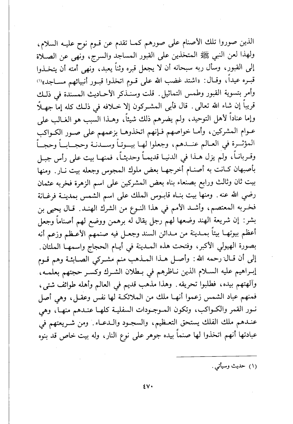 الَّذِينَ صَوَّرُوا تِلْكَ الْأَصْنَامَ عَلَى صُوَرِهِمْ كَمَا تَقَدَّمَ عَنْ قَوْمِ نُوحٍ عَلَيْهِ السَّلَامُ؛ وَلِهَذَا لَعَنَ النَّبِيُّ -صَلَّى اللَّهُ عَلَيْهِ وَسَلَّمَ- الْمُتَّخِذِينَ عَلَى الْقُبُورِ الْمَسَاجِدَ وَالسُّرُجَ, وَنَهَى عَنِ الصَّلَاةِ إِلَى الْقُبُورِ, وَسَأَلَ رَبَّهُ سُبْحَانَهُ أَنْ لَا يَجْعَلَ قَبْرَهُ وَثَنًا يُعْبَدُ, وَنَهَى أُمَّتَهُ أَنْ يَتَّخِذُوا قَبْرَهُ عِيدًا, وَقَالَ: "اشْتَدَّ غَضَبُ اللَّهِ عَلَى قَوْمٍ اتَّخَذُوا قُبُورَ أَنْبِيَائِهِمْ مَسَاجِدَ" 1 وَأَمَرَ بِتَسْوِيَةِ الْقُبُورِ وَطَمْسِ التَّمَاثِيلِ. قُلْتُ: وَسَنَذْكُرُ الْأَحَادِيثَ الْمُسْنَدَةَ فِي ذَلِكَ قَرِيبًا إِنْ شَاءَ اللَّهُ تَعَالَى. قَالَ: فَأَبَى الْمُشْرِكُونَ إِلَّا خِلَافَهُ فِي ذَلِكَ كُلِّهِ, إِمَّا جَهْلًا وَإِمَّا عِنَادًا لِأَهْلِ التَّوْحِيدِ, وَلَمْ يَضُرُّهُمْ ذَلِكَ شَيْئًا وَهَذَا السَّبَبُ هُوَ الْغَالِبُ عَلَى عَوَامِّ الْمُشْرِكِينَ, وَأَمَّا خَوَاصُّهُمْ فَإِنَّهُمُ اتَّخَذُوهَا بِزَعْمِهِمْ عَلَى صُوَرِ الْكَوَاكِبِ الْمُؤَثِّرَةِ فِي الْعَالَمِ عِنْدَهُمْ, وَجَعَلُوا لَهَا بُيُوتًا وَسَدَنَةً وَحُجَّابًا وَحَجًّا وَقُرْبَانًا, وَلَمْ يَزَلْ هَذَا فِي الدُّنْيَا قَدِيمًا وَحَدِيثًا؛ فَمِنْهَا بَيْتٌ عَلَى رَأْسِ جَبَلٍ بِأَصْبَهَانَ كَانَتْ بِهِ أَصْنَامٌ أَخْرَجَهَا بَعْضُ مُلُوكِ الْمَجُوسِ وَجَعَلَهُ بَيْتَ نَارٍ, وَمِنْهَا بَيْتٌ ثَانٍ وَثَالِثٌ وَرَابِعٌ بِصَنْعَاءَ بَنَاهُ بَعْضُ الْمُشْرِكِينَ عَلَى اسْمِ الزُّهْرَةِ فَخَرَّبَهُ عُثْمَانُ رَضِيَ اللَّهُ عَنْهُ. وَمِنْهَا بَيْتٌ بَنَاهُ قَابُوسٌ الْمَلِكُ عَلَى اسْمِ الشَّمْسِ بِمَدِينَةِ فَرْغَانَةَ, فَخَرَّبَهُ الْمُعْتَصِمُ, وَأَشَدُّ الْأُمَمِ فِي هَذَا النَّوْعِ مِنَ الشِّرْكِ الْهِنْدُ. قَالَ يَحْيَى بْنُ بِشْرٍ: إِنَّ شَرِيعَةَ الْهِنْدِ وَضَعَهَا لَهُمْ رَجُلٌ يُقَالُ لَهُ: بَرْهُمَنْ وَوَضَعَ لَهُمْ أَصْنَامًا وَجَعَلَ أَعْظَمَ بُيُوتِهَا بَيْتًا بِمَدِينَةٍ مِنْ مَدَائِنِ السِّنْدِ, وَجَعَلَ فِيهِ صَنَمَهُمُ الْأَعْظَمَ وَزَعَمَ أَنَّهُ بِصُورَةِ الْهُيُولِي الْأَكْبَرِ, وَفُتِحَتْ هَذِهِ الْمَدِينَةُ فِي أَيَّامِ الْحَجَّاجِ وَاسْمُهَا الْمِلْتَانُ. إِلَى أَنْ قَالَ رَحِمَهُ اللَّهُ: وَأَصْلُ هَذَا الْمَذْهَبِ مِنْ مُشْرِكِي الصَّابِئَةِ وَهُمْ قَوْمُ إِبْرَاهِيمَ -عَلَيْهِ السَّلَامُ- الَّذِينَ نَاظَرَهُمْ فِي بُطْلَانِ الشِّرْكِ وَكَسَرَ حُجَّتَهُمْ بِعَمَلِهِ, وَآلِهَتَهُمْ بِيَدِهِ فَطَلَبُوا تَحْرِيقَهُ. وَهَذَا مَذْهَبٌ قَدِيمٌ فِي الْعَالَمِ وَأَهْلُهُ طَوَائِفُ شَتَّى فَمِنْهُمْ عُبَّادُ الشَّمْسِ زَعَمُوا أَنَّهَا مَلَكٌ مِنَ الْمَلَائِكَةِ لَهَا نَفْسٌ وَعَقْلٌ, وَهِيَ أَصْلُ نُورِ الْقَمَرِ وَالْكَوَاكِبِ, وَتَكُونُ الْمَوْجُودَاتُ السُّفْلِيَّةُ كُلُّهَا عِنْدَهُمْ مِنْهَا, وَهِيَ عِنْدَهُمْ مَلَكُ الْفَلَكِ يَسْتَحِقُّ التَّعْظِيمَ وَالسُّجُودَ وَالدُّعَاءَ. وَمِنْ شَرِيعَتِهِمْ فِي عِبَادَتِهَا أَنَّهُمُ اتَّخَذُوا لَهَا صَنَمًا بِيَدِهِ جَوْهَرٌ عَلَى نَوْعِ النَّارِ, وَلَهُ بَيْتٌ خَاصٌّ قَدْ بَنَوْهُ