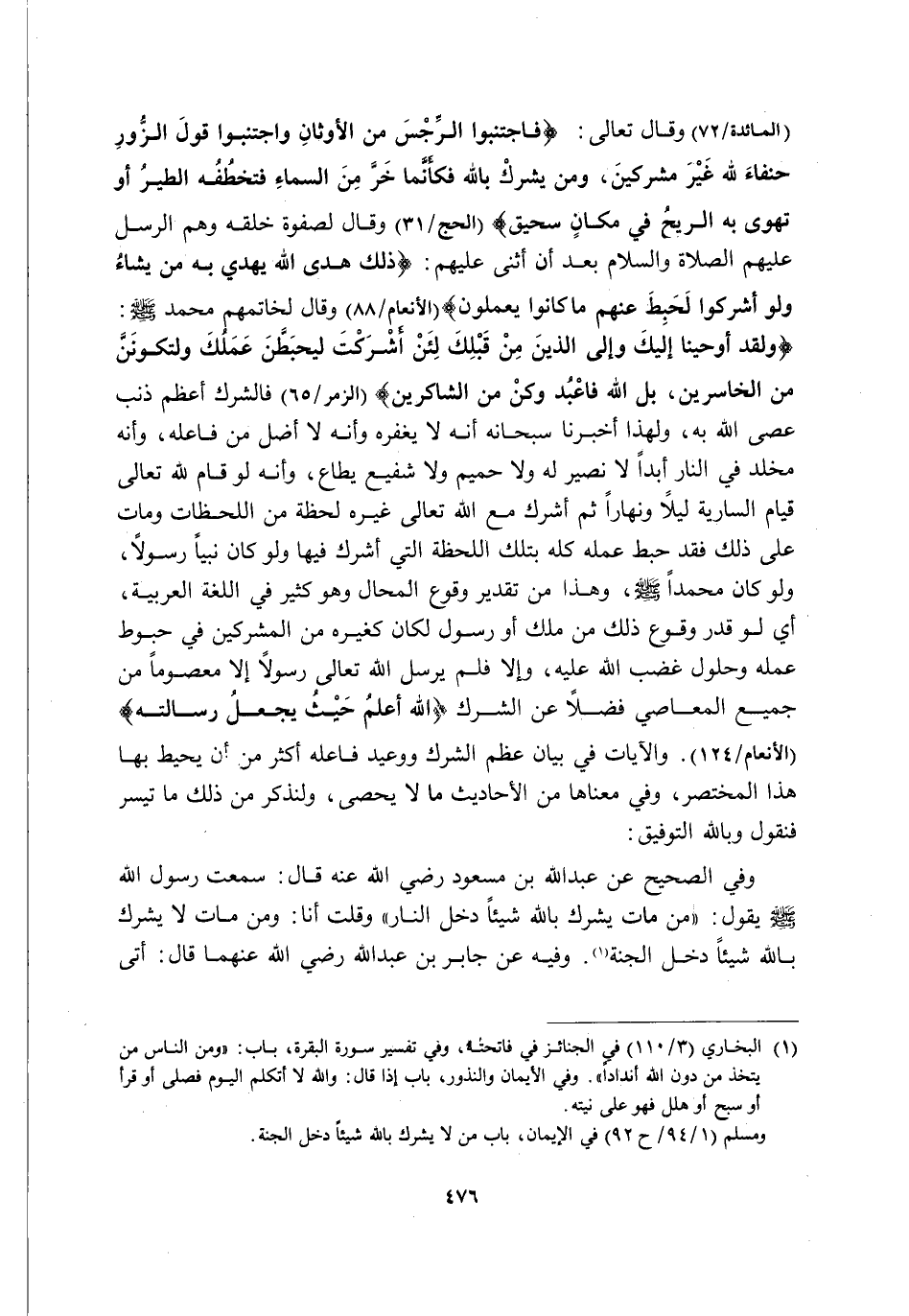 [الْمَائِدَةِ: 72] ، وَقَالَ تَعَالَى: {فَاجْتَنِبُوا الرِّجْسَ مِنَ الْأَوْثَانِ وَاجْتَنِبُوا قَوْلَ الزُّورِ، حُنَفَاءَ لِلَّهِ غَيْرَ مُشْرِكِينَ بِهِ وَمَنْ يُشْرِكْ بِاللَّهِ فَكَأَنَّمَا خَرَّ مِنَ السَّمَاءِ فَتَخْطَفُهُ الطَّيْرُ أَوْ تَهْوِي بِهِ الرِّيحُ فِي مَكَانٍ سَحِيقٍ} [الْحَجِّ: 31] ، وَقَالَ لِصَفْوَةِ خَلْقِهِ وَهُمُ الرُّسُلُ -عَلَيْهِمُ الصَّلَاةُ وَالسَّلَامُ- بَعْدَ أَنْ أَثْنَى عَلَيْهِمْ: {ذَلِكَ هُدَى اللَّهِ يَهْدِي بِهِ مَنْ يَشَاءُ مِنْ عِبَادِهِ وَلَوْ أَشْرَكُوا لَحَبِطَ عَنْهُمْ مَا كَانُوا يَعْمَلُونَ} [الْأَنْعَامِ: 88] ، وَقَالَ لِخَاتَمِهِمْ مُحَمَّدٍ صَلَّى اللَّهُ عَلَيْهِ وَسَلَّمَ: {وَلَقَدْ أُوحِيَ إِلَيْكَ وَإِلَى الَّذِينَ مِنْ قَبْلِكَ لَئِنْ أَشْرَكْتَ لَيَحْبَطَنَّ عَمَلُكَ وَلَتَكُونَنَّ مِنَ الْخَاسِرِينَ، بَلِ اللَّهَ فَاعْبُدْ وَكُنْ مِنَ الشَّاكِرِينَ} [الزُّمَرِ: 65] ، فَالشِّرْكُ أَعْظَمُ ذَنْبٍ عُصِيَ اللَّهُ بِهِ؛ وَلِهَذَا أَخْبَرَنَا سُبْحَانَهُ أَنَّهُ لَا يَغْفِرُهُ وَأَنَّهُ لَا أَضَلَّ مِنْ فَاعِلِهِ, وَأَنَّهُ مُخَلَّدٌ فِي النَّارِ أَبَدًا لَا نَصِيرَ لَهُ وَلَا حَمِيمَ وَلَا شَفِيعَ يُطَاعُ, وَأَنَّهُ لَوْ قَامَ لِلَّهِ تَعَالَى قِيَامَ السَّارِيَةِ لَيْلًا وَنَهَارًا ثُمَّ أَشْرَكَ مَعَ اللَّهِ تَعَالَى غَيْرَهُ لَحْظَةً مِنَ اللَّحَظَاتِ وَمَاتَ عَلَى ذَلِكَ, فَقَدْ حَبِطَ عَمَلُهُ كُلُّهُ بِتِلْكَ اللَّحْظَةِ الَّتِي أَشْرَكَ فِيهَا وَلَوْ كَانَ نَبِيًّا رَسُولًا, وَلَوْ كَانَ مُحَمَّدًا صَلَّى اللَّهُ عَلَيْهِ وَسَلَّمَ, وَهَذَا مِنْ تَقْدِيرِ وُقُوعِ الْمُحَالِ وَهُوَ كَثِيرٌ فِي اللُّغَةِ الْعَرَبِيَّةِ, أَيْ: لَوْ قُدِّرَ وُقُوعُ ذَلِكَ مِنْ مَلَكٍ أَوْ رَسُولٍ لَكَانَ كَغَيْرِهِ مِنَ الْمُشْرِكِينَ فِي حُبُوطِ عَمَلِهِ وَحُلُولِ غَضَبِ اللَّهِ عَلَيْهِ, وَإِلَّا فَلَمْ يُرْسِلِ اللَّهُ تَعَالَى رَسُولًا إِلَّا مَعْصُومًا مِنْ جَمِيعِ الْمَعَاصِي فَضْلًا عَنِ الشِّرْكِ {اللَّهُ أَعْلَمُ حَيْثُ يَجْعَلُ رِسَالَتَهُ} [الْأَنْعَامِ: 124] وَالْآيَاتُ فِي بَيَانِ عِظَمِ الشِّرْكِ وَوَعِيدِ فَاعِلِهِ أَكْثَرُ مِنْ أَنْ يُحِيطَ بِهَا هَذَا الْمُخْتَصَرُ, وَفِي مَعْنَاهَا مِنَ الْأَحَادِيثِ مَا لَا يُحْصَى, وَلْنَذْكُرْ مِنْ ذَلِكَ مَا تَيَسَّرَ فَنَقُولُ وَبِاللَّهِ التَّوْفِيقُ: