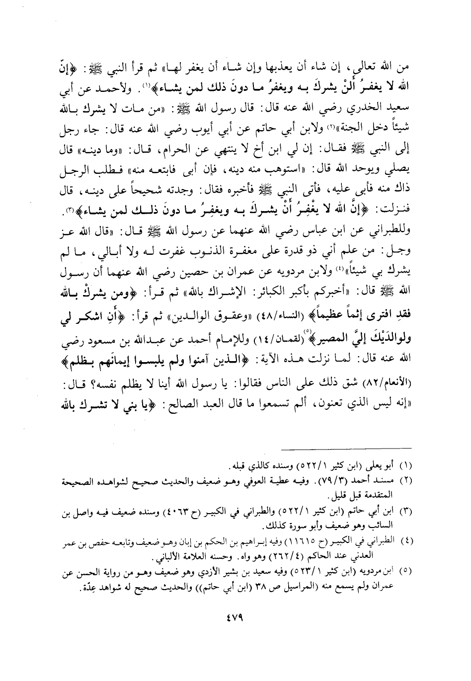 مِنَ اللَّهِ تَعَالَى, إِنْ شَاءَ أَنْ يُعَذِّبَهَا وَإِنْ شَاءَ أَنْ يَغْفِرَ لَهَا" ثُمَّ قَرَأَ النَّبِيُّ صَلَّى اللَّهُ عَلَيْهِ وَسَلَّمَ: {إِنَّ اللَّهَ لَا يَغْفِرُ أَنْ يُشْرَكَ بِهِ وَيَغْفِرُ مَا دُونَ ذَلِكَ لِمَنْ يَشَاءُ} 1. وَلِأَحْمَدَ عَنْ أَبِي سَعِيدٍ الْخُدْرِيِّ رَضِيَ اللَّهُ عَنْهُ قَالَ: قَالَ رَسُولُ اللَّهِ صَلَّى اللَّهُ عَلَيْهِ وَسَلَّمَ: "مَنْ مَاتَ لَا يُشْرِكُ بِاللَّهِ شَيْئًا دَخَلَ الْجَنَّةَ" 2 وَلِابْنِ أَبِي حَاتِمٍ عَنْ أَبِي أَيُّوبَ رَضِيَ اللَّهُ عَنْهُ قَالَ: جَاءَ رَجُلٌ إِلَى النَّبِيِّ صَلَّى اللَّهُ عَلَيْهِ وَسَلَّمَ فَقَالَ: إِنَّ لِي ابْنَ أَخٍ لَا يَنْتَهِي عَنِ الْحَرَامِ قَالَ: "وَمَا دِينُهُ"؟ قَالَ: يُصَلِّي وَيُوَحِّدُ اللَّهَ قَالَ: "اسْتَوْهِبْ مِنْهُ دِينَهُ, فَإِنْ أَبَى فَابْتَعْهُ مِنْهُ" فَطَلَبَ الرَّجُلُ ذَاكَ مِنْهُ فَأَبَى عَلَيْهِ فَأَتَى النَّبِيَّ صَلَّى اللَّهُ عَلَيْهِ وَسَلَّمَ, فَأَخْبَرَهُ فَقَالَ: وَجَدْتُهُ شَحِيحًا عَلَى دِينِهِ قَالَ: فَنَزَلَتْ: {إِنَّ اللَّهَ لَا يَغْفِرُ أَنْ يُشْرَكَ بِهِ وَيَغْفِرُ مَا دُونَ ذَلِكَ لِمَنْ يَشَاءُ} 3. وَلِلطَّبَرَانِيِّ عَنِ ابْنِ عَبَّاسٍ رَضِيَ اللَّهُ عَنْهُمَا عَنْ رَسُولِ اللَّهِ صَلَّى اللَّهُ عَلَيْهِ وَسَلَّمَ قَالَ: "قَالَ اللَّهُ عَزَّ وَجَلَّ: مَنْ عَلِمَ أَنِّي ذُو قُدْرَةٍ عَلَى مَغْفِرَةِ الذُّنُوبِ غَفَرْتُ لَهُ وَلَا أُبَالِي, مَا لَمْ يُشْرِكْ بِي شَيْئًا"4. وَلِابْنِ مَرْدَوَيْهِ عَنْ عِمْرَانَ بْنِ حُصَيْنٍ رَضِيَ اللَّهُ عَنْهُمَا أَنَّ رَسُولَ اللَّهِ صَلَّى اللَّهُ عَلَيْهِ وَسَلَّمَ قَالَ: "أُخْبِرُكُمْ بِأَكْبَرِ الْكَبَائِرِ: الْإِشْرَاكُ بِاللَّهِ ثُمَّ قَرَأَ: {وَمَنْ يُشْرِكْ بِاللَّهِ فَقَدِ افْتَرَى إِثْمًا عَظِيمًا} وَعُقُوقُ الْوَالِدَيْنِ ثُمَّ قَرَأَ: {أَنِ اشْكُرْ لِي وَلِوَالِدَيْكَ إِلَيَّ الْمَصِيرُ} 5 [لُقْمَانَ: 14] " وَلِلْإِمَامِ أَحْمَدَ عَنْ عَبْدِ اللَّهِ بْنِ مَسْعُودٍ رَضِيَ اللَّهُ عَنْهُ قَالَ: لَمَّا نَزَلَتْ هَذِهِ الْآيَةُ: {الَّذِينَ آمَنُوا وَلَمْ يَلْبِسُوا إِيمَانَهُمْ بِظُلْمٍ} [الْأَنْعَامِ: 82] شَقَّ ذَلِكَ عَلَى النَّاسِ فَقَالُوا: يَا رَسُولَ اللَّهِ أَيُّنَا لَا يَظْلِمُ نَفْسَهُ؟ قَالَ: "إِنَّهُ لَيْسَ الَّذِي تَعْنُونُ, أَلَمْ تَسْمَعُوا مَا قَالَ العبد الصالح: {يَا بُنَيَّ لَا تُشْرِكْ بِاللَّهِ