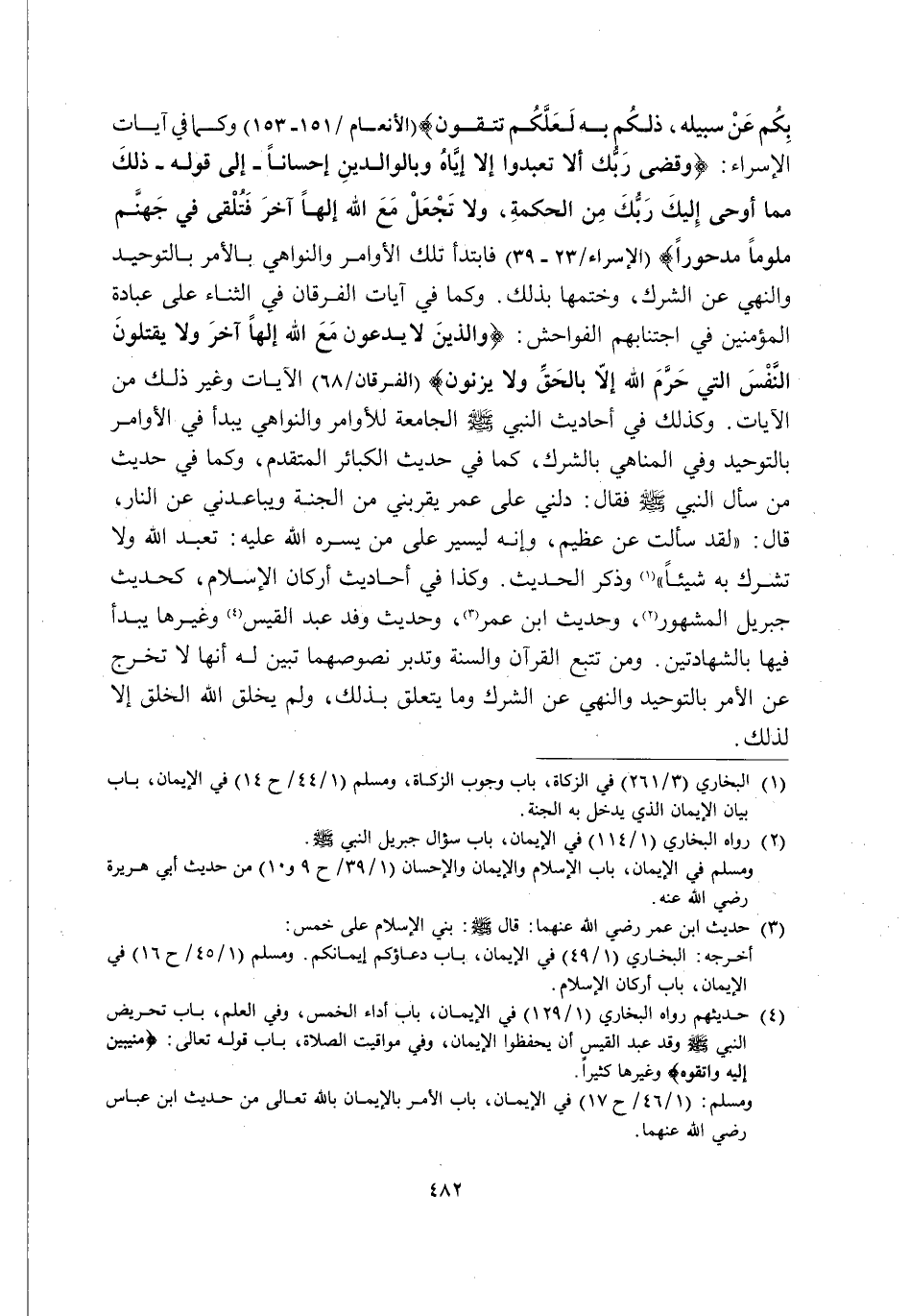 بِكُمْ عَنْ سَبِيلِهِ ذَلِكُمْ وَصَّاكُمْ بِهِ لَعَلَّكُمْ تَتَّقُونَ} [الْأَنْعَامِ: 151-153] ، وَكَمَا فِي آيَاتِ الْإِسْرَاءِ: {وَقَضَى رَبُّكَ أَلَّا تَعْبُدُوا إِلَّا إِيَّاهُ وَبِالْوَالِدَيْنِ إِحْسَانًا} إِلَى قَوْلِهِ: {ذَلِكَ مِمَّا أَوْحَى إِلَيْكَ رَبُّكَ مِنَ الْحِكْمَةِ وَلَا تَجْعَلْ مَعَ اللَّهِ إِلَهًا آخَرَ فَتُلْقَى فِي جَهَنَّمَ مَلُومًا مَدْحُورًا} [الْإِسْرَاءِ: 23-39] فَابْتَدَأَ تِلْكَ الْأَوَامِرَ وَالنَّوَاهِيَ بِالْأَمْرِ بِالتَّوْحِيدِ وَالنَّهْيِ عَنِ الشِّرْكِ وَخَتَمَهَا بِذَلِكَ, وَكَمَا فِي آيَاتِ الْفُرْقَانِ فِي الثَّنَاءِ عَلَى عِبَادِهِ الْمُؤْمِنِينَ فِي اجْتِنَابِهِمُ الْفَوَاحِشَ: {وَالَّذِينَ لَا يَدْعُونَ مَعَ اللَّهِ إِلَهًا آخَرَ وَلَا يَقْتُلُونَ النَّفْسَ الَّتِي حَرَّمَ اللَّهُ إِلَّا بِالْحَقِّ وَلَا يَزْنُونَ} [الْفَرْقَانِ: 68] الْآيَاتِ, وَغَيْرَ ذَلِكَ مِنَ الْآيَاتِ. وَكَذَلِكَ فِي أَحَادِيثِ النَّبِيِّ -صَلَّى اللَّهُ عَلَيْهِ وَسَلَّمَ- الْجَامِعَةِ لِلْأَوَامِرِ وَالنَّوَاهِي يَبْدَأُ فِي الْأَوَامِرِ بِالتَّوْحِيدِ وَفِي الْمَنَاهِي بِالشِّرْكِ, كَمَا فِي حَدِيثِ الْكَبَائِرِ الْمُتَقَدِّمِ وَكَمَا فِي حَدِيثِ مَنْ سَأَلَ النَّبِيَّ صَلَّى اللَّهُ عَلَيْهِ وَسَلَّمَ فَقَالَ: دُلَّنِي عَلَى عَمَلٍ يُقَرِّبُنِي مِنَ الْجَنَّةِ وَيُبَاعِدُنِي عَنِ النَّارِ, قَالَ: "لَقَدْ سَأَلْتَ عَنْ عَظِيمٍ, وَإِنَّهُ لَيَسِيرٌ عَلَى مَنْ يَسَّرَهُ اللَّهُ عَلَيْهِ: تَعْبُدُ اللَّهَ وَلَا تُشْرِكُ بِهِ شَيْئًا" 1 وَذَكَرَ الْحَدِيثَ. وَكَذَا فِي أَحَادِيثِ أَرْكَانِ الْإِسْلَامِ وَكَحَدِيثِ جِبْرِيلَ الْمَشْهُورِ2 وَحَدِيثِ ابْنِ عُمَرَ3 وَحَدِيثِ وَفْدِ عَبْدِ الْقَيْسِ4 وَغَيْرِهَا, يَبْدَأُ فيها بالشهادتين. ومع تَتَبَّعَ الْقُرْآنَ وَالسُّنَّةَ وَتَدَبَّرَ نُصُوصَهُمَا تَبَيَّنَ لَهُ أَنَّهَا لَا تَخْرُجُ عَنِ الْأَمْرِ بِالتَّوْحِيدِ وَالنَّهْيِ عَنِ الشِّرْكِ وَمَا يَتَعَلَّقُ بِذَلِكَ, وَلَمْ يَخْلُقِ اللَّهُ الْخَلْقَ إِلَّا لِذَلِكَ.