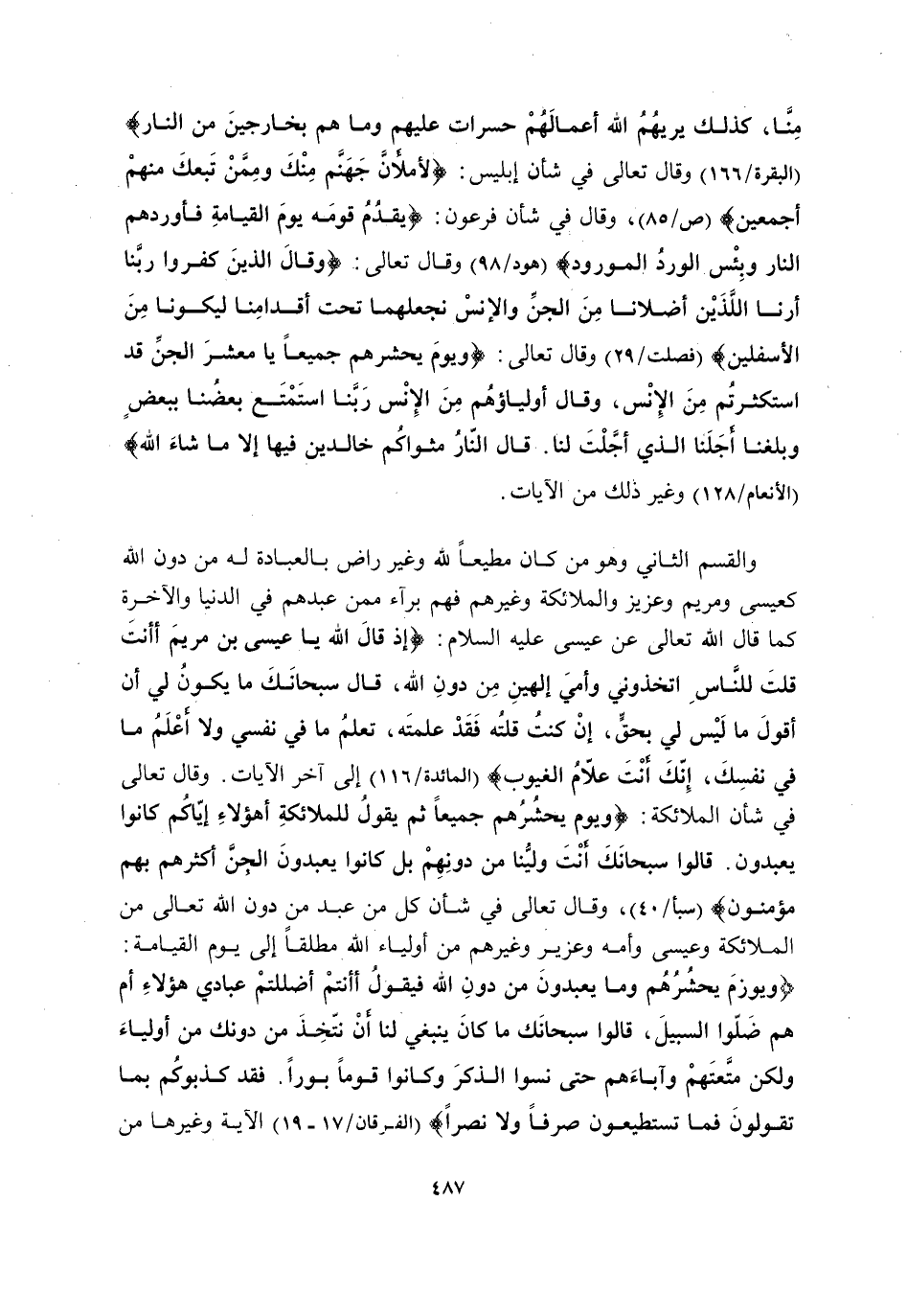 وَالْقَسَمُ الثَّانِي وَهُوَ مَنْ كَانَ مُطِيعًا لِلَّهِ وَغَيْرَ رَاضٍ بِالْعِبَادَةِ لَهُ مِنْ دُونِ اللَّهِ كَعِيسَى وَمَرْيَمَ وَعُزَيْرٍ وَالْمَلَائِكَةِ وَغَيْرِهِمْ, فَهُمْ بُرَآءُ مِمَّنْ عَبَدَهُمْ فِي الدُّنْيَا وَالْآخِرَةِ كَمَا قَالَ اللَّهُ تَعَالَى عَنْ عِيسَى عَلَيْهِ السَّلَامُ: {وَإِذْ قَالَ اللَّهُ يَا عِيسَى ابْنَ مَرْيَمَ أَأَنْتَ قُلْتَ لِلنَّاسِ اتَّخِذُونِي وَأُمِّيَ إِلَهَيْنِ مِنْ دُونِ اللَّهِ قَالَ سُبْحَانَكَ مَا يَكُونُ لِي أَنْ أَقُولَ مَا لَيْسَ لِي بِحَقٍّ إِنْ كُنْتُ قُلْتُهُ فَقَدْ عَلِمْتَهُ تَعْلَمُ مَا فِي نَفْسِي وَلَا أَعْلَمُ مَا فِي نَفْسِكَ إِنَّكَ أَنْتَ عَلَّامُ الْغُيُوبِ} [الْمَائِدَةِ: 116] إِلَى آخِرِ الْآيَاتِ, وَقَالَ تَعَالَى فِي شَأْنِ الْمَلَائِكَةِ: {وَيَوْمَ يَحْشُرُهُمْ جَمِيعًا ثُمَّ يَقُولُ لِلْمَلَائِكَةِ أَهَؤُلَاءِ إِيَّاكُمْ كَانُوا يَعْبُدُونَ، قَالُوا سُبْحَانَكَ أَنْتَ وَلِيُّنَا مِنْ دُونِهِمْ بَلْ كَانُوا يَعْبُدُونَ الْجِنَّ أَكْثَرُهُمْ بِهِمْ مُؤْمِنُونَ} [سَبَأٍ: 40] ، وَقَالَ تَعَالَى فِي شَأْنِ كُلِّ مَنْ عُبِدَ مِنْ دُونِ اللَّهِ تَعَالَى مِنَ الْمَلَائِكَةِ وَعِيسَى وَأُمِّهِ وَعُزَيْرٍ وَغَيْرِهِمْ مِنْ أَوْلِيَاءِ اللَّهِ مُطْلَقًا إِلَى يَوْمِ الْقِيَامَةِ: {وَيَوْمَ يَحْشُرُهُمْ وَمَا يَعْبُدُونَ مِنْ دُونِ اللَّهِ فَيَقُولُ أَأَنْتُمْ أَضْلَلْتُمْ عِبَادِي هَؤُلَاءِ أَمْ هُمْ ضَلُّوا السَّبِيلَ، قَالُوا سُبْحَانَكَ مَا كَانَ يَنْبَغِي لَنَا أَنْ نَتَّخِذَ مِنْ دُونِكَ مِنْ أَوْلِيَاءَ وَلَكِنْ مَتَّعْتَهُمْ وَآبَاءَهُمْ حَتَّى نَسُوا الذِّكْرَ وَكَانُوا قَوْمًا بُورًا، فَقَدْ كَذَّبُوكُمْ بِمَا تَقُولُونَ فَمَا تَسْتَطِيعُونَ صَرْفًا وَلَا نَصْرًا} [الْفَرْقَانِ: 17-19] ، الْآيَةَ وَغَيْرَهَا مِنَ