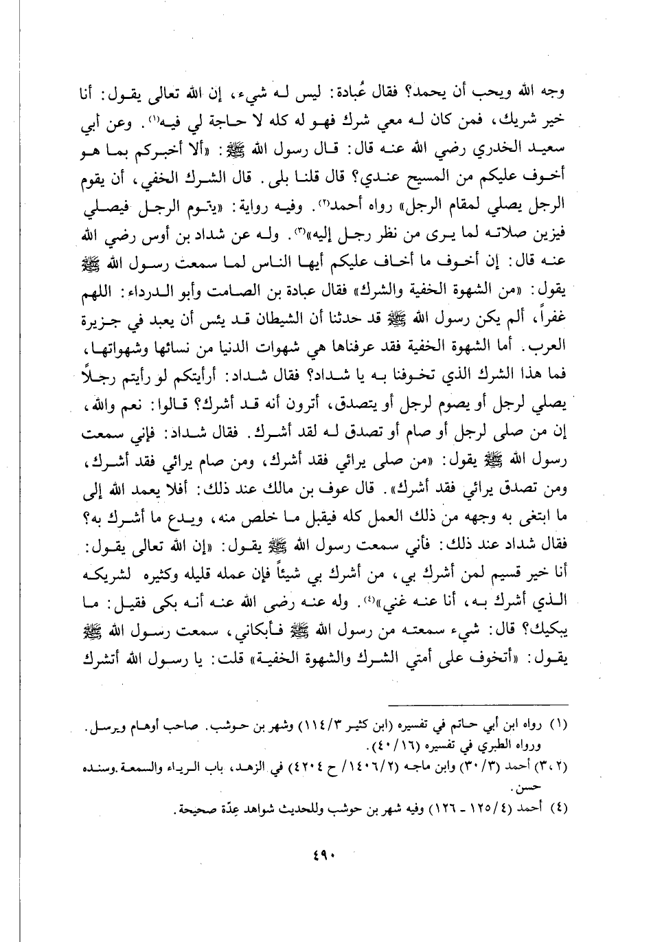 وَجْهَ اللَّهِ وَيُحِبُّ أَنْ يُحْمَدَ؟ فَقَالَ عُبَادَةُ: لَيْسَ لَهُ شَيْءٌ, إِنَّ اللَّهَ تَعَالَى يَقُولُ: "أَنَا خَيْرُ شَرِيكٍ, فَمَنْ كَانَ له معي شريك فَهُوَ لَهُ كُلُّهُ لَا حَاجَةَ لِي فِيهِ"1. وَعَنْ أَبِي سَعِيدٍ الْخُدْرِيِّ -رَضِيَ اللَّهُ عَنْهُ- قَالَ: قَالَ رَسُولُ اللَّهِ صَلَّى اللَّهُ عَلَيْهِ وَسَلَّمَ: "أَلَا أُخْبِرُكُمْ بِمَا هُوَ أَخْوَفُ عَلَيْكُمْ مِنَ الْمَسِيحِ عِنْدِي "؟ قَالَ: قُلْنَا: بَلَى قَالَ: "الشِّرْكُ الْخَفِيُّ, أَنْ يَقُومَ الرَّجُلُ يُصَلِّي لِمَقَامِ الرَّجُلِ" رَوَاهُ أَحْمَدُ2. وَفِيهِ رِوَايَةٌ: "يَقُومُ الرَّجُلُ فَيُصَلِّي فَيُزَيِّنُ صَلَاتَهُ لِمَا يَرَى مِنْ نَظَرِ الرَّجُلِ إِلَيْهِ"3. وَلَهُ عَنْ شَدَّادِ بْنِ أَوْسٍ رَضِيَ اللَّهُ عَنْهُ قَالَ: إِنْ أَخْوَفَ مَا أَخَافُ عَلَيْكُمْ أيها الناس ما سَمِعْتُ رَسُولَ اللَّهِ -صَلَّى اللَّهُ عَلَيْهِ وَسَلَّمَ- يَقُولُ: "مِنَ الشَّهْوَةِ الْخَفِيَّةِ وَالشِّرْكِ" فَقَالَ عُبَادَةُ بْنُ الصَّامِتِ وَأَبُو الدَّرْدَاءِ: اللَّهُمَّ غُفْرًا, أَلَمْ يَكُنْ رَسُولُ اللَّهِ صَلَّى اللَّهُ عَلَيْهِ وَسَلَّمَ قَدْ حَدَّثَنَا أَنَّ الشَّيْطَانَ قَدْ يَئِسَ أَنْ يُعْبَدَ فِي جَزِيرَةِ الْعَرَبِ, أَمَّا الشَّهْوَةُ الْخَفِيَّةُ فَقَدْ عَرِفْنَاهَا هِيَ شَهَوَاتُ الدُّنْيَا مِنْ نِسَائِهَا وَشَهَوَاتِهَا, فَمَا هَذَا الشِّرْكُ الَّذِي تُخَوِّفُنَا بِهِ يَا شَدَّادُ؟ فَقَالَ شَدَّادٌ: أَرَأَيْتَكُمْ لَوْ رَأَيْتُمْ رَجُلًا يُصَلِّي لِرَجُلٍ أَوْ يَصُومُ لِرَجُلٍ أَوْ يَتَصَدَّقُ, أَتَرَوْنَ أَنَّهُ قَدْ أَشْرَكَ؟ قَالُوا: نَعَمْ وَاللَّهِ, إِنَّ مَنْ صَلَّى لِرَجُلٍ أَوْ صَامَ أَوْ تَصَدَّقَ لَهُ لَقَدْ أَشْرَكَ. فَقَالَ شَدَّادٌ: فَإِنِّي سَمِعْتُ رَسُولَ اللَّهِ -صَلَّى اللَّهُ عَلَيْهِ وَسَلَّمَ- يَقُولُ: "مَنْ صَلَّى يُرَائِي فَقَدْ أَشْرَكَ, وَمَنْ صَامَ يُرَائِي فَقَدْ أَشْرَكَ, وَمَنْ تَصَدَّقَ يُرَائِي فَقَدْ أَشْرَكَ" قَالَ عَوْفُ بْنُ مَالِكٍ عِنْدَ ذَلِكَ: أَفَلَا يَعْمِدُ اللَّهُ إِلَى مَا ابْتُغِيَ بِهِ وَجْهُهُ مِنْ ذَلِكَ الْعَمَلِ كُلِّهِ, فَيَقْبَلُ مَا خَلَصَ مِنْهُ وَيَدَعُ مَا أُشْرِكَ بِهِ؟ فَقَالَ شَدَّادُ عِنْدَ ذَلِكَ: فَإِنِّي سَمِعْتُ رَسُولَ اللَّهِ -صَلَّى اللَّهُ عَلَيْهِ وَسَلَّمَ- يَقُولُ: "إِنَّ اللَّهَ تَعَالَى يَقُولُ: أَنَا خَيْرُ قَسِيمٍ لِمَنْ أَشْرَكَ بِي, مَنْ أَشْرَكَ بِي شَيْئًا فَإِنَّ عَمَلَهُ قَلِيلَهُ وَكَثِيرَهُ لِشَرِيكِهِ الَّذِي أَشْرَكَ بِهِ, أَنَا عَنْهُ غَنِيٌّ" 4. وَلَهُ عَنْهُ رَضِيَ اللَّهُ عَنْهُ أَنَّهُ بَكَى فَقِيلَ: مَا يُبْكِيكَ؟ قَالَ: شَيْءٌ سَمِعْتُهُ مِنْ رَسُولِ اللَّهِ صَلَّى اللَّهُ عَلَيْهِ وَسَلَّمَ, فَأَبْكَانِي, سَمِعْتُ رَسُولَ اللَّهِ -صَلَّى اللَّهُ عَلَيْهِ وَسَلَّمَ- يَقُولُ: "أَتَخَوَّفُ عَلَى أُمَّتِي: الشِّرْكَ وَالشَّهْوَةَ الْخَفِيَّةَ" قُلْتُ: يَا رَسُولَ اللَّهِ أَتُشْرِكُ