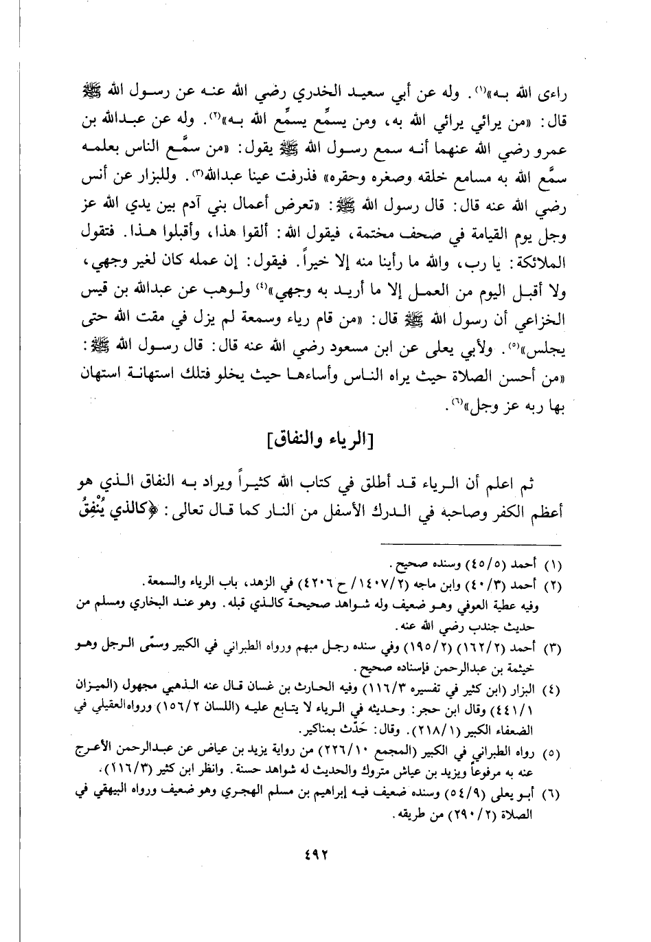 ثُمَّ اعْلَمْ أَنَّ الرِّيَاءَ قَدْ أُطْلِقَ فِي كِتَابِ اللَّهِ كَثِيرًا, وَيُرَادُ بِهِ النِّفَاقُ الَّذِي هُوَ أَعْظَمُ الْكُفْرِ وَصَاحِبُهُ فِي الدَّرْكِ الْأَسْفَلِ مِنَ النَّارِ, كَمَا قَالَ تَعَالَى: {كَالَّذِي يُنْفِقُ