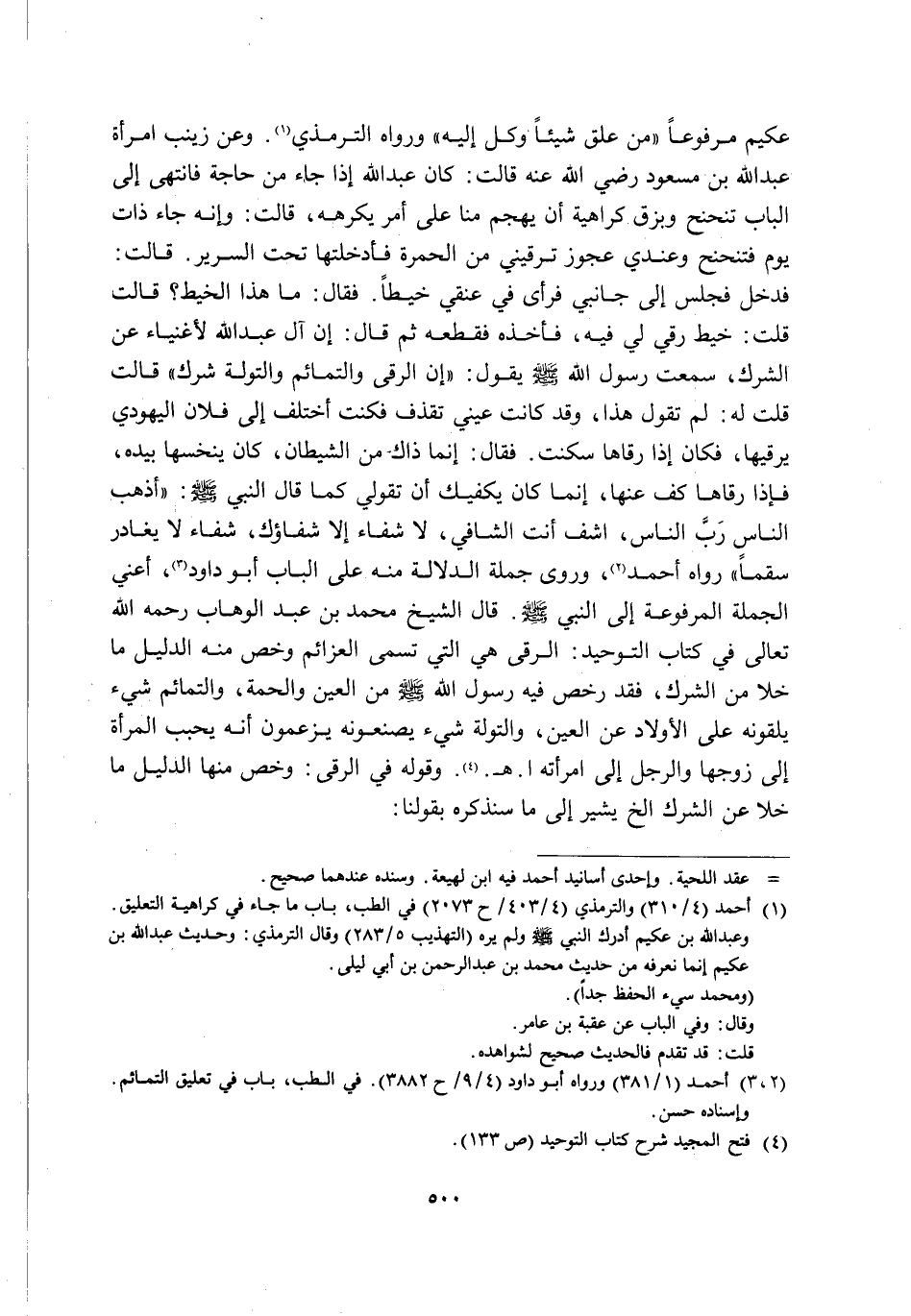 عُكَيْمٍ مَرْفُوعًا: "مَنْ عَلَّقَ شَيْئًا وُكِّلَ إِلَيْهِ" وَرَوَاهُ التِّرْمِذِيُّ1. وَعَنْ زَيْنَبَ امْرَأَةِ عَبْدِ اللَّهِ بْنِ مَسْعُودٍ -رَضِيَ اللَّهُ عَنْهُ- قَالَتْ: كَانَ عَبْدُ اللَّهِ إِذَا جَاءَ مِنْ حَاجَةٍ فَانْتَهَى إِلَى الْبَابِ تَنَحْنَحَ وَبَزَقَ كَرَاهِيَةَ أَنْ يَهْجُمَ مِنَّا عَلَى أَمْرٍ يَكْرَهُهُ, قَالَتْ: وَإِنَّهُ جَاءَ ذَاتَ يَوْمٍ فَتَنَحْنَحَ وَعِنْدِي عَجُوزٌ تَرْقِينِي مِنَ الْحُمْرَةِ, فَأَدْخَلْتُهَا تَحْتَ السَّرِيرِ, قَالَتْ: فَدَخَلَ فَجَلَسَ إِلَى جَانِبِي فَرَأَى فِي عُنُقِي خَيْطًا فَقَالَ: مَا هَذَا الْخَيْطُ؟ قَالَتْ: قُلْتُ: خَيْطٌ رُقِيَ لِي فِيهِ, فَأَخَذَهُ فَقَطَعَهُ ثُمَّ قَالَ: إِنَّ آلَ عَبْدِ اللَّهِ لَأَغْنِيَاءُ عَنِ الشِّرْكِ, سَمِعْتُ رَسُولَ اللَّهِ -صَلَّى اللَّهُ عَلَيْهِ وَسَلَّمَ- يَقُولُ: "إِنَّ الرُّقَى وَالتَّمَائِمَ وَالتِّوَلَةَ شِرْكٌ" قَالَتْ: قُلْتُ لَهُ: لِمَ تَقُولُ هَذَا وَقَدْ كَانَتْ عَيْنِي تَقْذِفُ فَكُنْتُ أَخْتَلِفُ إِلَى فُلَانٍ الْيَهُودِيِّ يَرْقِيهَا, فَكَانَ إِذَا رَقَاهَا سَكَنَتْ؟! فَقَالَ: إِنَّمَا ذَاكَ مِنَ الشَّيْطَانِ, كَانَ يَنْخَسُهَا بِيَدِهِ فَإِذَا رَقَاهَا كَفَّ عَنْهَا, إِنَّمَا كَانَ يَكْفِيكِ أَنْ تَقُولِي كَمَا قَالَ النَّبِيُّ صَلَّى اللَّهُ عَلَيْهِ وَسَلَّمَ: "أَذْهِبِ الْبَاسَ رَبَّ النَّاسِ, اشْفِ أَنْتَ الشَّافِي, لَا شِفَاءَ إِلَّا شِفَاؤُكَ, شِفَاءً لَا يُغَادِرُ سَقَمًا" رَوَاهُ أَحْمَدُ2. وَرَوَى جُمْلَةَ الدَّلَالَةِ مِنْهُ عَلَى الْبَابِ أَبُو دَاوُدَ3, أعني الجملة مرفوعة إِلَى النَّبِيِّ صَلَّى اللَّهُ عَلَيْهِ وَسَلَّمَ. قَالَ الشَّيْخُ مُحَمَّدُ بْنُ عَبْدِ الْوَهَّابِ رَحِمَهُ اللَّهُ تَعَالَى فِي كِتَابِ التَّوْحِيدِ: الرُّقَى هِيَ الَّتِي تُسَمَّى الْعَزَائِمُ وَخَصَّ مِنْهُ الدَّلِيلُ مَا خَلَا مِنَ الشِّرْكِ, فَقَدْ رَخَّصَ فِيهِ رَسُولُ اللَّهِ صَلَّى اللَّهُ عَلَيْهِ وَسَلَّمَ مِنَ الْعَيْنِ وَالْحُمَّةِ, وَالتَّمَائِمُ: شَيْءٌ يُلْقُونَهُ عَلَى الْأَوْلَادِ عَنِ الْعَيْنِ, وَالتِّوَلَةُ: شَيْءٌ يَصْنَعُونَهُ يَزْعُمُونَ أَنَّهُ يُحَبِّبُ الْمَرْأَةَ إِلَى زَوْجِهَا وَالرَّجُلَ إلى امرأته ا. هـ.4. وَقَوْلُهُ فِي الرُّقَى: وَخَصَّ مِنْهَا الدَّلِيلُ مَا خَلَا عَنِ الشِّرْكِ ... إِلَخْ يُشِيرُ إِلَى مَا سَنَذْكُرُهُ بِقَوْلِنَا: