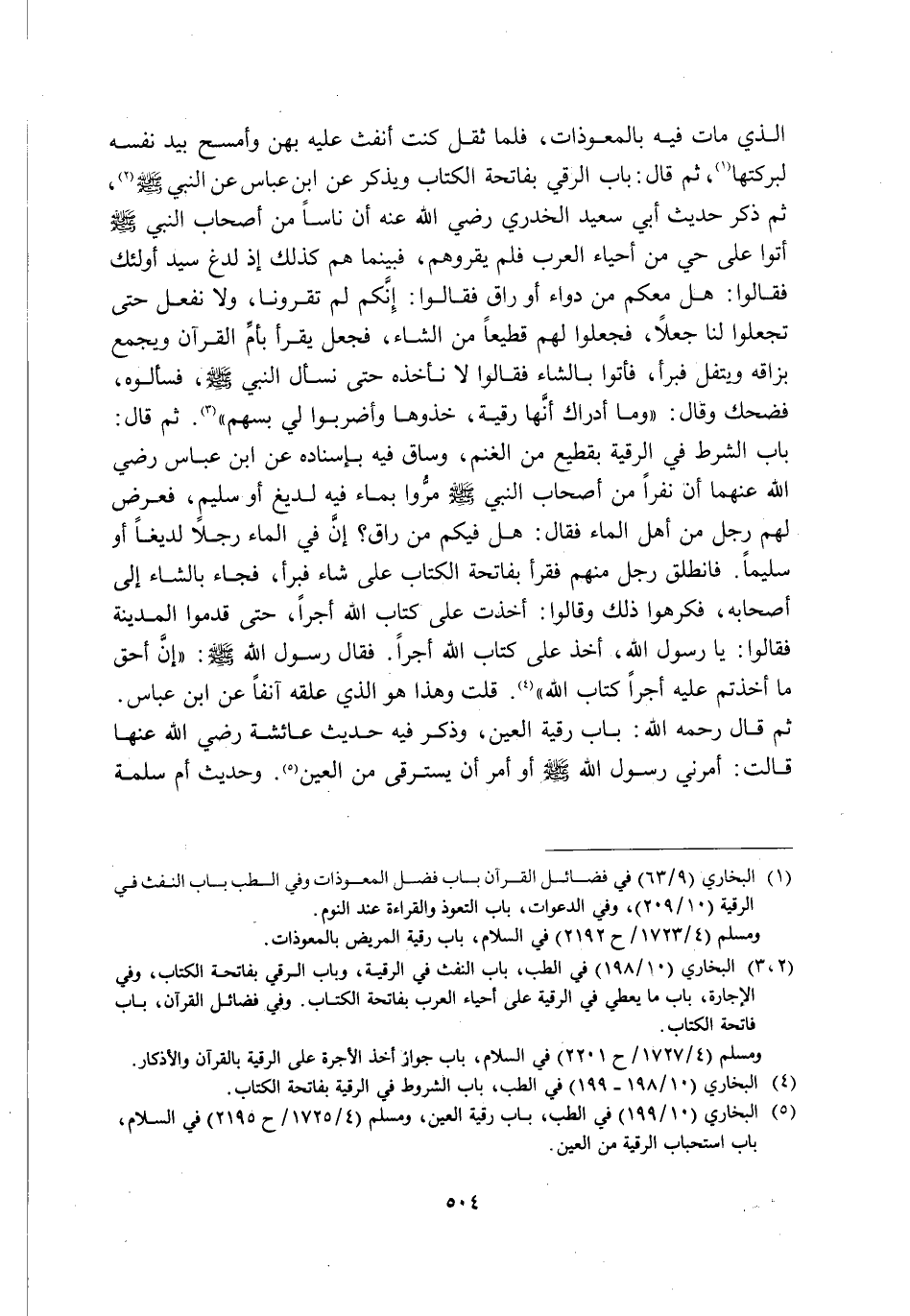 الَّذِي مَاتَ فِيهِ بِالْمُعَوِّذَاتِ, فَلَمَّا ثَقُلَ كُنْتُ أَنْفُثُ عَلَيْهِ بِهِنَّ وَأَمْسَحُ بِيَدِ نَفْسِهِ لِبَرَكَتِهَا1, ثُمَّ قَالَ: بَابُ الرُّقَى بِفَاتِحَةِ الْكِتَابِ, وَيَذْكُرُ عَنِ ابْنِ عَبَّاسٍ عَنِ النَّبِيِّ صَلَّى اللَّهُ عَلَيْهِ وَسَلَّمَ2, ثُمَّ ذَكَرَ حَدِيثَ أَبِي سَعِيدٍ الْخُدْرِيِّ -رَضِيَ اللَّهُ عَنْهُ- أَنَّ نَاسًا مِنْ أَصْحَابِ النَّبِيِّ -صَلَّى اللَّهُ عَلَيْهِ وَسَلَّمَ- أَتَوْا عَلَى حَيٍّ مِنْ أَحْيَاءِ الْعَرَبِ فَلَمْ يُقْرُوهُمْ, فَبَيْنَمَا هُمْ كَذَلِكَ إِذْ لُدِغَ سَيِّدُ أُولَئِكَ فَقَالُوا: هَلْ مَعَكُمْ مِنْ دَوَاءٍ أَوْ رَاقٍ؟ فَقَالُوا: إِنَّكُمْ لَمْ تُقْرُونَا وَلَا نَفْعَلُ حَتَّى تَجْعَلُوا لَنَا جُعْلًا, فَجَعَلُوا لَهُمْ قَطِيعًا مِنَ الشَّاءِ, فَجَعَلَ يَقْرَأُ بِأُمِّ الْقُرْآنِ وَيَجْمَعُ بزاقه ويتفل فبرئ, فَأَتَوْا بِالشَّاءِ فَقَالُوا: لَا نَأْخُذُهُ حَتَّى نَسْأَلَ النَّبِيَّ صَلَّى اللَّهُ عَلَيْهِ وَسَلَّمَ, فَسَأَلُوهُ فَضَحِكَ وَقَالَ: "وَمَا أَدْرَاكَ أَنَّهَا رُقْيَةٌ, خُذُوهَا وَاضْرِبُوا لِي بِسَهْمٍ" 3. ثُمَّ قَالَ: بَابُ الشَّرْطِ فِي الرُّقْيَةِ بِقَطِيعٍ مِنَ الْغَنَمِ, وَسَاقَ فِيهِ بِإِسْنَادِهِ عَنِ ابْنِ عَبَّاسٍ -رَضِيَ اللَّهُ عَنْهُمَا- أَنَّ نَفَرًا مِنْ أَصْحَابِ النَّبِيِّ -صَلَّى اللَّهُ عَلَيْهِ وَسَلَّمَ- مَرُّوا بِمَاءٍ فِيهِ لَدِيغٌ أَوْ سَلِيمٌ, فَعَرَضَ لَهُمْ رَجُلٌ مِنْ أَهْلِ الْمَاءِ فَقَالَ: هَلْ فِيكُمْ مِنْ رَاقٍ؟ إِنَّ فِي الْمَاءِ رَجُلًا لَدِيغًا أَوْ سَلِيمًا, فَانْطَلَقَ رَجُلٌ مِنْهُمْ فَقَرَأَ بِفَاتِحَةِ الْكِتَابِ على شاء فبرئ, فَجَاءَ بِالشَّاءِ إِلَى أَصْحَابِهِ فَكَرِهُوا ذَلِكَ وَقَالُوا: أَخَذْتَ عَلَى كِتَابِ اللَّهِ أَجْرًا, حَتَّى قَدِمُوا الْمَدِينَةَ فَقَالُوا: يَا رَسُولَ اللَّهِ أَخَذَ عَلَى كِتَابِ اللَّهِ أَجْرًا, فَقَالَ رَسُولُ اللَّهِ صَلَّى اللَّهُ عَلَيْهِ وَسَلَّمَ: "إِنَّ أَحَقَّ مَا أَخَذْتُمْ عَلَيْهِ أَجْرًا كِتَابُ اللَّهِ" 4. قلت: وهذا هو الَّذِي عَلَّقَهُ آنِفًا عَنِ ابْنِ عَبَّاسٍ. ثُمَّ قَالَ رَحِمَهُ اللَّهُ: بَابُ رُقْيَةِ الْعَيْنِ وَذَكَرَ فِيهِ حَدِيثَ عَائِشَةَ رَضِيَ اللَّهُ عَنْهَا قَالَتْ: أَمَرَنِي رَسُولُ اللَّهِ صَلَّى اللَّهُ عَلَيْهِ وَسَلَّمَ, أَوْ أَمَرَ أَنْ يُسْتَرْقَى مِنَ الْعَيْنِ5. وَحَدِيثَ أَمِّ سَلَمَةَ