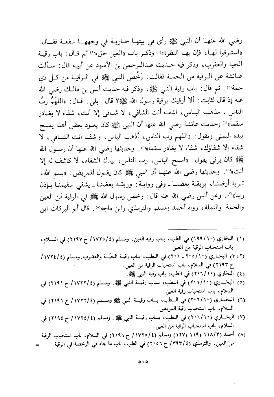 -رَضِيَ اللَّهُ عَنْهَا- أَنَّ النَّبِيَّ -صَلَّى اللَّهُ عَلَيْهِ وَسَلَّمَ- رَأَى فِي بَيْتِهَا جَارِيَةً فِي وَجْهِهَا سَفْعَةٌ فَقَالَ: "اسْتَرْقُوا لَهَا, فَإِنَّ بِهَا النَّظْرَةَ" 1. وَذَكَرَ بَابَ "الْعَيْنُ حَقٌّ" 2 ثُمَّ قَالَ: بَابُ رُقَيَّةِ الْحَيَّةِ وَالْعَقْرَبِ, وَذَكَرَ فِيهِ حَدِيثَ عَبْدِ الرحمن بن الأسود عَنْ أَبِيهِ قَالَ: سَأَلْتُ عَائِشَةَ عَنِ الرُّقْيَةِ مِنَ الْحُمَّةِ فَقَالَتْ: رَخَّصَ النَّبِيُّ -صَلَّى اللَّهُ عَلَيْهِ وَسَلَّمَ- فِي الرُّقْيَةِ مِنْ كُلِّ ذِي حُمَّةٍ3. ثُمَّ قَالَ: بَابُ رُقْيَةِ النَّبِيِّ صَلَّى اللَّهُ عَلَيْهِ وَسَلَّمَ, وَذَكَرَ فِيهِ حَدِيثَ أَنَسِ بْنِ مَالِكٍ رَضِيَ اللَّهُ عَنْهُ, إِذْ قَالَ لِثَابِتٍ: أَلَا أَرْقِيكَ بِرُقْيَةِ رَسُولِ اللَّهِ صَلَّى اللَّهُ عَلَيْهِ وَسَلَّمَ؟ قَالَ: بَلَى قَالَ: "اللَّهُمَّ رَبَّ النَّاسِ, مُذْهِبَ الْبَاسِ, اشْفِ أَنْتَ الشَّافِي, لَا شَافِيَ إِلَّا أَنْتَ, شِفَاءً لَا يُغَادِرُ سَقَمًا" 4 وَحَدِيثَ عَائِشَةَ رَضِيَ اللَّهُ عَنْهَا أَنَّ النَّبِيَّ صَلَّى اللَّهُ عَلَيْهِ وَسَلَّمَ كَانَ يَعُودُ بَعْضَ أَهْلِهِ, يَمْسَحُ بِيَدِهِ الْيُمْنَى وَيَقُولُ: "اللَّهُمَّ رَبَّ النَّاسِ, أَذْهِبِ الْبَاسَ, وَاشْفِ أَنْتَ الشَّافِي, لَا شِفَاءَ إِلَّا شِفَاؤُكَ, شِفَاءً لَا يُغَادِرُ سَقَمًا" 5. وَحَدِيثَهَا رَضِيَ اللَّهُ عَنْهَا أَنَّ رَسُولَ اللَّهِ صَلَّى اللَّهُ عَلَيْهِ وَسَلَّمَ كَانَ يَرْقِي, يَقُولُ: "امْسَحِ الْبَاسَ رَبَّ النَّاسِ, بِيَدِكَ الشِّفَاءُ, لَا كَاشِفَ لَهُ إِلَّا أَنْتَ" 6. وَحَدِيثَهَا رَضِيَ اللَّهُ عَنْهَا أَنَّ النَّبِيَّ -صَلَّى اللَّهُ عَلَيْهِ وَسَلَّمَ- كَانَ يقول للمريض: "باسم اللَّهِ, تُرْبَةُ أَرْضِنَا بِرِيقَةِ بَعْضِنَا -وَفِي رِوَايَةٍ: وَرِيقَةُ بَعْضِنَا- يُشْفَى سَقِيمُنَا, بِإِذْنِ رَبِّنَا" 7. وَعَنْ أَنَسٍ رَضِيَ اللَّهُ عَنْهُ قَالَ: رَخَّصَ رَسُولُ اللَّهِ صَلَّى اللَّهُ عَلَيْهِ وَسَلَّمَ فِي الرُّقْيَةِ مِنَ الْعَيْنِ وَالْحُمَّةِ وَالنَّمْلَةِ, رَوَاهُ أَحْمَدُ وَمُسْلِمٌ وَالتِّرْمِذِيُّ وَابْنُ مَاجَهْ8. قَالَ أَبُو الْبَرَكَاتِ ابْنُ