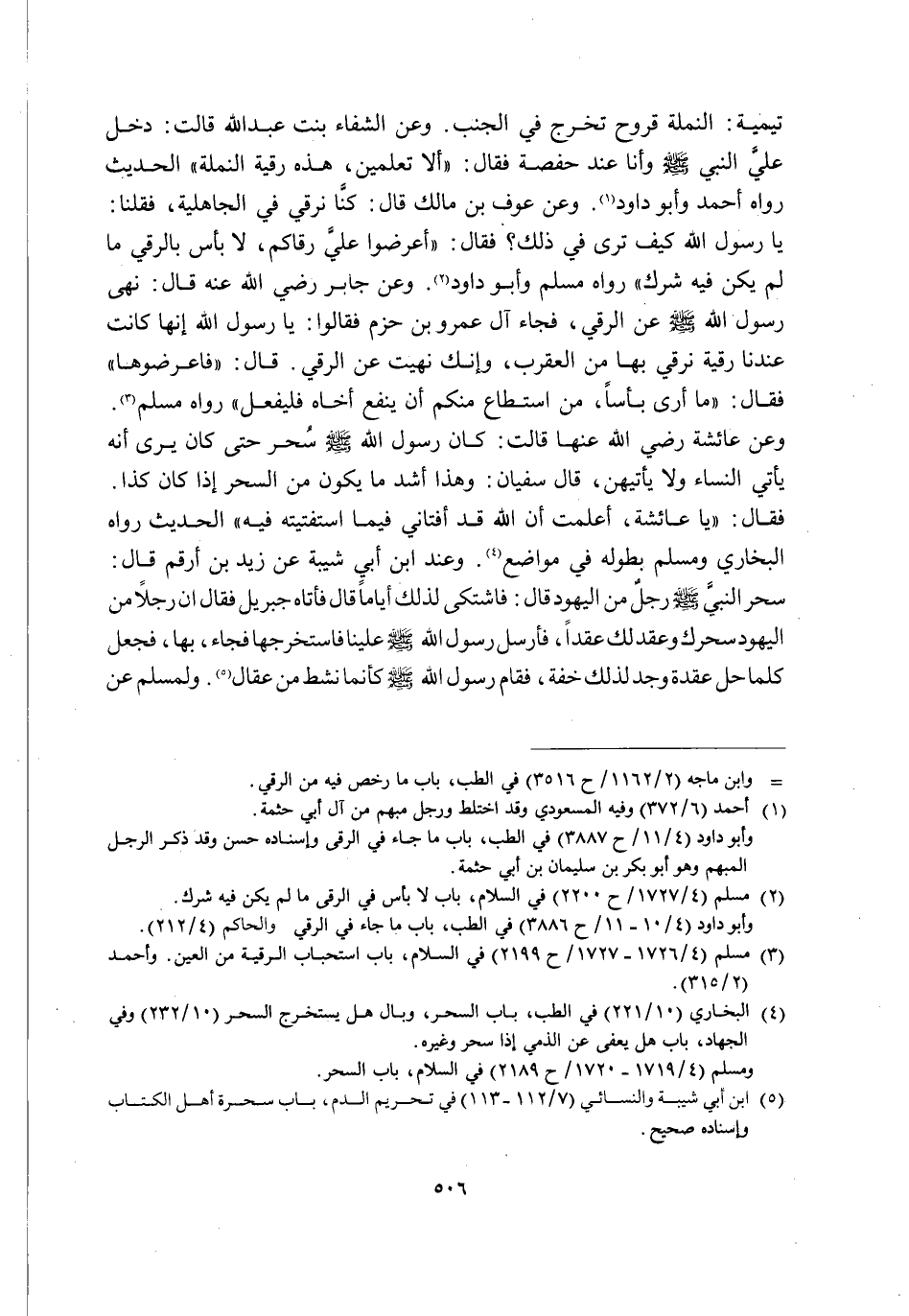 تَيْمِيَّةَ: النَّمْلَةُ قُرُوحٌ تَخْرُجُ فِي الْجَنْبِ. وَعَنِ الشِّفَاءِ بِنْتِ عَبْدِ اللَّهِ قَالَتْ: دَخَلَ عَلَيَّ النَّبِيُّ -صَلَّى اللَّهُ عَلَيْهِ وَسَلَّمَ- وَأَنَا عِنْدُ حَفْصَةَ فَقَالَ: "أَلَا تُعَلِّمِينَ, هَذِهِ رُقْيَةَ النَّمْلَةِ" الْحَدِيثُ رَوَاهُ أَحْمَدُ وَأَبُو دَاوُدَ1. وَعَنْ عَوْفِ بْنِ مَالِكٍ قَالَ: كُنَّا نَرْقِي فِي الْجَاهِلِيَّةِ فَقُلْنَا: يَا رَسُولَ اللَّهِ كَيْفَ تَرَى فِي ذَلِكَ؟ فَقَالَ: "اعْرِضُوا عَلَيَّ رُقَاكُمْ, لَا بَأْسَ بِالرُّقَى مَا لَمْ يَكُنْ فِيهِ شِرْكٌ" رَوَاهُ مُسْلِمٌ وَأَبُو دَاوُدَ2. وَعَنْ جَابِرٍ رَضِيَ اللَّهُ عَنْهُ قَالَ: نَهَى رَسُولُ لِلَّهِ -صَلَّى اللَّهُ عَلَيْهِ وَسَلَّمَ- عَنِ الرُّقَى فَجَاءَ آلُ عَمْرِو بْنِ حَزْمٍ فَقَالُوا: يَا رَسُولَ اللَّهِ إِنَّهَا كَانَتْ عِنْدَنَا رُقْيَةٌ نَرْقِي بِهَا مِنَ الْعَقْرَبِ, وَإِنَّكَ نَهَيْتَ عَنِ الرُّقَى قَالَ: "فَاعْرِضُوهَا" فَقَالَ: "مَا أَرَى بَأْسًا, مَنِ اسْتَطَاعَ مِنْكُمْ أَنْ يَنْفَعَ أَخَاهُ فَلْيَفْعَلْ" رَوَاهُ مُسْلِمٌ3. وَعَنْ عَائِشَةَ رَضِيَ اللَّهُ عَنْهَا قَالَتْ: كَانَ رَسُولُ اللَّهِ صَلَّى اللَّهُ عَلَيْهِ وَسَلَّمَ سُحِرَ حَتَّى كَانَ يَرَى أَنَّهُ يَأْتِي النِّسَاءَ وَلَا يَأْتِيهِنَّ, قَالَ سُفْيَانُ: وَهَذَا أَشَدُّ مَا يَكُونُ مِنَ السِّحْرِ إِذَا كَانَ كَذَا فَقَالَ: "يَا عَائِشَةَ, أَعَلِمْتِ أَنَّ اللَّهَ قَدْ أَفْتَانِي فِيمَا اسْتَفْتَيْتُهُ فِيهِ" الْحَدِيثَ رَوَاهُ الْبُخَارِيُّ وَمُسْلِمٌ بِطُولِهِ فِي مَوَاضِعَ4. وَعَنِ ابْنِ أَبِي شَيْبَةَ عَنْ زَيْدِ بْنِ أَرْقَمَ قَالَ: سَحَرَ النَّبِيَّ -صَلَّى اللَّهُ عَلَيْهِ وَسَلَّمَ- رَجُلٌ مِنَ الْيَهُودِ قَالَ: فَاشْتَكَى لِذَلِكَ أَيَّامًا قَالَ: فَأَتَاهُ جِبْرِيلُ فَقَالَ: إِنَّ رَجُلًا مِنَ الْيَهُودِ سَحَرَكَ وَعَقَدَ لَكَ عُقَدًا, فَأَرْسَلَ رسول الله صَلَّى اللَّهُ عَلَيْهِ وَسَلَّمَ علينا فَاسْتَخْرَجَهَا فَجَاءَ بِهَا, فَجَعَلَ كُلَّمَا حَلَّ عُقْدَةً وَجَدَ لِذَلِكَ خِفَّةً, فَقَامَ رَسُولُ اللَّهِ صَلَّى اللَّهُ عَلَيْهِ وَسَلَّمَ كَأَنَّمَا نَشِطَ مِنْ عِقَالٍ5. وَلِمُسْلِمٍ عَنْ
