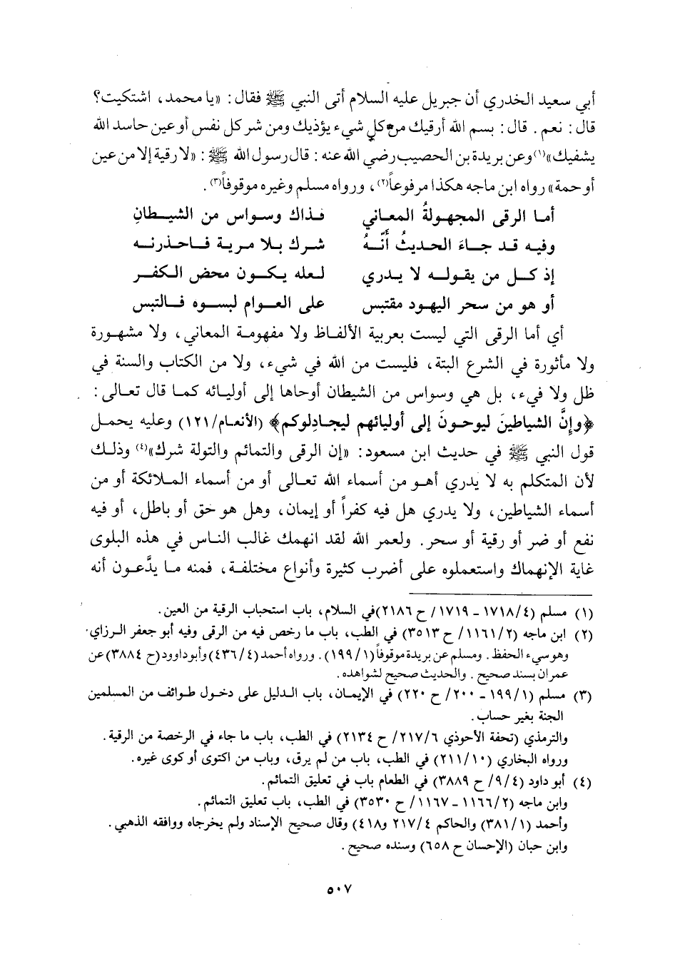 أَبِي سَعِيدٍ الْخُدْرِيِّ, أَنَّ جِبْرِيلَ -عَلَيْهِ السَّلَامُ- أَتَى النَّبِيَّ -صَلَّى اللَّهُ عَلَيْهِ وَسَلَّمَ- فَقَالَ: "يَا مُحَمَّدُ اشْتَكَيْتَ"؟ قَالَ: "نعم" قال: باسم اللَّهِ أَرْقِيكَ, مِنْ كُلِّ شَيْءٍ يُؤْذِيكَ, وَمِنْ شَرِّ كُلِّ نَفْسٍ أَوْ عَيْنِ حَاسِدٍ اللَّهُ يَشْفِيكَ" 1. وَعَنْ بُرَيْدِ بْنِ الْحَصِيبِ رَضِيَ اللَّهُ عنه قال: قَالَ رَسُولُ اللَّهِ صَلَّى اللَّهُ عَلَيْهِ وَسَلَّمَ: "لَا رُقْيَةَ إِلَّا مِنْ عَيْنٍ, أَوْ حُمَّةٍ" رَوَاهُ ابْنُ مَاجَهْ هَكَذَا مَرْفُوعًا2. وَرَوَاهُ مُسْلِمٌ وَغَيْرُهُ مَوْقُوفًا3.