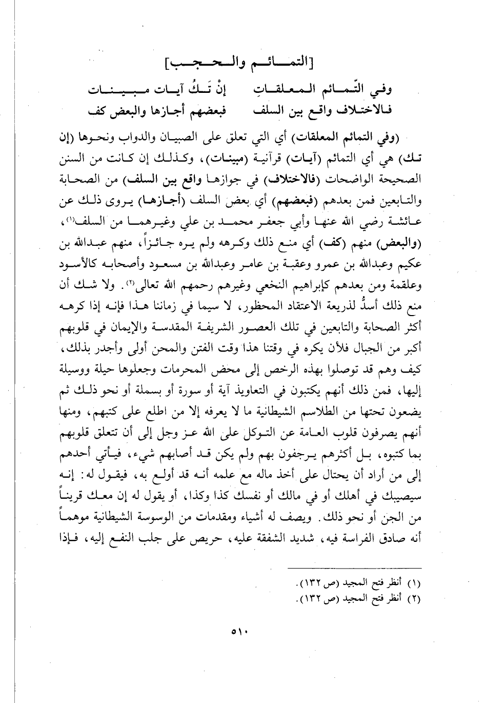"وَفِي التَّمَائِمِ الْمُعَلَّقَاتِ" أَيِ: الَّتِي تُعَلَّقُ عَلَى الصِّبْيَانِ وَالدَّوَابِّ وَنَحْوِهَا "إِنْ تَكُ" هِيَ أَيِ: التَّمَائِمُ "آيَاتٍ" قُرْآنِيَّةٍ "مُبَيِّنَاتٍ" وَكَذَلِكَ إِنْ كَانَتْ مِنَ السُّنَنِ الصَّحِيحَةِ الْوَاضِحَاتِ "فَالِاخْتِلَافُ" فِي جَوَازِهَا "وَاقِعٌ بَيْنَ السَّلَفِ" مِنَ الصَّحَابَةِ وَالتَّابِعِينَ فَمَنْ بَعْدَهُمْ "فَبَعْضُهُمْ" أَيْ: بَعْضُ السَّلَفِ "أَجَازَهَا" يُرْوَى ذَلِكَ عَنْ عَائِشَةَ -رَضِيَ اللَّهُ عَنْهَا- وَأَبِي جَعْفَرٍ مُحَمَّدِ بْنِ عَلِيٍّ وَغَيْرِهِمَا مِنَ السَّلَفِ1 "وَالْبَعْضُ" مِنْهُمْ "كَفَّ" أَيْ: مَنَعَ ذَلِكَ وَكَرِهَهُ وَلَمْ يَرَهُ جَائِزًا, مِنْهُمْ عَبْدُ اللَّهِ بْنُ عُكَيْمٍ وَعَبْدُ اللَّهِ بْنُ عَمْرٍو وَعَقَبَةُ بْنُ عَامِرٍ وَعَبْدُ اللَّهِ بْنُ مَسْعُودٍ وَأَصْحَابُهُ كَالْأَسْوَدِ وَعَلْقَمَةَ وَمَنْ بَعْدَهُمْ كَإِبْرَاهِيمَ النَّخَعِيِّ وَغَيْرُهُمْ رَحِمَهُمُ اللَّهُ تَعَالَى2. وَلَا شَكَّ أَنَّ مَنْعَ ذَلِكَ أَسَدُّ لِذَرِيعَةِ الِاعْتِقَادِ الْمَحْظُورِ, لَا سِيَّمَا فِي زَمَانِنَا هَذَا فَإِنَّهُ إِذَا كَرِهَهُ أَكْثَرُ الصَّحَابَةِ وَالتَّابِعِينَ فِي تِلْكَ الْعُصُورِ الشَّرِيفَةِ الْمُقَدَّسَةِ وَالْإِيمَانُ فِي قُلُوبِهِمْ أَكْبَرُ مِنَ الْجِبَالِ, فَلَأَنْ يُكْرَهَ فِي وَقْتِنَا هَذَا -وَقْتِ الْفِتَنِ وَالْمِحَنِ- أَوْلَى وَأَجْدَرُ بِذَلِكَ, كَيْفَ وَهُمْ قَدْ تَوَصَّلُوا بِهَذِهِ الرُّخَصِ إِلَى مَحْضِ الْمُحَرَّمَاتِ وَجَعَلُوهَا حِيلَةً وَوَسِيلَةً إِلَيْهَا, فَمِنْ ذَلِكَ أَنَّهُمْ يَكْتُبُونَ فِي التَّعَاوِيذِ آيَةً أَوْ سُورَةً أَوْ بَسْمَلَةً أَوْ نَحْوَ ذَلِكَ ثُمَّ يَضَعُونَ تَحْتَهَا مِنَ الطَّلَاسِمِ الشَّيْطَانِيَّةِ مَا لَا يَعْرِفُهُ إِلَّا مَنِ اطَّلَعَ عَلَى كُتُبِهِمْ, وَمِنْهَا أَنَّهُمْ يَصْرِفُونَ قُلُوبَ الْعَامَّةِ عَنِ التَّوَكُّلِ عَلَى اللَّهِ -عَزَّ وَجَلَّ- إِلَى أَنْ تَتَعَلَّقَ قُلُوبُهُمْ بِمَا كَتَبُوهُ, بَلْ أَكْثَرُهُمْ يُرْجِفُونَ بِهِمْ وَلَمْ يَكُنْ قَدْ أَصَابَهُمْ شَيْءٌ, فَيَأْتِي أَحَدُهُمْ إِلَى مَنْ أَرَادَ أَنْ يَحْتَالَ عَلَى أَخْذِ مَالِهِ مَعَ عِلْمِهِ أَنَّهُ قَدْ أُولِعَ بِهِ, فَيَقُولُ لَهُ: إِنَّهُ سَيُصِيبُكَ فِي أَهْلِكَ أَوْ فِي مَالِكَ أَوْ فِي نَفْسِكَ كَذَا وَكَذَا, أَوْ يَقُولُ لَهُ: إِنَّ مَعَكَ قَرِينًا مِنَ الْجِنِّ أَوْ نَحْوَ ذَلِكَ, وَيَصِفُ لَهُ أَشْيَاءَ وَمُقَدِّمَاتٍ مِنَ الْوَسْوَسَةِ الشَّيْطَانِيَّةِ مُوهِمًا أَنَّهُ صَادِقُ الْفِرَاسَةِ فِيهِ, شَدِيدُ الشَّفَقَةِ عَلَيْهِ, حَرِيصٌ عَلَى جَلْبِ النَّفْعِ إِلَيْهِ, فَإِذَا