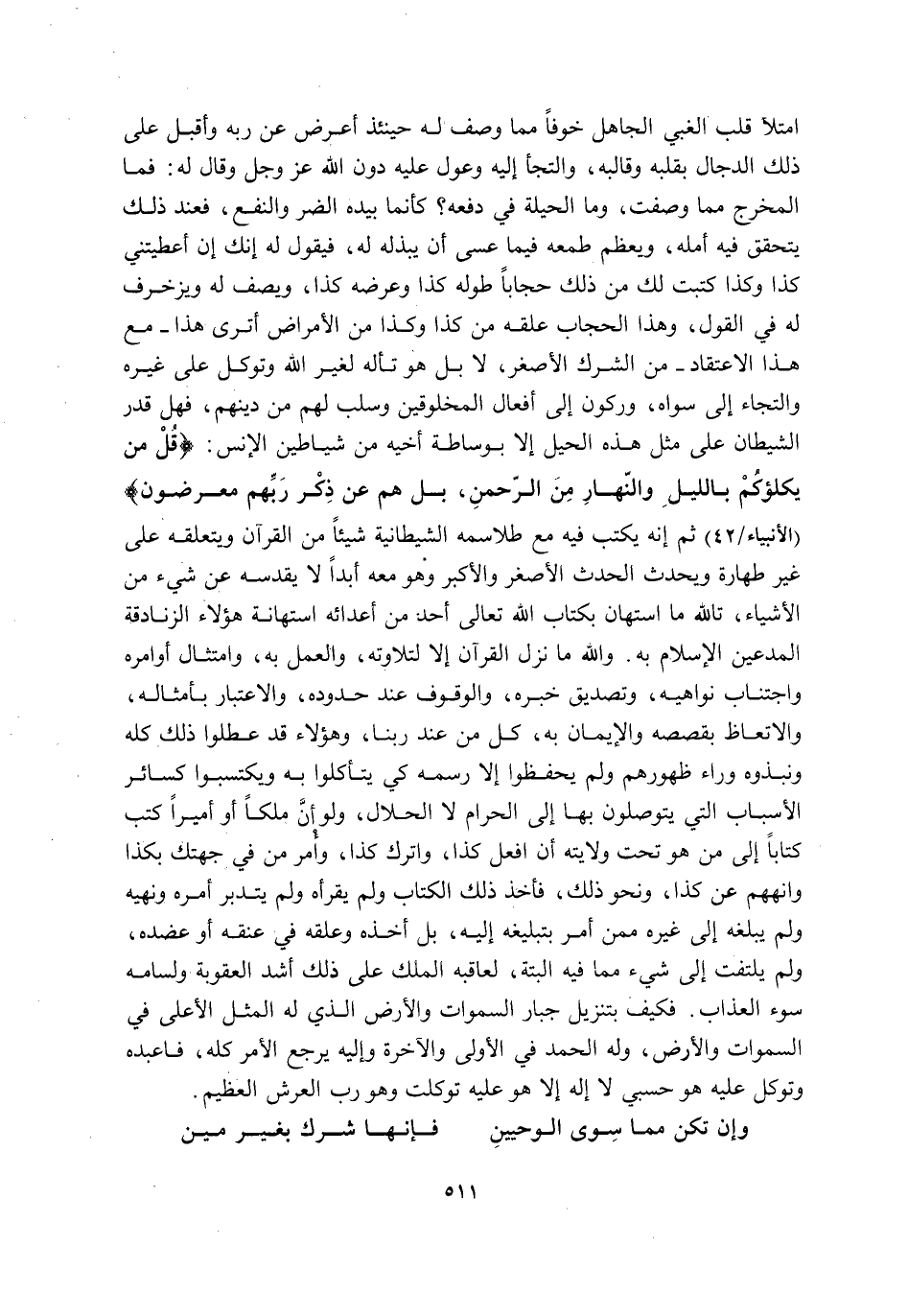 امْتَلَأَ قَلْبُ الْغَبِيِّ الْجَاهِلِ خَوْفًا مِمَّا وَصَفَ لَهُ, حِينَئِذٍ أَعْرَضَ عَنْ رَبِّهِ وَأَقْبَلَ عَلَى ذَلِكَ الدَّجَّالِ بِقَلْبِهِ وَقَالَبِهِ, وَالْتَجَأَ إِلَيْهِ وَعَوَّلَ عَلَيْهِ دُونَ اللَّهِ عَزَّ وَجَلَّ وَقَالَ لَهُ: فَمَا الْمَخْرَجُ مِمَّا وَصَفْتَ, وَمَا الْحِيلَةُ فِي دَفْعِهِ؟ كَأَنَّمَا بِيَدِهِ الضُّرُّ وَالنَّفْعُ فَعِنْدَ ذَلِكَ يَتَحَقَّقُ فِيهِ أَمَلُهُ, وَيَعْظُمُ طَمَعُهُ فِيمَا عَسَى أَنْ يَبْذُلَهُ لَهُ, فَيَقُولُ لَهُ: إِنَّكَ إِنْ أَعْطَيْتَنِي كَذَا وَكَذَا كَتَبْتُ لَكَ مِنْ ذَلِكَ حِجَابًا طُولُهُ كَذَا وَعَرْضُهُ كَذَا, وَيَصِفُ لَهُ وَيُزَخْرِفُ لَهُ فِي الْقَوْلِ, وَهَذَا الْحِجَابُ عَلِّقْهُ مِنْ كَذَا وَكَذَا مِنَ الْأَمْرَاضِ أَتَرَى هَذَا -مَعَ هَذَا الِاعْتِقَادِ- مِنَ الشِّرْكِ الْأَصْغَرِ, لَا بَلْ هُوَ تَأَلُّهٌ لِغَيْرِ اللَّهِ وَتَوَكُّلٌ عَلَى غَيْرِهِ وَالْتِجَاءٌ إِلَى سِوَاهُ وَرُكُونٌ إِلَى أَفْعَالِ الْمَخْلُوقِينَ وَسَلْبٌ لَهُمْ مِنْ دِينِهِمْ, فَهَلْ قَدَرَ الشَّيْطَانُ عَلَى مِثْلِ هَذِهِ الْحِيَلِ إِلَّا بِوَسَاطَةِ أَخِيهِ مِنْ شَيَاطِينِ الْإِنْسِ: {قُلْ مَنْ يَكْلَأُكُمْ بِاللَّيْلِ وَالنَّهَارِ مِنَ الرَّحْمَنِ بَلْ هُمْ عَنْ ذِكْرِ رَبِّهِمْ مُعْرِضُونَ} [الْأَنْبِيَاءِ: 42] ؟! ثُمَّ إِنَّهُ يَكْتُبُ فِيهِ مَعَ طَلَاسِمِهِ الشَّيْطَانِيَّةِ شَيْئًا مِنَ الْقُرْآنِ وَيَتَعَلَّقُهُ عَلَى غَيْرِ طَهَارَةٍ وَيُحْدِثُ الْحَدَثَ الْأَصْغَرَ وَالْأَكْبَرَ وَهُوَ مَعَهُ أَبَدًا لَا يُقَدِّسُهُ عَنْ شَيْءٍ مِنَ الْأَشْيَاءِ, تَاللَّهِ مَا اسْتَهَانَ بكتاب الله تعالى أَحَدٌ مِنْ أَعْدَائِهِ اسْتِهَانَةَ هَؤُلَاءِ الزَّنَادِقَةِ الْمُدَّعِينَ الْإِسْلَامَ بِهِ. وَاللَّهِ مَا نَزَلَ الْقُرْآنُ إِلَّا لِتِلَاوَتِهِ وَالْعَمَلِ بِهِ, وَامْتِثَالِ أَوَامِرِهِ وَاجْتِنَابِ نَوَاهِيهِ, وَتَصْدِيقِ خَبَرِهِ وَالْوُقُوفِ عِنْدَ حُدُودِهِ, وَالِاعْتِبَارِ بِأَمْثَالِهِ وَالِاتِّعَاظِ بِقَصَصِهِ وَالْإِيمَانِ بِهِ, كُلٌّ مِنْ عِنْدِ رَبِّنَا, وَهَؤُلَاءِ قَدْ عَطَّلُوا ذَلِكَ كُلَّهُ وَنَبَذُوهُ وَرَاءَ ظُهُورِهِمْ وَلَمْ يَحْفَظُوا إِلَّا رَسْمَهُ؛ كَيْ يَتَأَكَّلُوا بِهِ وَيَكْتَسِبُوا كَسَائِرِ الْأَسْبَابِ الَّتِي يَتَوَصَّلُونَ بِهَا إِلَى الْحَرَامِ لَا الْحَلَالِ, وَلَوْ أَنَّ مَلِكًا أَوْ أَمِيرًا كَتَبَ كِتَابًا إِلَى مَنْ هُوَ تَحْتَ وِلَايَتِهِ أَنِ افْعَلْ كَذَا وَاتْرُكْ كَذَا وَأْمُرْ مَنْ فِي جِهَتِكَ بِكَذَا وَانْهَهُمْ عَنْ كَذَا وَنَحْوَ ذَلِكَ, فَأَخَذَ ذَلِكَ الْكِتَابَ وَلَمْ يَقْرَأْهُ وَلَمْ يَتَدَبَّرْ أَمْرَهُ وَنَهْيَهُ وَلَمْ يُبَلِّغْهُ إِلَى غَيْرِهِ مِمَّنْ أُمِرَ بِتَبْلِيغِهِ إِلَيْهِ, بَلْ أَخَذَهُ وَعَلَّقَهُ فِي عُنُقِهِ أَوْ عَضُدِهِ وَلَمْ يَلْتَفِتْ إِلَى شَيْءٍ مِمَّا فِيهِ الْبَتَّةَ, لَعَاقَبَهُ الْمَلِكُ عَلَى ذَلِكَ أَشَدَّ الْعُقُوبَةِ وَلَسَامَهُ سُوءَ الْعَذَابِ, فَكَيْفَ بِتَنْزِيلِ جَبَّارِ السَّمَاوَاتِ وَالْأَرْضِ الَّذِي لَهُ الْمَثَلُ الْأَعْلَى فِي السَّمَاوَاتِ وَالْأَرْضِ, وَلَهُ الْحَمْدُ فِي الْأُولَى وَالْآخِرَةِ, وَإِلَيْهِ يُرْجَعُ الْأَمْرُ كُلُّهُ, فَاعْبُدْهُ وَتَوَكَّلْ عَلَيْهِ, هُوَ حَسْبِي لَا إِلَهَ إِلَّا هُوَ, عَلَيْهِ تَوَكَّلْتُ, وَهُوَ رَبُّ الْعَرْشِ الْعَظِيمِ؟!