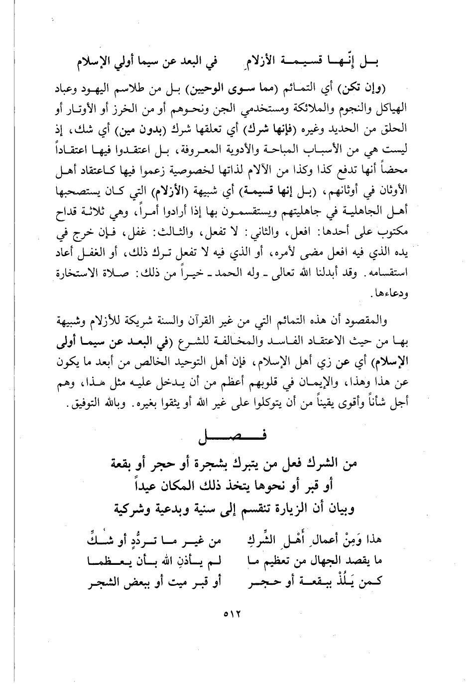 وَالْمَقْصُودُ أَنَّ هَذِهِ التَّمَائِمَ الَّتِي مِنْ غَيْرِ الْقُرْآنِ وَالسُّنَّةِ شَرِيكَةٌ لِلْأَزْلَامِ وَشَبِيهَةٌ بِهَا, مِنْ حَيْثُ الِاعْتِقَادُ الْفَاسِدُ وَالْمُخَالِفَةُ لِلشَّرْعِ "فِي الْبُعْدِ عَنْ سِيمَا أُولِي الْإِسْلَامِ" أَيْ: عَنْ زِيِّ أَهْلِ الْإِسْلَامِ, فَإِنَّ أَهْلَ التَّوْحِيدِ الْخَالِصِ مِنْ أَبْعَدِ مَا يَكُونُ عَنْ هَذَا وَهَذَا, وَالْإِيمَانُ فِي قُلُوبِهِمْ أَعْظَمُ مِنْ أَنَّ يَدْخُلَ عَلَيْهِ مِثْلُ هَذَا, وَهُمْ أَجَلُّ شَأْنًا وَأَقْوَى يَقِينًا مِنْ أَنْ يَتَوَكَّلُوا عَلَى غَيْرِ اللَّهِ أَوْ يَثِقُوا بِغَيْرِهِ, وَبِاللَّهِ التَّوْفِيقُ.