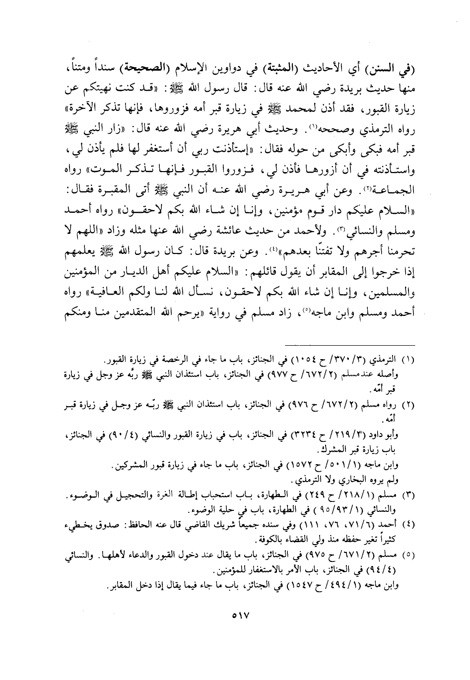 "فِي السُّنَنِ" أَيِ: الْأَحَادِيثِ "الْمُثْبَتَةِ" فِي دَوَاوِينِ الْإِسْلَامِ "الصَّحِيحَةِ" سَنَدًا وَمَتْنًا مِنْهَا حَدِيثُ بُرَيْدَةَ رَضِيَ اللَّهُ عَنْهُ قَالَ: قَالَ رَسُولُ اللَّهِ صَلَّى اللَّهُ عَلَيْهِ وَسَلَّمَ: "قَدْ كُنْتُ نَهَيْتُكُمْ عَنْ زِيَارَةِ الْقُبُورِ, فَقَدْ أُذِنَ لِمُحَمَّدٍ -صَلَّى اللَّهُ عَلَيْهِ وَسَلَّمَ- فِي زِيَارَةِ قَبْرِ أُمِّهِ فَزُورُوهَا, فَإِنَّهَا تُذَكِّرُ الْآخِرَةَ" رَوَاهُ التِّرْمِذِيُّ وَصَحَّحَهُ1. وَحَدِيثُ أَبِي هُرَيْرَةَ رَضِيَ اللَّهُ عَنْهُ قَالَ: زَارَ النَّبِيُّ صَلَّى اللَّهُ عَلَيْهِ وَسَلَّمَ قَبْرَ أُمِّهِ فَبَكَى وَأَبْكَى مَنْ حَوْلَهُ فَقَالَ: "اسْتَأْذَنْتُ رَبِّي أَنْ أَسْتَغْفِرَ لَهَا فَلَمْ يَأْذَنْ لِي, وَاسْتَأْذَنْتُهُ فِي أَنْ أَزُورَهَا فَأَذِنَ لِي, فَزُورُوا الْقُبُورَ فَإِنَّهَا تُذَكِّرُ الْمَوْتَ" رَوَاهُ الْجَمَاعَةُ2. وَعَنْ أَبِي هُرَيْرَةَ رَضِيَ اللَّهُ عَنْهُ أَنَّ النَّبِيَّ صَلَّى اللَّهُ عَلَيْهِ وَسَلَّمَ أَتَى الْمَقْبَرَةَ فَقَالَ: "السَّلَامُ عَلَيْكُمْ دَارَ قَوْمٍ مُؤْمِنِينَ, وَإِنَّا إِنْ شَاءَ اللَّهُ بِكُمْ لَاحِقُونَ" رَوَاهُ أَحْمَدُ وَمُسْلِمٌ وَالنَّسَائِيُّ3. وَلِأَحْمَدَ مِنْ حَدِيثِ عَائِشَةَ رَضِيَ اللَّهُ عَنْهَا مِثْلُهُ وَزَادَ: "اللَّهُمَّ لَا تَحْرِمْنَا أَجْرَهُمْ, وَلَا تَفْتِنَّا بَعْدَهُمْ" 4. وَعَنْ بُرَيْدَةَ قَالَ: كَانَ رَسُولُ اللَّهِ صَلَّى اللَّهُ عَلَيْهِ وَسَلَّمَ يُعَلِّمُهُمْ إِذَا خَرَجُوا إِلَى الْمَقَابِرِ أَنْ يَقُولَ قَائِلُهُمْ: "السَّلَامُ عَلَيْكُمْ أَهْلَ الدِّيَارِ مِنَ الْمُؤْمِنِينَ وَالْمُسْلِمِينَ, وَإِنَّا إِنْ شَاءَ اللَّهُ بِكُمْ لَاحِقُونَ, نَسْأَلُ اللَّهَ لَنَا وَلَكُمُ الْعَافِيَةَ" رَوَاهُ أَحْمَدُ وَمُسْلِمٌ وَابْنُ مَاجَهْ5. زَادَ مُسْلِمٌ فِي رِوَايَةٍ: "يَرْحَمُ اللَّهُ الْمُتَقَدِّمِينَ مِنَّا وَمِنْكُمْ