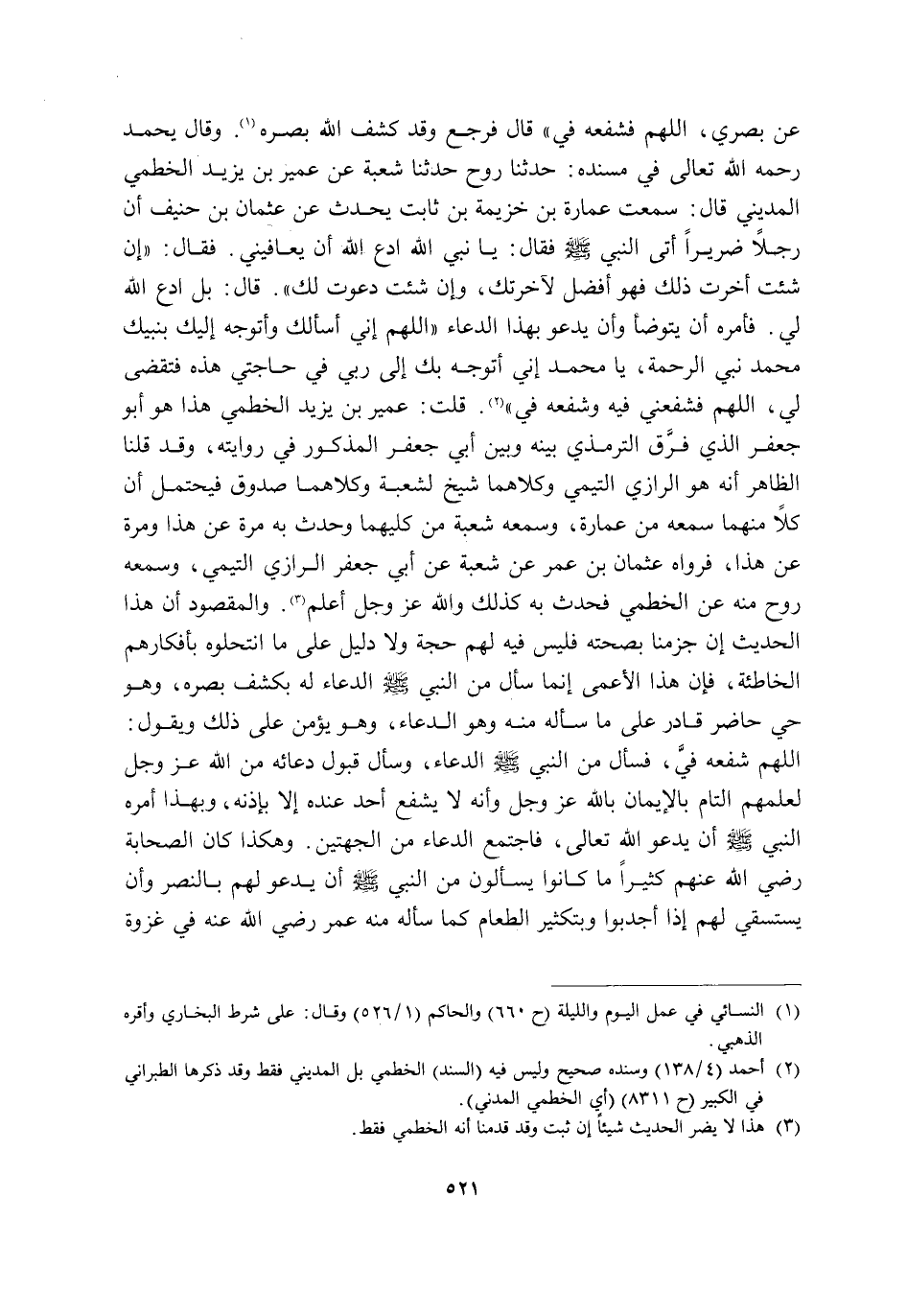 عَنْ بَصَرِي, اللَّهُمَّ فَشَفِّعْهُ فِيَّ" قَالَ: فَرَجَعَ وَقَدْ كَشَفَ اللَّهُ بصره1. وقال يحمد رَحِمَهُ اللَّهُ تَعَالَى فِي مُسْنَدِهِ: حَدَّثَنَا رَوْحٌ حَدَّثَنَا شُعْبَةُ عَنْ عُمَيْرِ بْنِ يَزِيدَ الْخَطْمِيِّ الْمَدِينِيِّ قَالَ: سَمِعْتُ عُمَارَةَ بْنَ خُزَيْمَةَ بْنِ ثَابِتٍ يُحَدِّثُ عَنْ عُثْمَانَ بْنِ حُنَيْفٍ أَنَّ رَجُلًا ضَرِيرًا أَتَى النَّبِيَّ صَلَّى اللَّهُ عَلَيْهِ وَسَلَّمَ فَقَالَ: يَا نَبِيَّ اللَّهِ ادْعُ اللَّهَ أَنْ يُعَافِيَنِي فَقَالَ: "إِنْ شِئْتَ أَخَّرْتَ ذَلِكَ فَهُوَ أَفْضَلُ لِآخِرَتِكَ, وَإِنْ شِئْتَ دَعَوْتُ لَكَ" قَالَ: بَلِ ادْعُ اللَّهَ لِي. فَأَمَرَهُ أَنْ يَتَوَضَّأَ وَأَنْ يَدْعُوَ بِهَذَا الدُّعَاءِ: "اللَّهُمَّ إِنِّي أَسْأَلُكَ وَأَتَوَجَّهُ إِلَيْكَ بِنَبِيِّكَ مُحَمَّدٍ نَبِيِّ الرَّحْمَةِ, يَا مُحَمَّدُ إِنِّي أَتَوَجَّهُ بِكَ إِلَى رَبِّي فِي حَاجَتِي هَذِهِ فَتُقْضَى لِي, اللَّهُمَّ فَشَفِّعْنِي فِيهِ وَشَفِّعْهُ فِيَّ" 2. قُلْتُ: عُمَيْرُ بْنُ يَزِيدَ الْخَطْمِيُّ هَذَا هُوَ أَبُو جَعْفَرٍ الَّذِي فَرَّقَ التِّرْمِذِيُّ بَيْنَهُ وَبَيْنَ أَبِي جَعْفَرٍ الْمَذْكُورِ فِي رِوَايَتِهِ, وَقَدْ قُلْنَا: الظَّاهِرُ أَنَّهُ هُوَ الرَّازِيُّ التَّيْمِيُّ وَكِلَاهُمَا شَيْخٌ لِشُعْبَةَ وَكِلَاهُمَا صَدُوقٌ, فَيُحْتَمَلُ أَنَّ كُلًّا مِنْهُمَا سَمِعَهُ مِنْ عُمَارَةَ وَسَمِعَهُ شُعْبَةُ مِنْ كِلَيْهِمَا, وَحَدَّثَ بِهِ مَرَّةً عَنْ هَذَا وَمَرَّةً عَنْ هَذَا, فَرَوَاهُ عُثْمَانُ بْنُ عُمَرَ عَنْ شُعْبَةَ عَنْ أَبِي جَعْفَرٍ الرَّازِيِّ التَّيْمِيِّ وَسَمِعَهُ رَوْحٌ مِنْهُ عَنِ الْخَطْمِيِّ, فَحَدَّثَ بِهِ كَذَلِكَ وَاللَّهُ -عَزَّ وَجَلَّ- أَعْلَمُ3. وَالْمَقْصُودُ أَنَّ هَذَا الْحَدِيثَ إِنْ جَزَمْنَا بِصِحَّتِهِ فَلَيْسَ فِيهِ لَهُمْ حُجَّةً وَلَا دَلِيلٌ عَلَى مَا انْتَحَلُوهُ بِأَفْكَارِهِمُ الْخَاطِئَةِ, فَإِنَّ هَذَا الْأَعْمَى إِنَّمَا سَأَلَ مِنَ النَّبِيِّ -صَلَّى اللَّهُ عَلَيْهِ وَسَلَّمَ- الدُّعَاءَ لَهُ بِكَشْفِ بَصَرِهِ, وَهُوَ حَيٌّ حَاضِرٌ قَادِرٌ عَلَى مَا سَأَلَهُ مِنْهُ وَهُوَ الدُّعَاءُ, وَهُوَ يُؤَمِّنُ عَلَى ذَلِكَ وَيَقُولُ: "اللَّهُمَّ شَفِّعْهُ فِيَّ" فَسَأَلَ مِنَ النَّبِيِّ صَلَّى اللَّهُ عَلَيْهِ وَسَلَّمَ الدُّعَاءَ وَسَأَلَ قَبُولَ دُعَائِهِ مِنَ اللَّهِ عَزَّ وَجَلَّ؛ لِعِلْمِهِمُ التَّامِّ بِالْإِيمَانِ بِاللَّهِ عَزَّ وَجَلَّ وَأَنَّهُ لَا يَشْفَعُ أَحَدٌ عِنْدَهُ إِلَّا بِإِذْنِهِ, وَبِهَذَا أَمَرَهُ النَّبِيُّ صَلَّى اللَّهُ عَلَيْهِ وَسَلَّمَ أَنْ يَدْعُوَ اللَّهَ تَعَالَى, فَاجْتَمَعَ الدُّعَاءُ مِنَ الْجِهَتَيْنِ. وَهَكَذَا كَانَ الصَّحَابَةُ -رَضِيَ اللَّهُ عَنْهُمْ- كَثِيرًا مَا كَانُوا يَسْأَلُونَ مِنَ النَّبِيِّ -صَلَّى اللَّهُ عَلَيْهِ وَسَلَّمَ- أَنْ يَدْعُوَ لَهُمْ بِالنَّصْرِ وَأَنْ يَسْتَسْقِيَ لَهُمْ إِذَا أَجْدَبُوا, وَبِتَكْثِيرِ الطعام كما سأله مِنْهُ عُمَرُ رَضِيَ اللَّهُ عَنْهُ فِي غَزْوَةِ