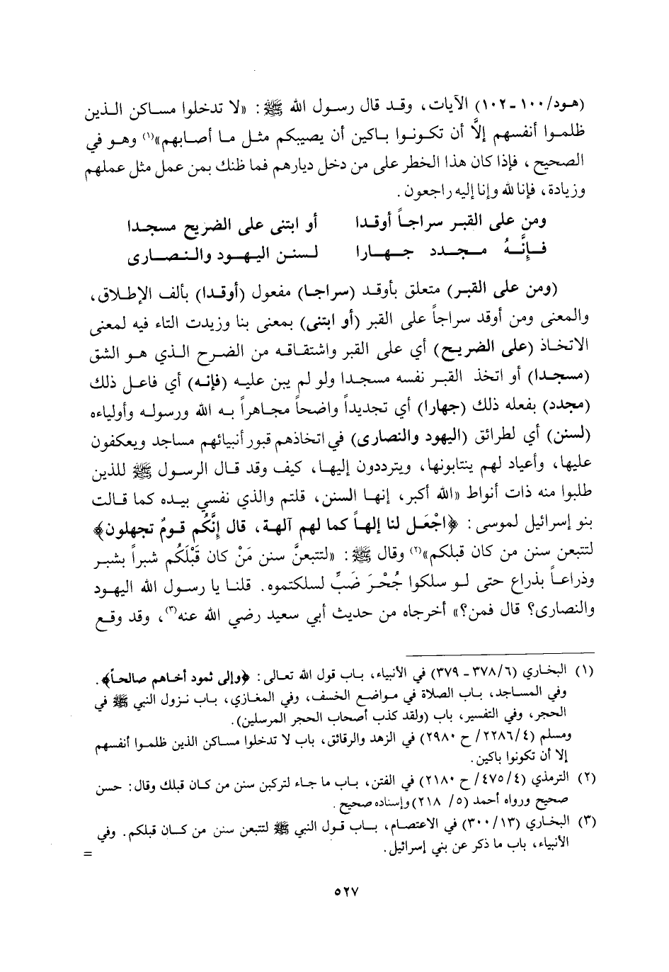 "وَمَنْ عَلَى الْقَبْرِ" مُتَعَلِّقٌ بِأَوْقَدَ "سِرَاجًا" مَفْعُولُ "أَوْقَدَا" بِأَلِفِ الْإِطْلَاقِ, وَالْمَعْنَى: وَمَنْ أَوْقَدَ سِرَاجًا عَلَى الْقَبْرِ "أَوِ ابتنى" بمعنى: بنى وَزِيدَتِ التَّاءُ فِيهِ لِمَعْنَى الِاتِّخَاذِ "عَلَى الضَّرِيحِ" أَيْ: عَلَى الْقَبْرِ وَاشْتِقَاقُهُ مِنَ الضَّرْحِ الَّذِي هُوَ الشَّقُّ "مَسْجِدًا" أَوِ اتَّخَذَ الْقَبْرَ نَفْسَهُ مَسْجِدًا وَلَوْ لَمْ يَبْنِ عَلَيْهِ "فَإِنَّهُ" أَيْ: فَاعِلُ ذَلِكَ "مُجَدِّدٌ" بِفِعْلِهِ ذَلِكَ "جِهَارًا" أَيْ: تَجْدِيدًا وَاضِحًا مُجَاهِرًا بِهِ اللَّهَ وَرَسُولَهُ وَأَوْلِيَاءَهُ "لِسُنَنِ" أَيْ: لِطَرَائِقِ "الْيَهُودِ وَالنَّصَارَى" فِي اتِّخَاذِهِمْ قُبُورَ أَنْبِيَائِهِمْ مَسَاجِدَ وَيَعْكُفُونَ عَلَيْهَا, وَأَعْيَادًا لَهُمْ يَنْتَابُونَهَا, وَيَتَرَدَّدُونَ إِلَيْهَا, كَيْفَ وَقَدْ قَالَ الرَّسُولُ -صَلَّى اللَّهُ عَلَيْهِ وَسَلَّمَ- لِلَّذِينَ طَلَبُوا مِنْهُ ذَاتَ أَنْوَاطٍ: "اللَّهُ أَكْبَرُ, إِنَّهَا السَّنَنُ, قُلْتُمْ وَالَّذِي نَفْسِي بِيَدِهِ كَمَا قَالَتْ بَنُو إِسْرَائِيلَ لِمُوسَى: {اجْعَلْ لَنَا إِلَهًا كَمَا لَهُمْ آلِهَةٌ قَالَ إِنَّكُمْ قَوْمٌ تَجْهَلُونَ} لَتَتَّبِعُنَّ سَنَنَ مَنْ كَانَ قَبْلَكُمْ" 2. وَقَالَ صَلَّى اللَّهُ عَلَيْهِ وَسَلَّمَ: "لَتَتَّبِعُنَّ سَنَنَ مَنْ كَانَ قَبْلَكُمْ, شِبْرًا بِشِبْرٍ وَذِرَاعًا بِذِرَاعٍ, حَتَّى لَوْ سَلَكُوا جُحْرَ ضَبٍّ لَسَلَكْتُمُوهُ" قُلْنَا: يَا رَسُولَ اللَّهِ الْيَهُودَ وَالنَّصَارَى؟ قَالَ: "فَمَنْ"؟ أَخْرَجَاهُ مِنْ حَدِيثِ أَبِي سَعِيدٍ -رَضِيَ اللَّهُ عَنْهُ-3, وَقَدْ وَقَعَ