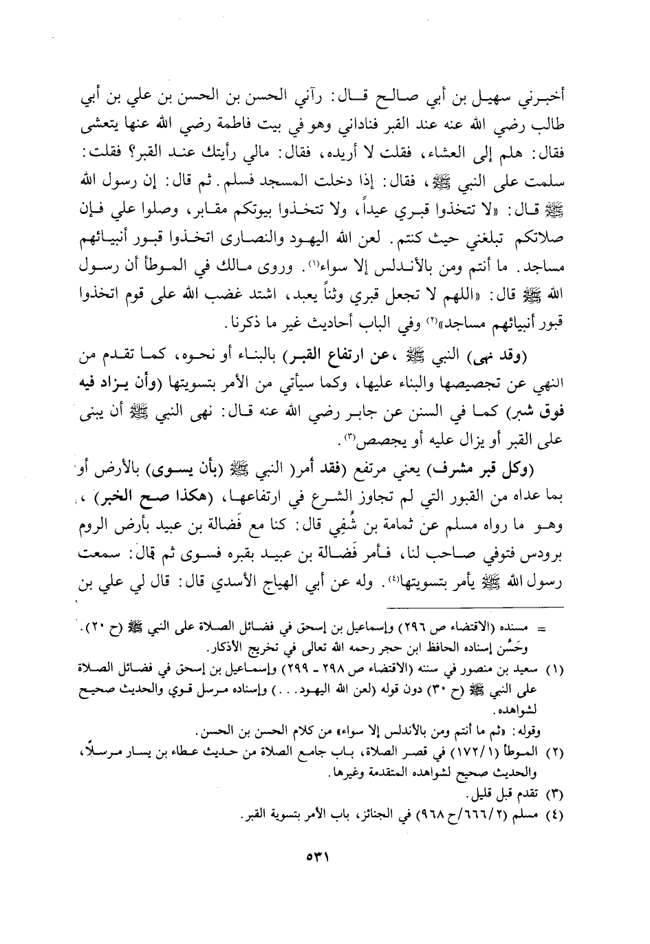 أَخْبَرَنِي سُهَيْلُ بْنُ أَبِي صَالِحٍ قَالَ: رَآنِي الْحَسَنُ بْنُ الْحَسَنِ بْنِ عَلِيِّ بْنِ أَبِي طَالِبٍ رَضِيَ اللَّهُ عَنْهُ عِنْدَ الْقَبْرِ, فَنَادَانِي وَهُوَ فِي بَيْتِ فَاطِمَةَ رَضِيَ اللَّهُ عَنْهَا يَتَعَشَّى فَقَالَ: هَلُمَّ إِلَى الْعَشَاءِ فَقُلْتُ: لَا أُرِيدُهُ, فَقَالَ: مَا لِي رَأَيْتُكَ عِنْدَ الْقَبْرِ؟ فَقُلْتُ: سَلَّمْتُ عَلَى النَّبِيِّ صَلَّى اللَّهُ عَلَيْهِ وَسَلَّمَ فَقَالَ: إِذَا دَخَلْتَ الْمَسْجِدَ فَسَلِّمْ. ثُمَّ قَالَ: إِنَّ رَسُولَ اللَّهِ -صَلَّى اللَّهُ عَلَيْهِ وَسَلَّمَ- قَالَ: "لَا تَتَّخِذُوا قَبْرِي عِيدًا, وَلَا تَتَّخِذُوا بُيُوتَكُمْ مَقَابِرَ, وَصَلُّوا عَلَيَّ فَإِنَّ صَلَاتَكُمْ تَبْلُغُنِي حَيْثُ كُنْتُمْ, لَعَنَ اللَّهُ الْيَهُودَ وَالنَّصَارَى, اتَّخَذُوا قُبُورَ أَنْبِيَائِهِمْ مَسَاجِدَ, مَا أَنْتُمْ وَمَنْ بِالْأَنْدَلُسِ إِلَّا سَوَاءٌ" 1. وَرَوَى مَالِكٌ فِي الْمُوَطَّأِ أَنَّ رَسُولَ اللَّهِ صَلَّى اللَّهُ عَلَيْهِ وَسَلَّمَ قَالَ: "اللَّهُمَّ لَا تَجْعَلْ قَبْرِي وَثَنًا يُعْبَدُ, اشْتَدَّ غَضَبُ اللَّهِ عَلَى قَوْمٍ اتَّخَذُوا قُبُورَ أَنْبِيَائِهِمْ مَسَاجِدَ" 2. وَفِي الْبَابِ أَحَادِيثُ غَيْرُ مَا ذَكَرْنَا.