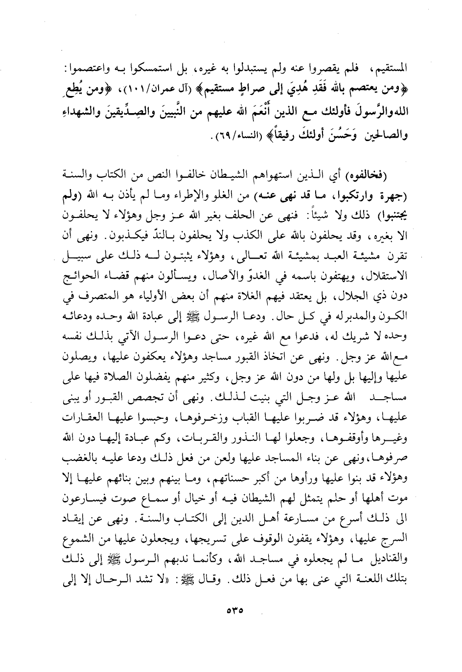 "فَخَالَفُوهُ" أَيِ: الَّذِينَ اسْتَهْوَاهُمُ الشَّيْطَانُ خَالَفُوا النَّصَّ مِنَ الْكِتَابِ وَالسُّنَّةِ "جَهْرَةً وَارْتَكَبُوا مَا قَدْ نَهَى عَنْهُ" مِنَ الْغُلُوِّ وَالْإِطْرَاءِ وَمَا لَمْ يَأْذَنْ بِهِ اللَّهُ "وَلَمْ يَجْتَنِبُوا" ذَلِكَ وَلَا شَيْئًا, فَنَهَى عَنِ الْحَلِفِ بِغَيْرِ اللَّهِ -عَزَّ وَجَلَّ- وَهَؤُلَاءِ لَا يَحْلِفُونَ إِلَّا بِغَيْرِهِ, وَقَدْ يَحْلِفُونَ بِاللَّهِ عَلَى الْكَذِبِ وَلَا يَحْلِفُونَ بِالنِّدِّ فَيَكْذِبُونَ. وَنَهَى أَنْ تُقْرَنَ مَشِيئَةُ الْعَبْدِ بِمَشِيئَةِ اللَّهِ تَعَالَى, وَهَؤُلَاءِ يُثْبِتُونَ لَهُ ذَلِكَ عَلَى سَبِيلِ الِاسْتِقْلَالِ, وَيَهْتِفُونَ بِاسْمِهِ فِي الْغُدُوِّ وَالْآصَالِ وَيَسْأَلُونَ مِنْهُمْ قَضَاءَ الْحَوَائِجِ دُونَ ذِي الْجَلَالِ, بَلْ يَعْتَقِدُ فِيهِمُ الْغُلَاةُ مِنْهُمْ أَنَّ بَعْضَ الْأَوْلِيَاءِ هُوَ الْمُتَصَرِّفُ فِي الْكَوْنِ وَالْمُدَبِّرُ لَهُ فِي كُلِّ حَالٍ. وَدَعَا الرَّسُولُ صَلَّى اللَّهُ عَلَيْهِ وَسَلَّمَ إِلَى عِبَادَةِ اللَّهِ وَحْدَهُ وَدُعَائِهِ وَحْدَهُ لَا شَرِيكَ لَهُ, فَدَعَوْا مَعَ اللَّهِ غَيْرَهُ, حَتَّى دَعَوُا الرَّسُولَ الْآتِي بِذَلِكَ نَفْسَهُ مَعَ اللَّهِ عَزَّ وَجَلَّ. وَنَهَى عَنِ اتِّخَاذِ الْقُبُورِ مَسَاجِدَ وَهَؤُلَاءِ يَعْكُفُونَ عَلَيْهَا وَيُصَلُّونَ عَلَيْهَا وَإِلَيْهَا, بَلْ وَلَهَا مِنْ دُونِ اللَّهِ عَزَّ وَجَلَّ, وَكَثِيرٌ مِنْهُمْ يُفَضِّلُونَ الصَّلَاةَ فِيهَا عَلَى مَسَاجِدِ اللَّهِ عَزَّ وَجَلَّ الَّتِي بُنِيَتْ لِذَلِكَ. وَنَهَى أَنْ تُجَصَّصَ الْقُبُورُ أَوْ يُبْنَى عَلَيْهَا, وَهَؤُلَاءِ قَدْ ضَرَبُوا عَلَيْهَا الْقِبَابَ وَزَخْرَفُوهَا, وَحَبَسُوا عَلَيْهَا الْعَقَارَاتِ وَغَيْرِهَا وَأَوْقَفُوهَا, وَجَعَلُوا لَهَا النُّذُورَ وَالْقُرُبَاتِ, وَكَمْ عِبَادَةٍ إِلَيْهَا دُونَ اللَّهِ صَرَفُوهَا, وَنَهَى عَنْ بِنَاءِ الْمَسَاجِدِ عَلَيْهَا وَلَعَنَ مَنْ فَعَلَ ذَلِكَ وَدَعَا عَلَيْهِ بِالْغَضَبِ, وَهَؤُلَاءِ قَدْ بَنَوْا عَلَيْهَا وَرَأَوْهَا مِنْ أَكْبَرِ حَسَنَاتِهِمْ وَمَا بَيْنَهُمْ وَبَيْنَ بِنَائِهِمْ عَلَيْهَا إِلَّا مَوْتُ أَهْلِهَا أَوْ حُلْمٌ يَتَمَثَّلُ لَهُمُ الشَّيْطَانُ فِيهِ أَوْ خَيَالٌ أَوْ سَمَاعُ صَوْتٍ فَيُسَارِعُونَ إِلَى ذَلِكَ أَسْرَعَ مِنْ مُسَارَعَةِ أَهْلِ الدِّينِ إِلَى الْكِتَابِ وَالسُّنَّةِ. وَنَهَى عَنْ إِيقَادِ السُّرُجِ عليها وهؤلاء يوقفون الْوُقُوفَ عَلَى تَسْرِيجِهَا وَيَجْعَلُونَ عَلَيْهَا مِنَ الشُّمُوعِ وَالْقَنَادِيلِ مَا لَمْ يَجْعَلُوهُ فِي مَسَاجِدِ اللَّهِ, وَكَأَنَّمَا نَدَبَهُمُ الرَّسُولُ -صَلَّى اللَّهُ عَلَيْهِ وَسَلَّمَ- إِلَى ذَلِكَ بِتِلْكَ اللَّعْنَةِ الَّتِي عَنَى بِهَا مَنْ فَعَلَ ذَلِكَ. وَقَالَ صَلَّى اللَّهُ عَلَيْهِ وَسَلَّمَ: "لَا تُشَدُّ الرِّحَالُ إِلَّا إِلَى
