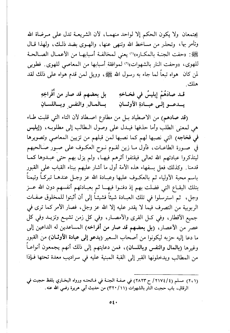 "قَدْ صَادَهُمْ" مِنْ الِاصْطِيَادِ بَلْ مِنْ مُطَاوِعِ اصْطَادَ؛ لِأَنَّ التَّاءَ الَّتِي قُلِبَتْ طَاءً هِيَ لِمَعْنَى الطَّلَبِ وَأَمَّا حَذْفُهَا فَيَدُلُّ عَلَى وُصُولِ الطَّالِبِ إِلَى مَطْلُوبِهِ "إِبْلِيسُ فِي فِخَاخِهِ" الَّتِي نَصَبَهَا لَهُمْ كَمَا نَصَبَهَا لِمَنْ قَبْلَهُمْ مِنْ تَزْيِينِ الْمَعَاصِي وَتَصْوِيرِهَا فِي صُورَةِ الطَّاعَاتِ, فَأَوَّلُ مَا زَيَّنَ لِقَوْمِ نُوحٍ العكوف على صور صَالِحِيهِمْ لِيَتَذَكَّرُوا عِبَادَتَهُمُ اللَّهَ تَعَالَى فَيَقْتَفُوا أَثَرَهُمْ فِيهَا, وَلَمْ يَزَلْ بِهِمْ حَتَّى عَبَدُوهَا كَمَا قَدَّمْنَا. وَكَذَلِكَ فَعَلَ بِسُفَهَاءِ هَذِهِ الْأُمَّةِ أَوَّلُ مَا أَشَارَ عَلَيْهِمْ بِبِنَاءِ الْقِبَابِ عَلَى الْقُبُورِ بِاسْمِ مُحِبَّةِ الْأَوْلِيَاءِ ثُمَّ بِالْعُكُوفِ عَلَيْهَا وَعِبَادَةِ اللَّهِ عَزَّ وَجَلَّ عِنْدَهَا تَبَرُّكًا وَتَيَمُّنًا بِتِلْكَ الْبِقَاعِ الَّتِي فُضِّلَتْ بِهِمْ, إِذْ دُفِنُوا فِيهَا ثُمَّ بِعِبَادَتِهِمْ أَنْفُسِهِمْ دُونَ اللَّهِ عَزَّ وَجَلَّ, ثُمَّ اسْتَرْسَلُوا فِي تِلْكَ الْعِبَادَةِ شَيْئًا فَشَيْئًا إِلَى أَنْ أَثْبَتُوا لِلْمَخْلُوقِ صِفَاتِ الرُّبُوبِيَّةِ مِنَ التَّصَرُّفِ فِيمَا لَا يَقْدِرُ عَلَيْهِ إِلَّا اللَّهُ عَزَّ وَجَلَّ, فَصَارَ الْأَمْرُ كَمَا تَرَى فِي جَمِيعِ الْأَقْطَارِ وَفِي كُلِّ الْقُرَى وَالْأَمْصَارِ وَفِي كُلِّ زَمَنٍ تَشِيعُ وَتَزِيدُ وَفِي كُلِّ عَصْرٍ مِنَ الْأَعْصَارِ "بَلْ بَعْضُهُمْ قَدْ صَارَ مِنْ أَفْرَاخِهِ" الْمُسَاعِدِينَ لَهُ الدَّاعِينَ إِلَى مَا دَعَا إِلَيْهِ حِزْبَهُ؛ لِيَكُونُوا مِنْ أَصْحَابِ السَّعِيرِ "يَدْعُو إِلَى عِبَادَةِ الْأَوْثَانِ" مِنَ الْقُبُورِ وَغَيْرِهَا "بِالْمَالِ وَالنَّفْسِ وَبِاللِّسَانِ" فَمِنْ دَعَايَتِهِمْ إِلَى ذَلِكَ أَنَّهُمْ يَجْمَعُونَ أَنْوَاعًا مِنَ الْمَطَالِبِ وَيُدْخِلُونَهَا الْقَبْرَ إِلَى الْقُبَّةِ الْمَبْنِيَّةِ عَلَيْهِ فِي سَرَادِيبَ مُعَدَّةٍ تَحْتَهَا فَإِذَا