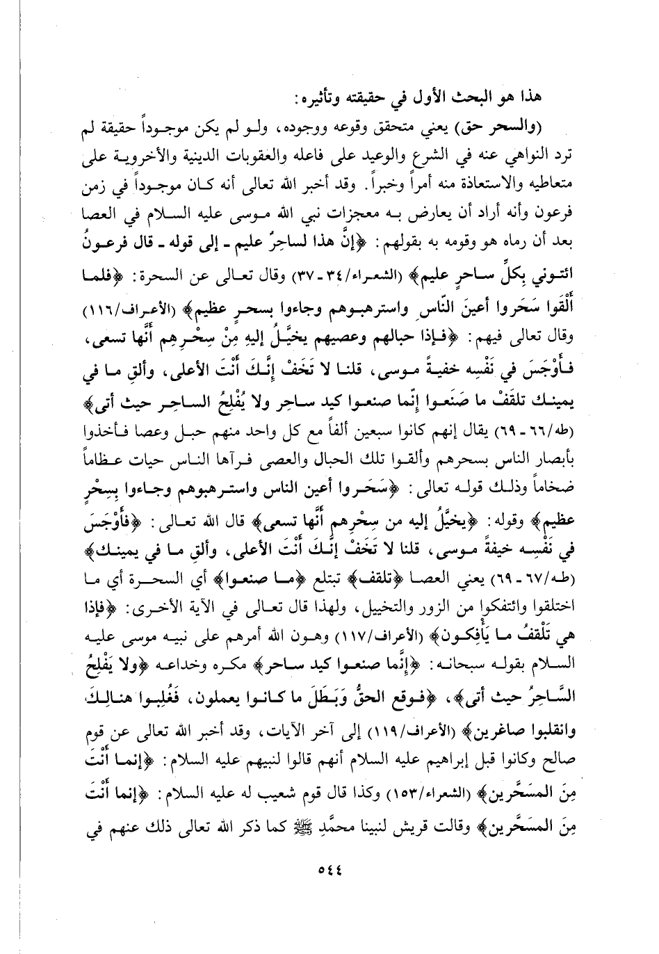 "وَالسِّحْرُ حَقٌّ" يَعْنِي: مُتَحَقِّقٌ وُقُوعُهُ وَوُجُودُهُ, وَلَوْ لَمْ يَكُنْ مَوْجُودًا حَقِيقَةً لَمْ تَرِدِ النَّوَاهِي عَنْهُ فِي الشَّرْعِ وَالْوَعِيدُ عَلَى فَاعِلِهِ وَالْعُقُوبَاتُ الدِّينِيَّةُ وَالْأُخْرَوِيَّةُ عَلَى مُتَعَاطِيهِ وَالِاسْتِعَاذَةُ مِنْهُ أَمْرًا وَخَبَرًا. وَقَدْ أَخْبَرَ اللَّهُ تَعَالَى أَنَّهُ كَانَ مَوْجُودًا فِي زَمَنِ فِرْعَوْنَ وَأَنَّهُ أَرَادَ أَنْ يُعَارِضَ بِهِ مُعْجِزَاتِ نَبِيِّ اللَّهِ مُوسَى -عَلَيْهِ السَّلَامُ- فِي الْعَصَا, بَعْدَ أَنْ رَمَاهُ هُوَ وَقَوْمُهُ بِهِ بِقَوْلِهِمْ: {إِنَّ هَذَا لَسَاحِرٌ عَلِيمٌ} إِلَى قَوْلِهِ: {يَأْتُوكَ بِكُلِّ سَحَّارٍ عَلِيمٍ} [الشُّعَرَاءِ: 34-37] وَقَالَ تَعَالَى عَنِ السَّحَرَةِ: {فَلَمَّا أَلْقَوْا سَحَرُوا أَعْيُنَ النَّاسِ وَاسْتَرْهَبُوهُمْ وَجَاءُوا بِسِحْرٍ عَظِيمٍ} [الْأَعْرَافِ: 116] وَقَالَ تَعَالَى فِيهِمْ: {فَإِذَا حِبَالُهُمْ وَعِصِيُّهُمْ يُخَيَّلُ إِلَيْهِ مِنْ سِحْرِهِمْ أَنَّهَا تَسْعَى، فَأَوْجَسَ فِي نَفْسِهِ خِيفَةً مُوسَى، قُلْنَا لَا تَخَفْ إِنَّكَ أَنْتَ الْأَعْلَى، وَأَلْقِ مَا فِي يَمِينِكَ تَلْقَفْ مَا صَنَعُوا إِنَّمَا صَنَعُوا كَيْدُ سَاحِرٍ وَلَا يُفْلِحُ السَّاحِرُ حَيْثُ أَتَى} [طه: 66-69] يُقَالُ: إِنَّهُمْ كَانُوا سَبْعِينَ أَلْفًا, مَعَ كُلِّ وَاحِدٍ مِنْهُمْ حَبْلٌ وَعَصَا فَأَخَذُوا بِأَبْصَارِ النَّاسِ بِسِحْرِهِمْ, وَأَلْقَوْا تِلْكَ الْحِبَالَ وَالْعِصِيَّ فَرَآهَا النَّاسُ حَيَّاتٍ عِظَامًا ضِخَامًا, وَذَلِكَ قَوْلُهُ تَعَالَى: {سَحَرُوا أَعْيُنَ النَّاسِ وَاسْتَرْهَبُوهُمْ وَجَاءُوا بِسِحْرٍ عَظِيمٍ} وَقَوْلُهُ: {يُخَيَّلُ إِلَيْهِ مِنْ سِحْرِهِمْ أَنَّهَا تَسْعَى} قَالَ اللَّهُ تَعَالَى: {فَأَوْجَسَ فِي نَفْسِهِ خِيفَةً مُوسَى، قُلْنَا لَا تَخَفْ إِنَّكَ أَنْتَ الْأَعْلَى، وَأَلْقِ مَا فِي يَمِينِكَ} [طه: 67-69] يَعْنِي الْعَصَا {تَلْقَفْ} تَبْتَلِعْ {مَا صَنَعُوا} أَيِ: السَّحَرَةُ, أَيْ: ما اختلقوا وائتفكوا مِنَ الزُّورِ وَالتَّخْيِيلِ؛ وَلِهَذَا قَالَ تَعَالَى فِي الْآيَةِ الْأُخْرَى: {فَإِذَا هِيَ تَلْقَفُ مَا يَأْفِكُونَ} [الْأَعْرَافِ: 117] وَهَوَّنَ اللَّهُ أَمَرَهُمْ عَلَى نَبِيِّهِ مُوسَى عَلَيْهِ السَّلَامُ, بِقَوْلِهِ سُبْحَانَهُ: {إِنَّمَا صَنَعُوا كَيْدُ سَاحِرٍ} مَكْرُهُ وَخِدَاعُهُ {وَلَا يُفْلِحُ السَّاحِرُ حَيْثُ أَتَى} {فَوَقَعَ الْحَقُّ وَبَطَلَ مَا كَانُوا يَعْمَلُونَ، فَغُلِبُوا هُنَالِكَ وَانْقَلَبُوا صَاغِرِينَ} [الْأَعْرَافِ: 119] إِلَى أَخِرِ الْآيَاتِ, وَقَدْ أَخْبَرَ اللَّهُ تَعَالَى عَنْ قَوْمِ صَالِحٍ وَكَانُوا قَبْلَ إِبْرَاهِيمَ عَلَيْهِ السَّلَامُ, أَنَّهُمْ قَالُوا لِنَبِيِّهِمْ عَلَيْهِ السَّلَامُ: {إِنَّمَا أَنْتَ مِنَ الْمُسَحَّرِينَ} [الشُّعَرَاءِ: 153] وَكَذَا قَالَ قَوْمُ شُعَيْبٍ لَهُ عَلَيْهِ السَّلَامُ: {إِنَّمَا أَنْتَ مِنَ الْمُسَحَّرِينَ} وَقَالَتْ قُرَيْشٌ لِنَبِيِّنَا مُحَمَّدٍ -صَلَّى اللَّهُ عَلَيْهِ وَسَلَّمَ- كَمَا ذَكَرَ اللَّهُ تَعَالَى ذَلِكَ عَنْهُمْ فِي