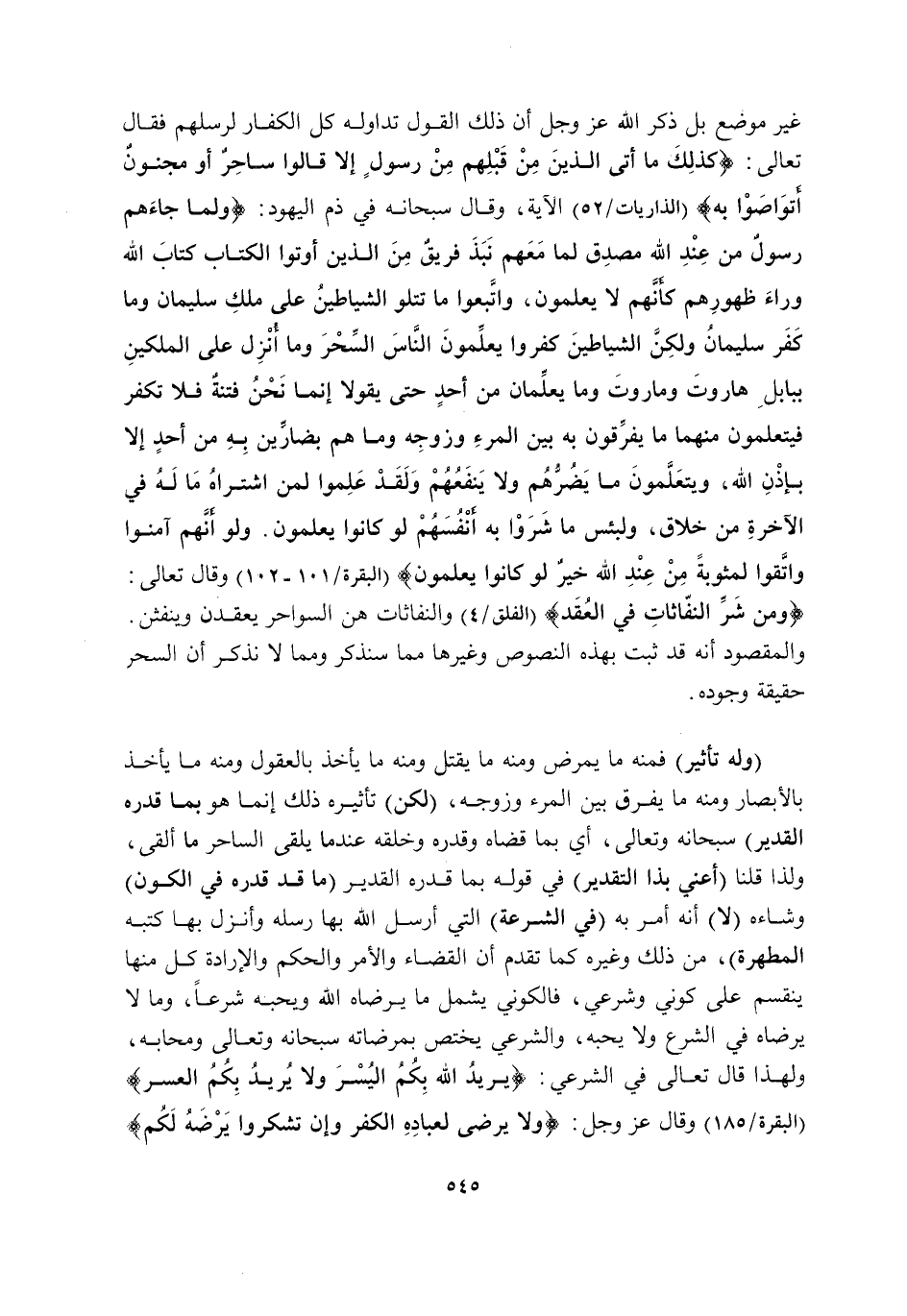 غَيْرِ مَوْضِعٍ, بَلْ ذَكَرَ اللَّهُ -عَزَّ وَجَلَّ- أَنَّ ذَلِكَ الْقَوْلَ تَدَاوَلَهُ كُلُّ الْكُفَّارِ لِرُسُلِهِمْ, فَقَالَ تَعَالَى: {كَذَلِكَ مَا أَتَى الَّذِينَ مِنْ قَبْلِهِمْ مِنْ رَسُولٍ إِلَّا قَالُوا سَاحِرٌ أَوْ مَجْنُونٌ، أَتَوَاصَوْا بِهِ} [الذَّارِيَاتِ: 52] الْآيَةَ, قال سُبْحَانَهُ فِي ذَمِّ الْيَهُودِ: {وَلَمَّا جَاءَهُمْ رَسُولٌ مِنْ عِنْدِ اللَّهِ مُصَدِّقٌ لِمَا مَعَهُمْ نَبَذَ فَرِيقٌ مِنَ الَّذِينَ أُوتُوا الْكِتَابَ كِتَابَ اللَّهِ وَرَاءَ ظُهُورِهِمْ كَأَنَّهُمْ لَا يَعْلَمُونَ، وَاتَّبَعُوا مَا تَتْلُوا الشَّيَاطِينُ عَلَى مُلْكِ سُلَيْمَانَ وَمَا كَفَرَ سُلَيْمَانُ وَلَكِنَّ الشَّيَاطِينَ كَفَرُوا يُعَلِّمُونَ النَّاسَ السِّحْرَ وَمَا أُنْزِلَ عَلَى الْمَلَكَيْنِ بِبَابِلَ هَارُوتَ وَمَارُوتَ وَمَا يُعَلِّمَانِ مِنْ أَحَدٍ حَتَّى يَقُولَا إِنَّمَا نَحْنُ فِتْنَةٌ فَلَا تَكْفُرْ فَيَتَعَلَّمُونَ مِنْهُمَا مَا يُفَرِّقُونَ بِهِ بَيْنَ الْمَرْءِ وَزَوْجِهِ وَمَا هُمْ بِضَارِّينَ بِهِ مِنْ أَحَدٍ إِلَّا بِإِذْنِ اللَّهِ وَيَتَعَلَّمُونَ مَا يَضُرُّهُمْ وَلَا يَنْفَعُهُمْ وَلَقَدْ عَلِمُوا لَمَنِ اشْتَرَاهُ مَا لَهُ فِي الْآخِرَةِ مِنْ خَلَاقٍ وَلَبِئْسَ مَا شَرَوْا بِهِ أَنْفُسَهُمْ لَوْ كَانُوا يَعْلَمُونَ وَلَوْ أَنَّهُمْ آمَنُوا وَاتَّقَوْا لَمَثُوبَةٌ مِنْ عِنْدِ اللَّهِ خَيْرٌ لَوْ كَانُوا يَعْلَمُونَ} [الْبَقَرَةِ: 101، 102] وَقَالَ تَعَالَى: {وَمِنْ شَرِّ النَّفَّاثَاتِ فِي الْعُقَدِ} [الْفَلَقِ: 4] وَالنَّفَّاثَاتُ هُنَّ السَّوَاحِرُ يَعْقِدْنَ وَيَنْفُثْنَ. وَالْمَقْصُودُ أَنَّهُ قَدْ ثَبَتَ بِهَذِهِ النُّصُوصِ وغيرها مما سَنَذْكُرُ وَمِمَّا لَا نَذْكُرُ, أَنَّ السِّحْرَ حَقِيقَةٌ وُجُودُهُ.