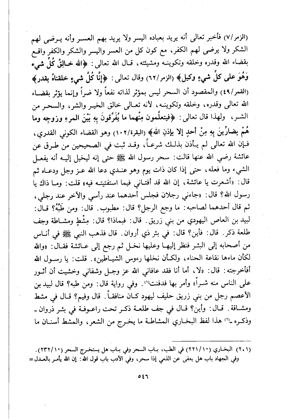 [الزُّمَرِ: 7] فَأَخْبَرَ تَعَالَى أَنَّهُ يُرِيدُ بِعِبَادِهِ الْيُسْرَ وَلَا يُرِيدُ بِهِمُ الْعُسْرَ, وَأَنَّهُ يَرْضَى لَهُمُ الشُّكْرَ وَلَا يَرْضَى لَهُمُ الْكُفْرَ, مَعَ كَوْنِ كُلٍّ مِنَ الْعُسْرِ وَالْيُسْرِ والشكر والكفر واقعا بِقَضَاءِ اللَّهِ وَقَدَرَهِ وَخَلْقِهِ وَتَكْوِينِهِ وَمَشِيئَتِهِ, قَالَ اللَّهُ تَعَالَى: {اللَّهُ خَالِقُ كُلِّ شَيْءٍ وَهُوَ عَلَى كُلِّ شَيْءٍ وَكِيلٌ} [الزُّمَرِ: 62] وَقَالَ تَعَالَى: {إِنَّا كُلَّ شَيْءٍ خَلَقْنَاهُ بِقَدَرٍ} [الْقَمَرِ: 49] وَالْمَقْصُودُ أَنَّ السِّحْرَ لَيْسَ بِمُؤَثِّرٍ لِذَاتِهِ نَفْعًا وَلَا ضَرًّا وَإِنَّمَا يُؤَثِّرُ بِقَضَاءِ اللَّهِ تَعَالَى وَقَدَرِهِ وَخَلْقِهِ وَتَكْوِينِهِ؛ لِأَنَّهُ تَعَالَى خَالِقُ الْخَيْرِ وَالشَّرِّ, وَالسِّحْرُ مِنَ الشَّرِّ؛ وَلِهَذَا قَالَ تَعَالَى: {فَيَتَعَلَّمُونَ مِنْهُمَا مَا يُفَرِّقُونَ بِهِ بَيْنَ الْمَرْءِ وَزَوْجِهِ وَمَا هُمْ بِضَارِّينَ بِهِ مِنْ أَحَدٍ إِلَّا بِإِذْنِ اللَّهِ} [الْبَقَرَةِ: 102] وَهُوَ الْقَضَاءُ الْكَوْنِيُّ الْقَدَرِيُّ, فَإِنَّ اللَّهَ تَعَالَى لَمْ يَأْذَنْ بِذَلِكَ شَرْعًا, وَقَدْ ثَبَتَ فِي الصَّحِيحَيْنِ مِنْ طُرُقٍ عَنْ عَائِشَةَ رَضِيَ اللَّهُ عَنْهَا قَالَتْ: سُحِرَ رَسُولُ اللَّهِ -صَلَّى اللَّهُ عَلَيْهِ وَسَلَّمَ- حَتَّى إِنَّهُ لَيُخَيَّلُ إِلَيْهِ أَنَّهُ يَفْعَلُ الشَّيْءَ وَمَا فَعَلَهُ, حَتَّى إِذَا كَانَ ذَاتَ يَوْمٍ وَهُوَ عِنْدِي دَعَا اللَّهَ -عَزَّ وَجَلَّ- وَدَعَاهُ ثُمَّ قَالَ: "أَشَعَرْتِ يَا عَائِشَةُ, إِنَّ اللَّهَ قَدْ أَفْتَانِي فِيمَا اسْتَفْتَيْتُهُ فِيهِ" قُلْتُ: وَمَا ذَاكَ يَا رَسُولَ اللَّهِ؟ قَالَ: "جَاءَنِي رَجُلَانِ فَجَلَسَ أَحَدُهُمَا عِنْدَ رَأْسِي وَالْآخَرُ عِنْدَ رِجْلِي ثُمَّ قَالَ أَحَدُهُمَا لِصَاحِبِهِ: مَا وَجَعُ الرَّجُلِ؟ قَالَ: مَطْبُوبٌ قَالَ: وَمَنْ طَبَّهُ؟ قَالَ: لَبِيدُ بْنُ الْأَعْصَمِ الْيَهُودِيُّ مِنْ بَنِي زُرَيْقٍ قَالَ: فَبِمَاذَا؟ قَالَ: مِشْطٍ وَمُشَاطَةٍ وَجُفِّ طَلْعَةٍ ذَكَرٍ, قَالَ: فَأَيْنَ؟ قَالَ: فِي بِئْرِ ذي أروان" قالت: فَذَهَبَ النَّبِيُّ صَلَّى اللَّهُ عَلَيْهِ وَسَلَّمَ فِي أُنَاسٍ مِنْ أَصَحَابِهِ إِلَى الْبِئْرِ فَنَظَرَ إِلَيْهَا وَعَلَيْهَا نَخْلٌ ثُمَّ رَجَعَ إِلَى عَائِشَةَ فَقَالَ: "وَاللَّهِ لَكَأَنَّ مَاءَهَا نُقَاعَةُ الْحِنَّاءِ, وَلَكَأَنَّ نَخْلَهَا رُءُوسُ الشَّيَاطِينِ" قُلْتُ: يَا رَسُولَ اللَّهِ أَفَأَخْرَجْتَهُ؟ قَالَ: "لَا أَمَّا أَنَا فَقَدْ عَافَانِي اللَّهُ عَزَّ وَجَلَّ وَشَفَانِي, وَخَشِيتُ أَنْ أُثَوِّرَ عَلَى النَّاسِ مِنْهُ شَرًّا" وَأَمَرَ بِهَا فَدُفِنَتْ1. وَفِي رِوَايَةٍ قَالَ: "وَمَنْ طَبَّهُ؟ قَالَ: لَبِيدُ بْنُ الْأَعْصَمِ رَجُلٌ مِنْ بَنِي زُرَيْقٍ حَلِيفٌ لِيَهُودَ كَانَ مُنَافِقًا, قَالَ: وَفِيمَ؟ قَالَ: فِي مِشْطٍ وَمُشَاقَةٍ قَالَ: وَأَيْنَ؟ قَالَ: فِي جُفِّ طَلْعَةٍ ذَكَرٍ تَحْتَ رَاعُوفَةٍ فِي بِئْرِ ذَرْوَانَ" وَذَكَرَهُ2. هَذَا لَفْظُ الْبُخَارِيِّ, الْمُشَاطَةُ مَا يَخْرُجُ مِنَ الشَّعْرِ وَالْمِشْطُ أَسْنَانُ مَا