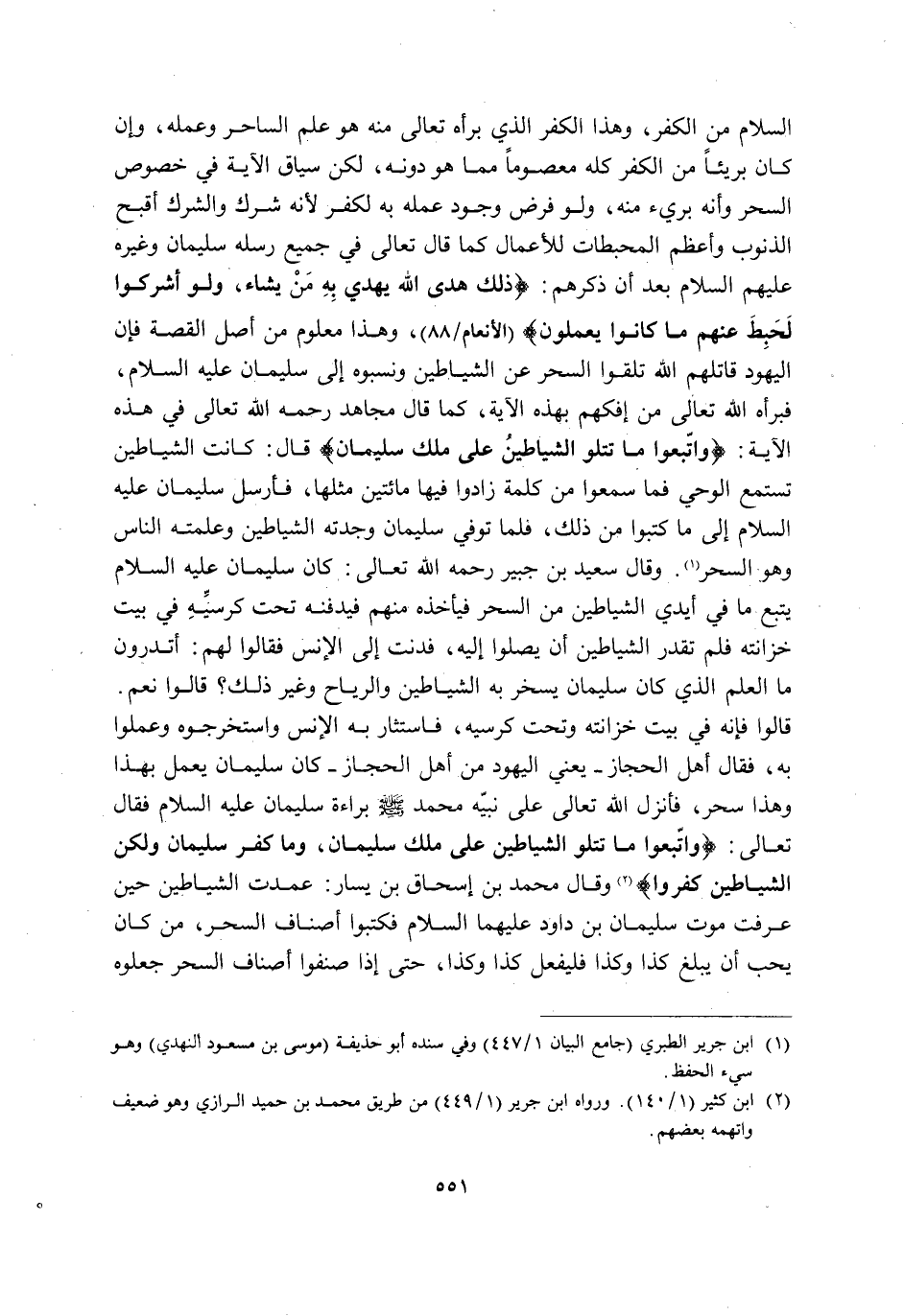 السَّلَامُ مِنَ الكفر, وهذا الْكُفْرِ الَّذِي بَرَّأَهُ تَعَالَى مِنْهُ هُوَ عِلْمُ السَّاحِرِ وَعَمَلُهُ, وَإِنْ كَانَ بَرِيئًا مِنَ الْكُفْرِ كُلِّهِ مَعْصُومًا مِمَّا هُوَ دُونَهُ, لَكِنَّ سِيَاقَ الْآيَةِ فِي خُصُوصِ السِّحْرِ وَأَنَّهُ بَرِيءٌ مِنْهُ, وَلَوْ فُرِضَ وُجُودُ عَمَلِهِ بِهِ لَكَفَرَ لِأَنَّهُ شِرْكٌ وَالشِّرْكُ أَقْبَحُ الذُّنُوبِ وَأَعْظَمُ الْمُحْبِطَاتِ لِلْأَعْمَالِ كَمَا قَالَ تَعَالَى فِي جَمِيعِ رُسُلِهِ سُلَيْمَانَ وَغَيْرِهِ -عَلَيْهِمُ السَّلَامُ- بَعْدَ أَنْ ذَكَرَهُمْ: {ذَلِكَ هُدَى اللَّهِ يَهْدِي بِهِ مَنْ يَشَاءُ مِنْ عِبَادِهِ وَلَوْ أَشْرَكُوا لَحَبِطَ عَنْهُمْ مَا كَانُوا يَعْمَلُونَ} [الْأَنْعَامِ: 88] وَهَذَا مَعْلُومٌ مِنْ أَصْلِ الْقِصَّةِ, فَإِنَّ الْيَهُودَ قَاتَلَهُمُ اللَّهُ تَلَقَّوُا السِّحْرَ عَنِ الشَّيَاطِينِ وَنَسَبُوهُ إِلَى سُلَيْمَانَ عَلَيْهِ السَّلَامُ, فَبَرَّأَهُ اللَّهُ تَعَالَى مِنْ إِفْكِهِمْ بِهَذِهِ الْآيَةِ, كَمَا قَالَ مُجَاهِدٌ رَحِمَهُ اللَّهُ تَعَالَى فِي هَذِهِ الْآيَةِ: {وَاتَّبَعُوا مَا تَتْلُوا الشَّيَاطِينُ عَلَى مُلْكِ سُلَيْمَانَ} قَالَ: كَانَتِ الشَّيَاطِينُ تَسْتَمِعُ الْوَحْيَ فَمَا سَمِعُوا مِنْ كَلِمَةٍ زَادُوا فِيهَا مِائَتَيْنِ مِثْلَهَا, فَأُرْسِلَ سُلَيْمَانُ -عَلَيْهِ السَّلَامُ- إِلَى مَا كَتَبُوا مِنْ ذَلِكَ, فَلَمَّا تُوُفِّيَ سُلَيْمَانُ وَجَدَتْهُ الشَّيَاطِينُ وَعَلَّمَتْهُ النَّاسَ وَهُوَ السِّحْرُ1. وَقَالَ سَعِيدُ بْنُ جُبَيْرٍ رَحِمَهُ اللَّهُ تَعَالَى: كَانَ سُلَيْمَانُ عَلَيْهِ السَّلَامُ يَتَّبِعُ مَا فِي أَيْدِي الشَّيَاطِينِ مِنَ السِّحْرِ فَيَأْخُذُهُ مِنْهُمْ فَيَدْفِنُهُ تَحْتَ كُرْسِيِّهِ فِي بَيْتِ خِزَانَتِهِ, فَلَمْ تَقْدِرِ الشَّيَاطِينُ أَنْ يَصِلُوا إِلَيْهِ, فَدَنَتْ إِلَى الْإِنْسِ فَقَالُوا لَهُمْ: أَتَدْرُونَ مَا الْعِلْمُ الَّذِي كَانَ سُلَيْمَانُ يُسَخِّرُ بِهِ الشَّيَاطِينَ وَالرِّيَاحَ وَغَيْرَ ذَلِكَ؟ قَالُوا: نَعَمْ قَالُوا: فَإِنَّهُ في بيت خرانته وَتَحْتَ كُرْسِيِّهِ, فَاسْتَثَارَ بِهِ الْإِنْسُ وَاسْتَخْرَجُوهُ وَعَمِلُوا بِهِ, فَقَالَ أَهْلُ الْحِجَازِ, يَعْنِي الْيَهُودُ مِنْ أَهْلِ الْحِجَازِ: كَانَ سُلَيْمَانُ يَعْمَلُ بِهَذَا وَهَذَا سِحْرٌ, فَأَنْزَلَ اللَّهُ تَعَالَى عَلَى نَبِيِّهِ مُحَمَّدٍ -صَلَّى اللَّهُ عَلَيْهِ وَسَلَّمَ- بَرَاءَةَ سُلَيْمَانَ -عَلَيْهِ السَّلَامُ- فَقَالَ تَعَالَى: {وَاتَّبَعُوا مَا تَتْلُوا الشَّيَاطِينُ عَلَى مُلْكِ سُلَيْمَانَ وَمَا كَفَرَ سُلَيْمَانُ وَلَكِنَّ الشَّيَاطِينَ كَفَرُوا} 2. وَقَالَ مُحَمَّدُ بْنُ إِسْحَاقَ بْنِ يَسَارٍ: عَمَدَتِ الشَّيَاطِينُ حِينَ عَرَفَتْ مَوْتَ سُلَيْمَانَ بْنَ دَاوُدَ عَلَيْهِمَا السَّلَامُ, فَكَتَبُوا أَصْنَافَ السِّحْرِ, مَنْ كَانَ يُحِبُّ أَنْ يَبْلُغَ كَذَا وَكَذَا فَلْيَفْعَلْ كَذَا وَكَذَا, حَتَّى إِذَا صَنَّفُوا أَصْنَافَ السِّحْرِ جَعَلُوهُ