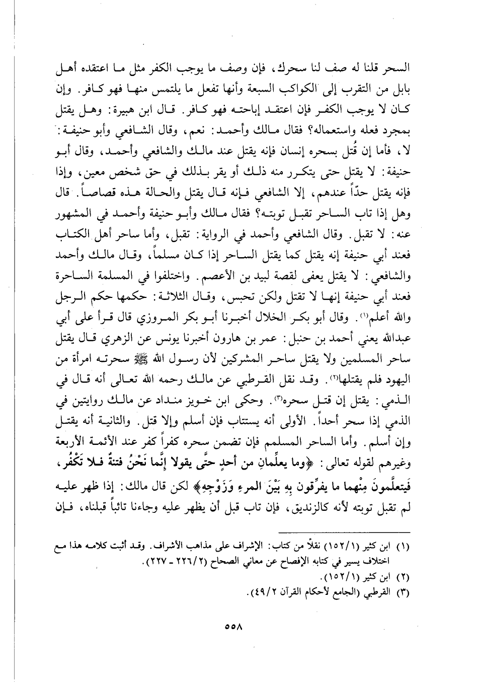 السِّحْرَ قُلْنَا لَهُ: صِفْ لَنَا سِحْرَكَ, فَإِنَّ وَصَفَ مَا يُوجِبُ الْكُفْرَ مِثْلَ مَا اعْتَقَدَهُ أَهْلُ بَابِلَ مِنَ التَّقَرُّبِ إِلَى الْكَوَاكِبِ السَّبْعَةِ وَأَنَّهَا تَفْعَلُ مَا يُلْتَمَسُ مِنْهَا فَهُوَ كَافِرٌ, وَإِنْ كَانَ لَا يُوجِبُ الْكُفْرَ فَإِنِ اعْتَقَدَ إِبَاحَتَهُ فَهُوَ كَافِرٌ. قَالَ ابْنُ هُبَيْرَةَ وَهَلْ يُقْتَلُ بِمُجَرَّدِ فِعْلِهِ وَاسْتِعْمَالِهِ؟ قَالَ مَالِكٌ وَأَحْمَدُ: نَعَمْ وَقَالَ الشَّافِعِيُّ وَأَبُو حَنِيفَةَ: لَا فَأَمَّا إِنْ قتل بسحره إنسان فَإِنَّهُ يُقْتَلُ عِنْدَ مَالِكٍ وَالشَّافِعِيِّ وَأَحْمَدَ, وَقَالَ أَبُو حَنِيفَةَ: لَا يُقْتَلُ حَتَّى يَتَكَرَّرَ مِنْهُ ذَلِكَ أَوْ يُقِرَّ بِذَلِكَ فِي حَقِّ شَخْصٍ مُعَيَّنٍ وَإِذًا فَإِنَّهُ يُقْتَلُ حَدًّا عِنْدَهُمْ إِلَّا الشَّافِعِيُّ فَإِنَّهُ قَالَ: يُقْتَلُ والحالة هذه قصاص قَالَ: وَهَلْ إِذَا تَابَ السَّاحِرُ تُقْبَلُ تَوْبَتُهُ؟ فَقَالَ مَالِكٌ وَأَبُو حَنِيفَةَ وَأَحْمَدُ فِي الْمَشْهُورِ عَنْهُ: لَا تُقْبَلُ وَقَالَ الشَّافِعِيُّ وَأَحْمَدُ فِي الرِّوَايَةِ: تُقْبَلُ, وَأَمَّا سَاحِرُ أَهْلِ الْكِتَابِ فَعِنْدَ أَبِي حَنِيفَةَ أَنَّهُ يُقْتَلُ كَمَا يُقْتَلُ السَّاحِرُ إِذَا كَانَ مُسْلِمًا, وَقَالَ مَالِكٌ وَأَحْمَدُ وَالشَّافِعِيُّ: لَا يُقْتَلُ, يُعْفَى لِقِصَّةِ لَبِيدِ بْنِ الْأَعْصَمِ. وَاخْتَلَفُوا فِي الْمُسْلِمَةِ السَّاحِرَةِ فَعِنْدَ أَبِي حَنِيفَةَ أَنَّهَا لَا تُقْتَلُ وَلَكِنْ تُحْبَسُ, وَقَالَ الثَّلَاثَةُ: حُكْمُهَا حُكْمُ الرَّجُلِ وَاللَّهُ أَعْلَمُ1. وَقَالَ أَبُو بَكْرٍ الْخَلَّالُ: أَخْبَرَنَا أَبُو بَكْرٍ الْمَرْوَزِيُّ قَالَ: قَرَأَ عَلَى أَبِي عَبْدِ اللَّهِ -يَعْنِي أَحْمَدَ بْنَ حَنْبَلٍ- عُمَرُ بْنُ هَارُونَ أَخْبَرَنَا يُونُسُ عَنِ الزُّهْرِيِّ قَالَ: يُقْتَلُ سَاحِرُ الْمُسْلِمِينَ وَلَا يُقْتَلُ سَاحِرُ الْمُشْرِكِينَ؛ لِأَنَّ رَسُولَ اللَّهِ -صَلَّى اللَّهُ عَلَيْهِ وَسَلَّمَ- سَحَرَتْهُ امْرَأَةٌ مِنَ الْيَهُودِ فَلَمْ يَقْتُلْهَا2. وَقَدْ نَقَلَ الْقُرْطُبِيُّ عَنْ مَالِكٍ رَحِمَهُ اللَّهُ تَعَالَى أَنَّهُ قَالَ فِي الذِّمِّيِّ: يُقْتَلُ إِنْ قَتَلَ سِحْرُهُ3. وَحَكَى ابْنُ خُوَيْزِ مَنْدَادُ عَنْ مَالِكٍ رِوَايَتَيْنِ فِي الذِّمِّيِّ إِذَا سَحَرَ أَحَدًا: الْأُولَى أنه يستتاب إن أَسْلَمَ وَإِلَّا قُتِلَ, وَالثَّانِيَةُ: أَنَّهُ يُقْتَلُ وَإِنْ أَسْلَمَ. وَأَمَّا السَّاحِرُ الْمُسْلِمُ فَإِنْ تَضَمَّنَ سِحْرُهُ كُفْرًا كَفَرَ عِنْدَ الْأَئِمَّةِ الْأَرْبَعَةِ وَغَيْرِهِمْ لِقَوْلِهِ تَعَالَى: {وَمَا يُعَلِّمَانِ مِنْ أَحَدٍ حَتَّى يَقُولَا إِنَّمَا نَحْنُ فِتْنَةٌ فَلَا تَكْفُرْ فَيَتَعَلَّمُونَ مِنْهُمَا مَا يُفَرِّقُونَ بِهِ بَيْنَ الْمَرْءِ وَزَوْجِهِ} لَكِنْ قَالَ مَالِكٌ: إِذَا ظَهَرَ عَلَيْهِ لَمْ تُقْبَلْ تَوْبَتُهُ؛ لِأَنَّهُ كَالزِّنْدِيقِ, فَإِنْ تَابَ قَبْلَ أَنْ يَظْهَرَ عَلَيْهِ وَجَاءَنَا تَائِبًا قَبِلْنَاهُ, فَإِنْ