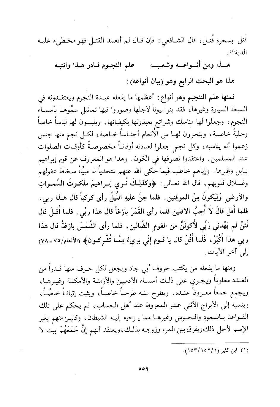 فَمِنْهَا عِلْمُ التَّنْجِيمِ وَهُوَ أَنْوَاعٌ: أَعْظَمُهَا مَا يَفْعَلُهُ عَبْدَةُ النُّجُومِ وَيَعْتَقِدُونَهُ فِي السَّبْعَةِ السَّيَّارَةِ وَغَيْرِهَا, فَقَدْ بَنَوْا بُيُوتًا لِأَجْلِهَا وَصَوَّرُوا فِيهَا تَمَاثِيلَ سَمَّوْهَا بِأَسْمَاءِ النُّجُومِ, وَجَعَلُوا لَهَا مَنَاسِكَ وَشَرَائِعَ يَعْبُدُونَهَا بِكَيْفِيَّاتِهَا, وَيَلْبَسُونَ لَهَا لِبَاسًا خَاصًّا وَحِلْيَةً خَاصَّةً وَيَنْحَرُونَ لَهَا مِنَ الْأَنْعَامِ أَجْنَاسًا خَاصَّةً, لِكُلِّ نَجْمٍ مِنْهَا جِنْسٌ زَعَمُوا أَنَّهُ يُنَاسِبُهُ, وَكُلُّ نَجْمٍ جَعَلُوا لِعِبَادَتِهِ أَوْقَاتًا مَخْصُوصَةً كَأَوْقَاتِ الصَّلَوَاتِ عِنْدَ الْمُسْلِمِينَ, وَاعْتَقَدُوا تَصَرُّفَهَا فِي الْكَوْنِ. وَهَذَا هُوَ الْمَعْرُوفُ عَنْ قَوْمِ إِبْرَاهِيمَ بِبَابِلَ وَغَيْرِهَا, وَإِيَّاهُمْ خَاطَبَ فِيمَا حَكَى اللَّهُ عنهم متحديا لهم مُبَيِّنًا سَخَافَةَ عُقُولِهِمْ وَضَلَالَ قُلُوبِهِمْ, قَالَ تَعَالَى: {وَكَذَلِكَ نُرِي إِبْرَاهِيمَ مَلَكُوتَ السَّمَاوَاتِ وَالْأَرْضِ وَلِيَكُونَ مِنَ الْمُوقِنِينَ، فَلَمَّا جَنَّ عَلَيْهِ اللَّيْلُ رَأَى كَوْكَبًا قَالَ هَذَا رَبِّي فَلَمَّا أَفَلَ قَالَ لَا أُحِبُّ الْآفِلِينَ، فَلَمَّا رَأَى الْقَمَرَ بَازِغًا قَالَ هَذَا رَبِّي فَلَمَّا أَفَلَ قَالَ لَئِنْ لَمْ يَهْدِنِي رَبِّي لَأَكُونَنَّ مِنَ الْقَوْمِ الضَّالِّينَ، فَلَمَّا رَأَى الشَّمْسَ بَازِغَةً قَالَ هَذَا رَبِّي هَذَا أَكْبَرُ فَلَمَّا أَفَلَتْ قَالَ يَا قَوْمِ إِنِّي بَرِيءٌ مِمَّا تُشْرِكُونَ} [الْأَنْعَامِ: 75-78] إِلَى آخِرِ الْآيَاتِ.