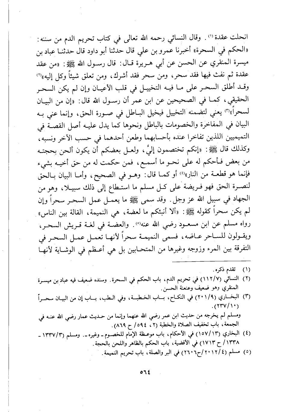 انْحَلَّتْ عُقْدَةٌ1. وَقَالَ النَّسَائِيُّ رَحِمَهُ اللَّهُ تَعَالَى فِي كِتَابِ تَحْرِيمِ الدَّمِ مِنْ سُنَنِهِ "الْحُكْمُ فِي السَّحَرَةِ": أَخْبَرَنَا عَمْرُو بْنُ عَلِيٍّ قَالَ: حَدَّثَنَا أَبُو دَاوُدَ قَالَ: حَدَّثَنَا عَبَّادُ بْنُ مَيْسَرَةَ الْمُنَقِّرِيُّ عَنِ الْحَسَنِ عَنْ أَبِي هُرَيْرَةَ قَالَ: قَالَ رَسُولُ اللَّهِ صَلَّى اللَّهُ عَلَيْهِ وَسَلَّمَ: "مَنْ عَقَدَ عُقْدَةً ثُمَّ نَفَثَ فِيهَا فَقَدْ سَحَرَ, وَمَنْ سَحَرَ فَقَدْ أَشْرَكَ, وَمَنْ تَعَلَّقَ شَيْئًا وُكِّلَ إِلَيْهِ"2. وَقَدْ أُطْلِقَ السِّحْرُ عَلَى مَا فِيهِ التَّخْيِيلُ فِي قَلْبِ الْأَعْيَانِ وَإِنْ لَمْ يَكُنِ السِّحْرُ الْحَقِيقِيُّ, كَمَا فِي الصَّحِيحَيْنِ عَنِ ابْنِ عُمَرَ أَنَّ رَسُولَ اللَّهِ قَالَ: "إِنَّ مِنَ الْبَيَانِ لَسِحْرًا" 3 يَعْنِي: لِتَضَمُّنِهِ التَّخْيِيلَ فَيُخَيِّلُ الْبَاطِلَ فِي صُورَةِ الْحَقِّ, وَإِنَّمَا عُنِيَ بِهِ الْبَيَانُ فِي الْمُفَاخَرَةِ وَالْخُصُومَاتِ بِالْبَاطِلِ وَنَحْوِهَا كَمَا يَدُلُّ عَلَيْهِ أَصْلُ الْقِصَّةِ فِي التَّمِيمِيَّيْنَ اللَّذَيْنِ تَفَاخَرَا عِنْدَهُ بِأَحْسَابِهِمَا وَطَعَنَ أَحَدُهُمَا فِي حَسَبِ الْآخَرِ وَنَسَبِهِ, وَكَذَلِكَ قَالَ صَلَّى اللَّهُ عَلَيْهِ وَسَلَّمَ: "إِنَّكُمْ تَخْتَصِمُونَ إِلَيَّ, وَلَعَلَّ بَعْضَكُمْ أَنْ يَكُونَ أَلْحَنَ بِحُجَّتِهِ مِنْ بَعْضٍ فَأَحْكُمُ لَهُ عَلَى نَحْوِ مَا أَسْمَعُ, فَمَنْ حَكَمْتُ لَهُ مِنْ حَقِّ أَخِيهِ بِشَيْءٍ فَإِنَّمَا هُوَ قِطْعَةٌ مِنَ النَّارِ" 4 أَوْ كَمَا قَالَ: وَهُوَ فِي الصَّحِيحِ, وَأَمَّا الْبَيَانُ بِالْحَقِّ لِنُصْرَةِ الْحَقِّ فَهُوَ فَرِيضَةٌ عَلَى كُلِّ مُسْلِمٍ مَا اسْتَطَاعَ إِلَى ذَلِكَ سَبِيلًا, وَهُوَ مِنَ الْجِهَادِ فِي سَبِيلِ اللَّهِ عَزَّ وَجَلَّ, وَقَدْ سَمَّى صَلَّى اللَّهُ عَلَيْهِ وَسَلَّمَ مَا يَعْمَلُ عَمَلَ السِّحْرِ سِحْرًا, وَإِنْ لَمْ يَكُنْ سِحْرًا كَقَوْلِهِ صَلَّى اللَّهُ عَلَيْهِ وَسَلَّمَ: "أَلَا أُنَبِّئُكُمْ مَا الْعَضْهُ, هِيَ النَّمِيمَةُ الْقَالَةُ بَيْنَ النَّاسِ" رَوَاهُ مُسْلِمٌ عَنِ ابْنِ مَسْعُودٍ رَضِيَ اللَّهُ عَنْهُ5. وَالْعَضْهُ فِي لُغَةِ قُرَيْشٍ السِّحْرُ وَيَقُولُونَ لِلسَّاحِرِ: عَاضِهٌ, فَسَمَّى النَّمِيمَةَ سِحْرًا؛ لِأَنَّهَا تَعْمَلُ عَمَلَ السِّحْرِ فِي التَّفْرِقَةِ بَيْنَ المرء وزوجه وغيرها مِنَ الْمُتَحَابِّينَ, بَلْ هِيَ أَعْظَمُ فِي الْوِشَايَةِ لِأَنَّهَا