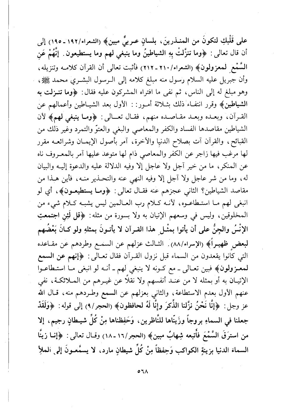 عَلَى قَلْبِكَ لِتَكُونَ مِنَ الْمُنْذِرِينَ، بِلِسَانٍ عَرَبِيٍّ مُبِينٍ} [الشُّعَرَاءِ: 192-195] إِلَى أَنْ قَالَ تَعَالَى: {وَمَا تَنَزَّلَتْ بِهِ الشَّيَاطِينُ، وَمَا يَنْبَغِي لَهُمْ وَمَا يَسْتَطِيعُونَ، إِنَّهُمْ عَنِ السَّمْعِ لَمَعْزُولُونَ} [الشُّعَرَاءِ: 210-212] فَأَثْبَتَ تَعَالَى أَنَّ الْقُرْآنَ كَلَامُهُ وَتَنْزِيلُهُ, وَأَنَّ جِبْرِيلَ -عَلَيْهِ السَّلَامُ- رَسُولٌ مِنْهُ مُبَلِّغٌ كَلَامَهُ إِلَى الرَّسُولِ الْبِشْرِيِّ مُحَمَّدٍ صَلَّى اللَّهُ عَلَيْهِ وَسَلَّمَ, وَهُوَ مُبَلِّغٌ لَهُ إِلَى النَّاسِ, ثُمَّ نَفَى مَا افْتَرَاهُ الْمُشْرِكُونَ عَلَيْهِ فَقَالَ: {وَمَا تَنَزَّلَتْ بِهِ الشَّيَاطِينُ} وَقَرَّرَ انْتِفَاءَ ذَلِكَ بِثَلَاثَةِ أُمُورٍ: الْأَوَّلُ: بُعْدُ الشَّيَاطِينِ وَأَعْمَالِهِمْ عَنِ الْقُرْآنِ, وَبُعْدُهُ وَبُعْدُ مَقَاصِدِهِ مِنْهُمْ, فَقَالَ تَعَالَى: {وَمَا يَنْبَغِي لَهُمْ} لِأَنَّ الشَّيَاطِينَ مَقَاصِدُهَا الْفَسَادُ وَالْكُفْرُ وَالْمَعَاصِي وَالْبَغْيُ وَالْعُتُوُّ وَالتَّمَرُّدُ وَغَيْرُ ذَلِكَ مِنَ الْقَبَائِحِ, وَالْقُرْآنُ آتٍ بِصَلَاحِ الدُّنْيَا وَالْآخِرَةِ, آمِرٌ بِأُصُولِ الْإِيمَانِ وَشَرَائِعِهِ, مُقَرِّرٌ لَهَا مُرَغِّبٌ فِيهَا, زَاجِرٌ عَنِ الْكُفْرِ وَالْمَعَاصِي ذَامٌّ لَهَا مُتَوَعِّدٌ عَلَيْهَا, آمِرٌ بِالْمَعْرُوفِ نَاهٍ عَنِ الْمُنْكَرِ, مَا مِنْ خَيْرٍ آجِلٍ وَلَا عَاجِلٍ إِلَّا وَفِيهِ الدَّلَالَةُ عَلَيْهِ وَالدَّعْوَةُ إِلَيْهِ وَالْبَيَانُ لَهُ, وَمَا مِنْ شَرٍّ عَاجِلٍ وَلَا آجِلٍ إِلَّا وَفِيهِ النَّهْيُ عَنْهُ وَالتَّحْذِيرُ مِنْهُ, فَأَيْنَ هَذَا مِنْ مَقَاصِدِ الشَّيَاطِينِ؟ الثَّانِي: عَجْزُهُمْ عَنْهُ فَقَالَ تَعَالَى: {وَمَا يَسْتَطِيعُونَ} أَيْ: لَوِ انْبَغَى لَهُمْ مَا اسْتَطَاعُوهُ؛ لِأَنَّهُ كَلَامُ رَبِّ الْعَالَمِينَ لَيْسَ يُشْبِهُ كَلَامَ شَيْءٍ مِنَ الْمَخْلُوقِينَ, وَلَيْسَ فِي وُسْعِهِمُ الْإِتْيَانُ بِهِ وَلَا بِسُورَةٍ مِنْ مِثْلِهِ: {قُلْ لَئِنِ اجْتَمَعَتِ الْإِنْسُ وَالْجِنُّ عَلَى أَنْ يَأْتُوا بِمِثْلِ هَذَا الْقُرْآنِ لَا يَأْتُونَ بِمِثْلِهِ وَلَوْ كَانَ بَعْضُهُمْ لِبَعْضٍ ظَهِيرًا} [الْإِسْرَاءِ: 88] . الثَّالِثُ: عَزْلُهُمْ عَنِ السَّمْعِ وَطَرْدُهُمْ عَنْ مَقَاعِدِهِ الَّتِي كَانُوا يَقْعُدُونَ مِنَ السَّمَاءِ قَبْلَ نُزُولِ الْقُرْآنِ, فَقَالَ تَعَالَى: {إِنَّهُمْ عَنِ السَّمْعِ لَمَعْزُولُونَ} فَبَيَّنَ تَعَالَى -مَعَ كَوْنِهِ لَا يَنْبَغِي لَهُمْ- أَنَّهُ لَوِ انْبَغَى مَا اسْتَطَاعُوا الْإِتْيَانَ بِهِ أَوْ بِمِثْلِهِ لَا مِنْ عِنْدِ أَنْفُسِهِمْ وَلَا نَقْلًا عَنْ غَيْرِهِمْ مِنَ الْمَلَائِكَةِ, نَفَى عَنْهُمُ الْأَوَّلَ بِعَدَمِ الِاسْتِطَاعَةِ وَالثَّانِيَ بِعَزْلِهِمْ عَنِ السَّمْعِ وَطَرْدِهِمْ مِنْهُ, قَالَ اللَّهُ عَزَّ وَجَلَّ: {إِنَّا نَحْنُ نَزَّلْنَا الذِّكْرَ وَإِنَّا لَهُ لَحَافِظُونَ} [الْحِجْرِ: 9] إِلَى قَوْلِهِ: {وَلَقَدْ جَعَلْنَا فِي السَّمَاءِ بُرُوجًا وَزَيَّنَّاهَا لِلنَّاظِرِينَ، وَحَفِظْنَاهَا مِنْ كُلِّ شَيْطَانٍ رَجِيمٍ، إِلَّا مَنِ اسْتَرَقَ السَّمْعَ فَأَتْبَعَهُ شِهَابٌ مُبِينٌ} [الْحِجْرِ: 16-18] وَقَالَ تَعَالَى: {إِنَّا زَيَّنَّا السَّمَاءَ الدُّنْيَا بِزِينَةٍ الْكَوَاكِبِ، وَحِفْظًا مِنْ كُلِّ شَيْطَانٍ مَارِدٍ، لَا يَسَّمَّعُونَ إِلَى الْمَلَإِ