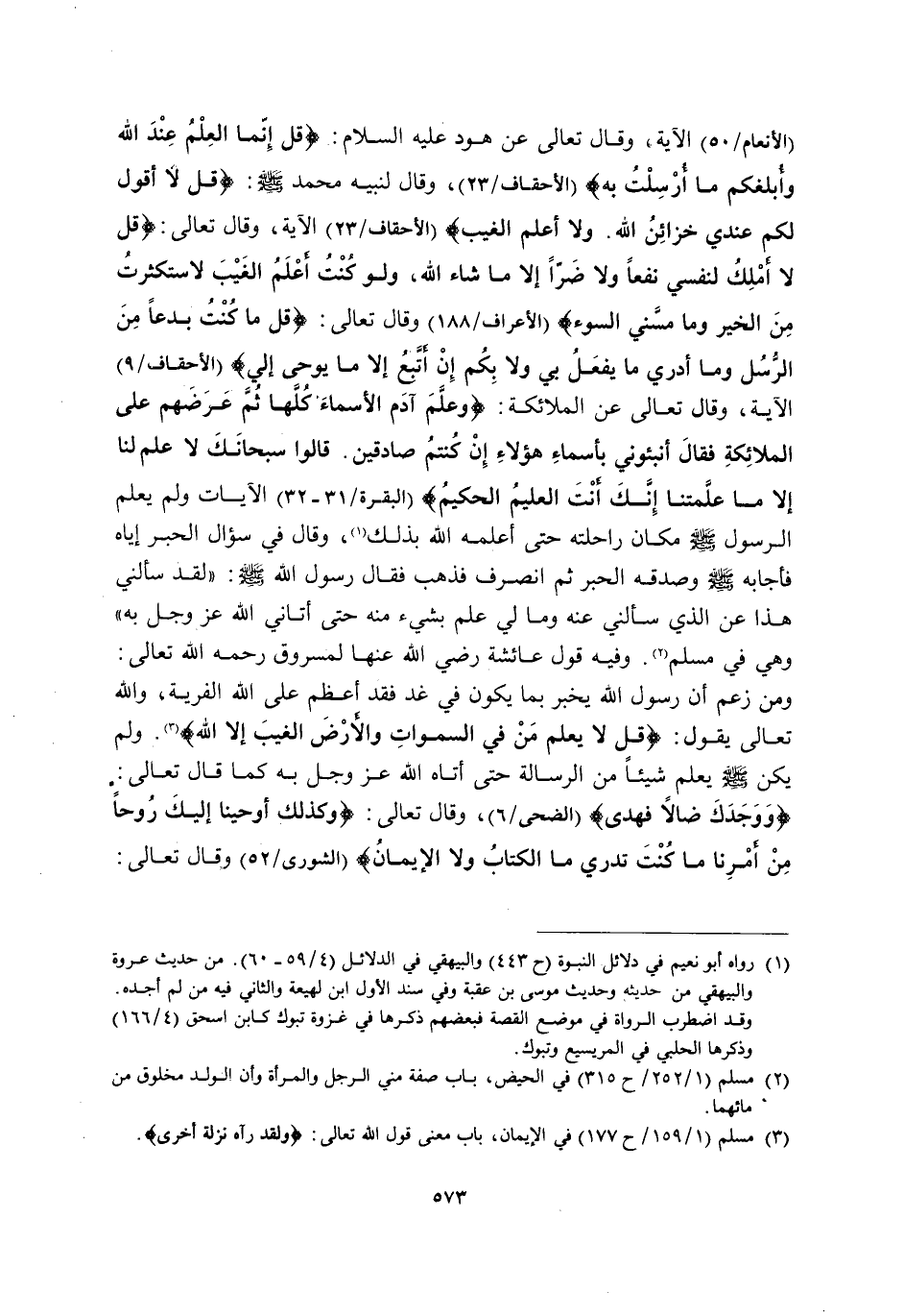 [الْأَنْعَامِ: 50] الْآيَةَ, وَقَالَ تَعَالَى عَنْ هُودٍ عَلَيْهِ السَّلَامُ: {قَالَ إِنَّمَا الْعِلْمُ عِنْدَ اللَّهِ وَأُبَلِّغُكُمْ مَا أُرْسِلْتُ بِهِ} [الْأَحْقَافِ: 23] وَقَالَ لِنَبِيِّهِ مُحَمَّدٍ صَلَّى اللَّهُ عَلَيْهِ وَسَلَّمَ: {قُلْ لَا أَقُولُ لَكُمْ عِنْدِي خَزَائِنُ اللَّهِ وَلَا أَعْلَمُ الْغَيْبَ} [الأنعام: 50] الآية, وَقَالَ تَعَالَى: {قُلْ لَا أَمْلِكُ لِنَفْسِي نَفْعًا وَلَا ضَرًّا إِلَّا مَا شَاءَ اللَّهُ وَلَوْ كُنْتُ أَعْلَمُ الْغَيْبَ لَاسْتَكْثَرْتُ مِنَ الْخَيْرِ وَمَا مَسَّنِيَ السُّوءُ} [الْأَعْرَافِ: 188] وَقَالَ تَعَالَى: {قُلْ مَا كُنْتُ بِدْعًا مِنَ الرُّسُلِ وَمَا أَدْرِي مَا يُفْعَلُ بِي وَلَا بِكُمْ إِنْ أَتَّبِعُ إِلَّا مَا يُوحَى إِلَيَّ} [الْأَحْقَافِ: 9] الْآيَةَ, وَقَالَ تَعَالَى عَنِ الْمَلَائِكَةِ: {وَعَلَّمَ آدَمَ الْأَسْمَاءَ كُلَّهَا ثُمَّ عَرَضَهُمْ عَلَى الْمَلَائِكَةِ فَقَالَ أَنْبِئُونِي بِأَسْمَاءِ هَؤُلَاءِ إِنْ كُنْتُمْ صَادِقِينَ، قَالُوا سُبْحَانَكَ لَا عِلْمَ لَنَا إِلَّا مَا عَلَّمْتَنَا إِنَّكَ أَنْتَ الْعَلِيمُ الْحَكِيمُ} [الْبَقَرَةِ: 31، 32] الْآيَاتِ, وَلَمْ يَعْلَمِ الرَّسُولُ صَلَّى اللَّهُ عَلَيْهِ وَسَلَّمَ مَكَانَ رَاحِلَتِهِ حَتَّى أَعْلَمَهُ اللَّهُ بِذَلِكَ1, وَقَالَ فِي سُؤَالِ الْحَبْرِ إِيَّاهُ فَأَجَابَهُ صَلَّى اللَّهُ عَلَيْهِ وَسَلَّمَ وَصَدَّقَهُ الْحَبْرُ ثُمَّ انْصَرَفَ فَذَهَبَ فَقَالَ رَسُولُ اللَّهِ صَلَّى اللَّهُ عَلَيْهِ وَسَلَّمَ: "لَقَدْ سَأَلَنِي هَذَا عَنِ الَّذِي سَأَلَنِي عَنْهُ, وَمَا لِي عِلْمٌ بِشَيْءٍ مِنْهُ حَتَّى أَتَانِي اللَّهُ -عَزَّ وَجَلَّ- بِهِ" وَهِيَ فِي مُسْلِمٍ2. وَفِيهِ قَوْلُ عَائِشَةَ رَضِيَ اللَّهُ عَنْهَا لِمَسْرُوقٍ رَحِمَهُ اللَّهُ تَعَالَى: وَمَنْ زَعَمَ أَنَّ رَسُولَ اللَّهِ يُخْبِرُ بِمَا يَكُونُ فِي غَدٍ فَقَدْ أَعْظَمَ عَلَى اللَّهِ الْفِرْيَةَ, وَاللَّهُ تَعَالَى يَقُولُ: {قُلْ لَا يَعْلَمُ مَنْ فِي السَّمَاوَاتِ وَالْأَرْضِ الْغَيْبَ إِلَّا اللَّهُ} 3. وَلَمْ يَكُنْ صَلَّى اللَّهُ عَلَيْهِ وَسَلَّمَ يَعْلَمُ شَيْئًا مِنَ الرِّسَالَةِ حَتَّى أَتَاهُ اللَّهُ عَزَّ وَجَلَّ بِهِ كَمَا قَالَ تَعَالَى: {وَوَجَدَكَ ضَالًّا فَهَدَى} [الضُّحَى: 6] وَقَالَ تَعَالَى: {وَكَذَلِكَ أَوْحَيْنَا إِلَيْكَ رُوحًا مِنْ أَمْرِنَا مَا كُنْتَ تَدْرِي مَا الْكِتَابُ وَلَا الْإِيمَانُ} [الشُّورَى: 52] وَقَالَ تَعَالَى: