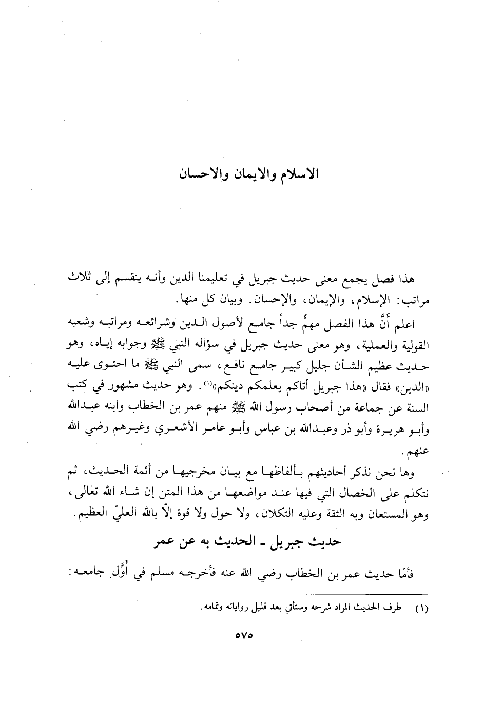 اعْلَمْ أَنَّ هَذَا الْفَصْلَ مُهِمٌّ جِدًّا, جَامِعٌ لِأُصُولِ الدِّينِ وَشَرَائِعِهِ وَمَرَاتِبِهِ وَشُعَبِهِ الْقَوْلِيَّةِ وَالْعَمَلِيَّةِ, وَهُوَ مَعْنَى حَدِيثِ جِبْرِيلَ فِي سُؤَالِهِ النَّبِيَّ -صَلَّى اللَّهُ عَلَيْهِ وَسَلَّمَ- وَجَوَابِهِ إِيَّاهُ, وَهُوَ حَدِيثٌ عَظِيمُ الشَّأْنِ جَلِيلٌ, كَبِيرٌ جَامِعٌ نَافِعٌ, سَمَّى النَّبِيُّ -صَلَّى اللَّهُ عَلَيْهِ وَسَلَّمَ- مَا احْتَوَى عَلَيْهِ "الدِّينَ" فَقَالَ: "هَذَا جِبْرِيلُ أَتَاكُمْ يُعَلِّمُكُمْ دِينَكُمْ" 1. وَهُوَ حَدِيثٌ مَشْهُورٌ فِي كُتُبِ السُّنَّةِ عَنْ جَمَاعَةٍ مِنْ أَصْحَابِ رَسُولِ اللَّهِ -صَلَّى اللَّهُ عَلَيْهِ وَسَلَّمَ- مِنْهُمْ: عُمَرُ بْنُ الْخَطَّابِ وَابْنُهُ عَبْدُ اللَّهِ وَأَبُو هُرَيْرَةَ وَأَبُو ذَرٍّ وَعَبْدُ اللَّهِ بْنُ عَبَّاسٍ وَأَبُو عَامِرٍ الْأَشْعَرِيُّ وَغَيْرُهُمْ رَضِيَ اللَّهُ عَنْهُمْ.